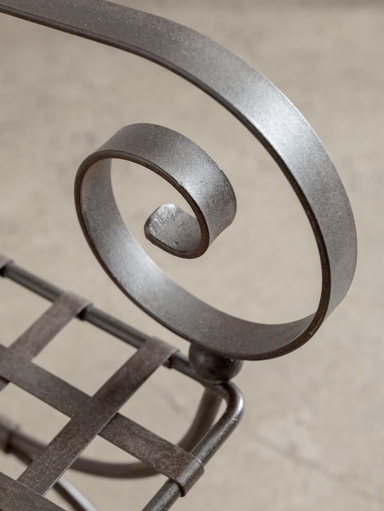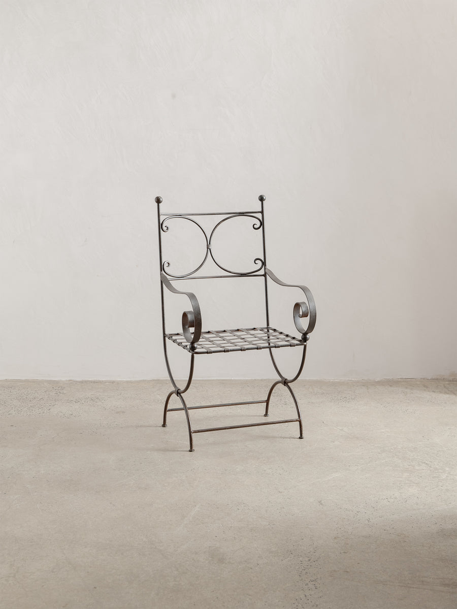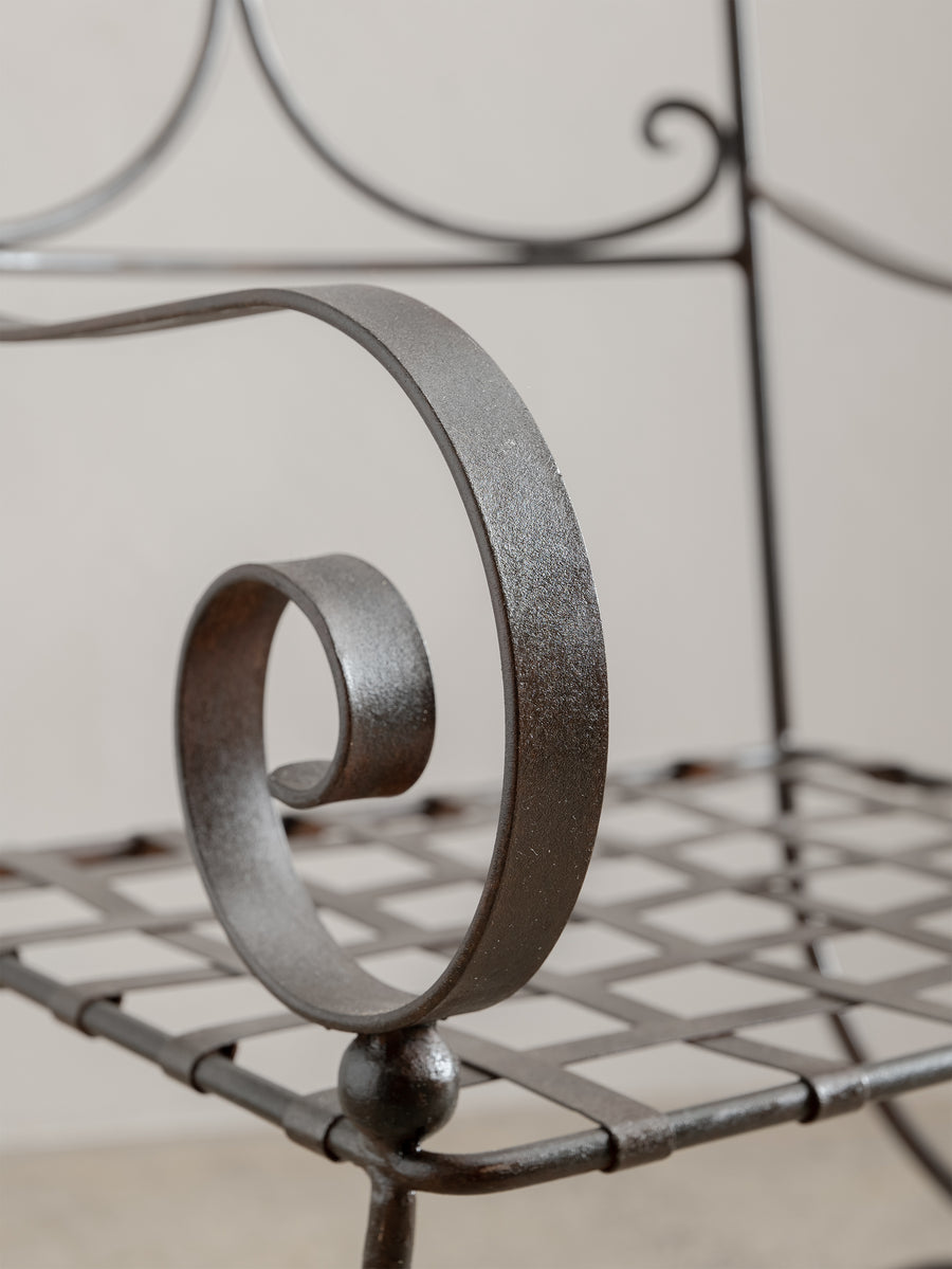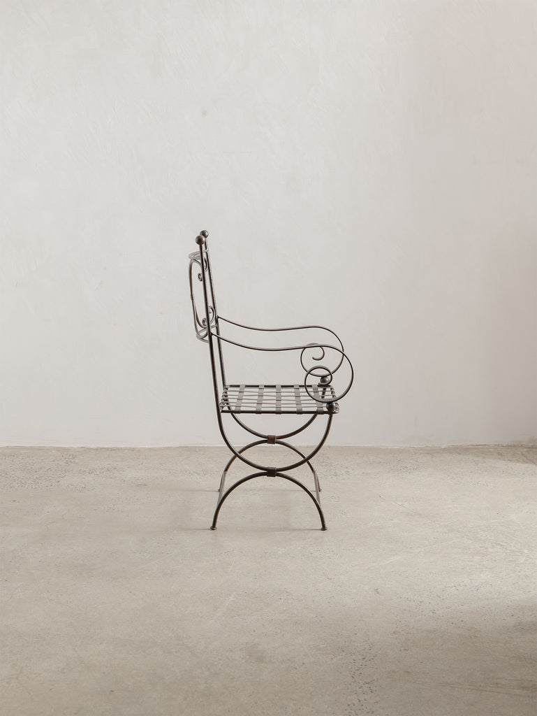 A sculptural iron chair from the 1960s, defined by its elegant scrollwork and refined, architectural form. Crafted in wrought iron with a woven metal seat, it holds a quiet strength and a touch of romanticism, making it as much an object of presence as it is a functional piece.