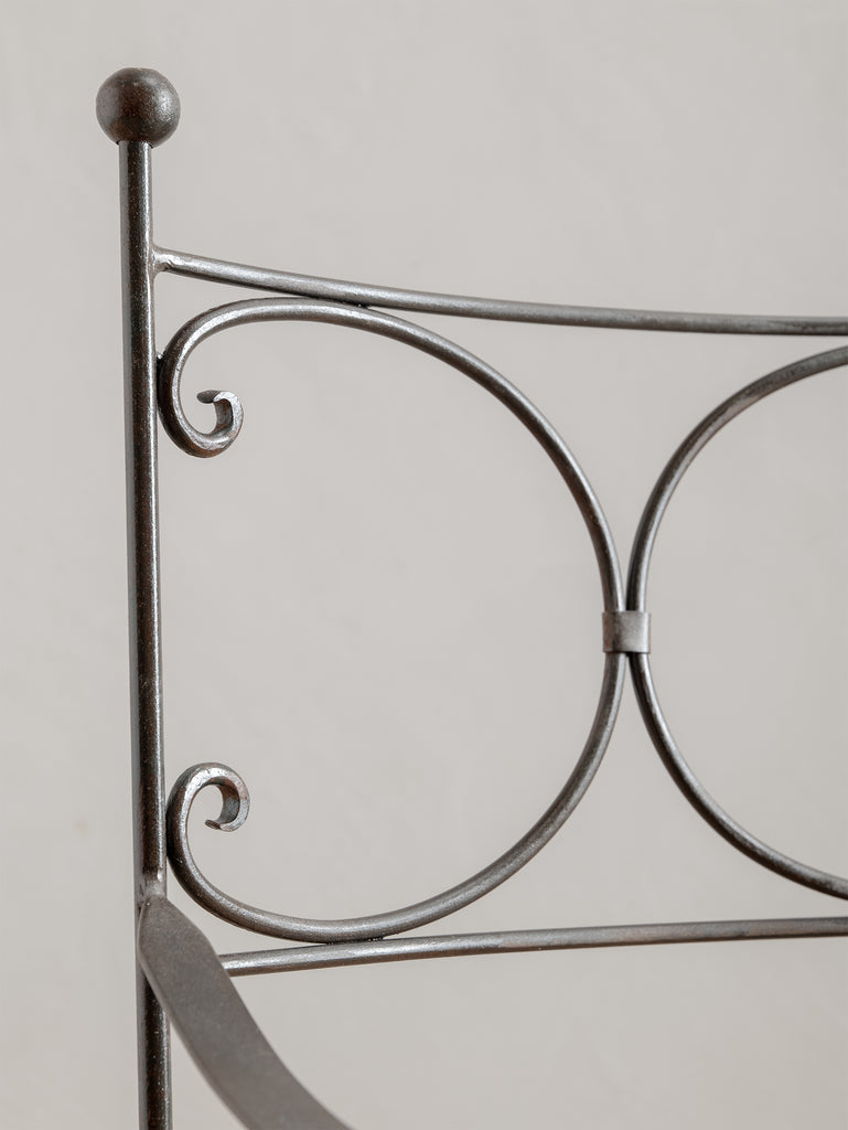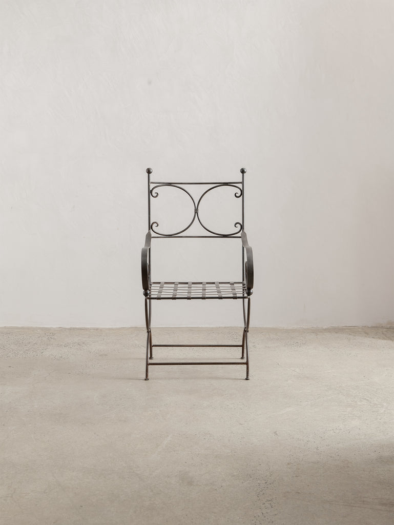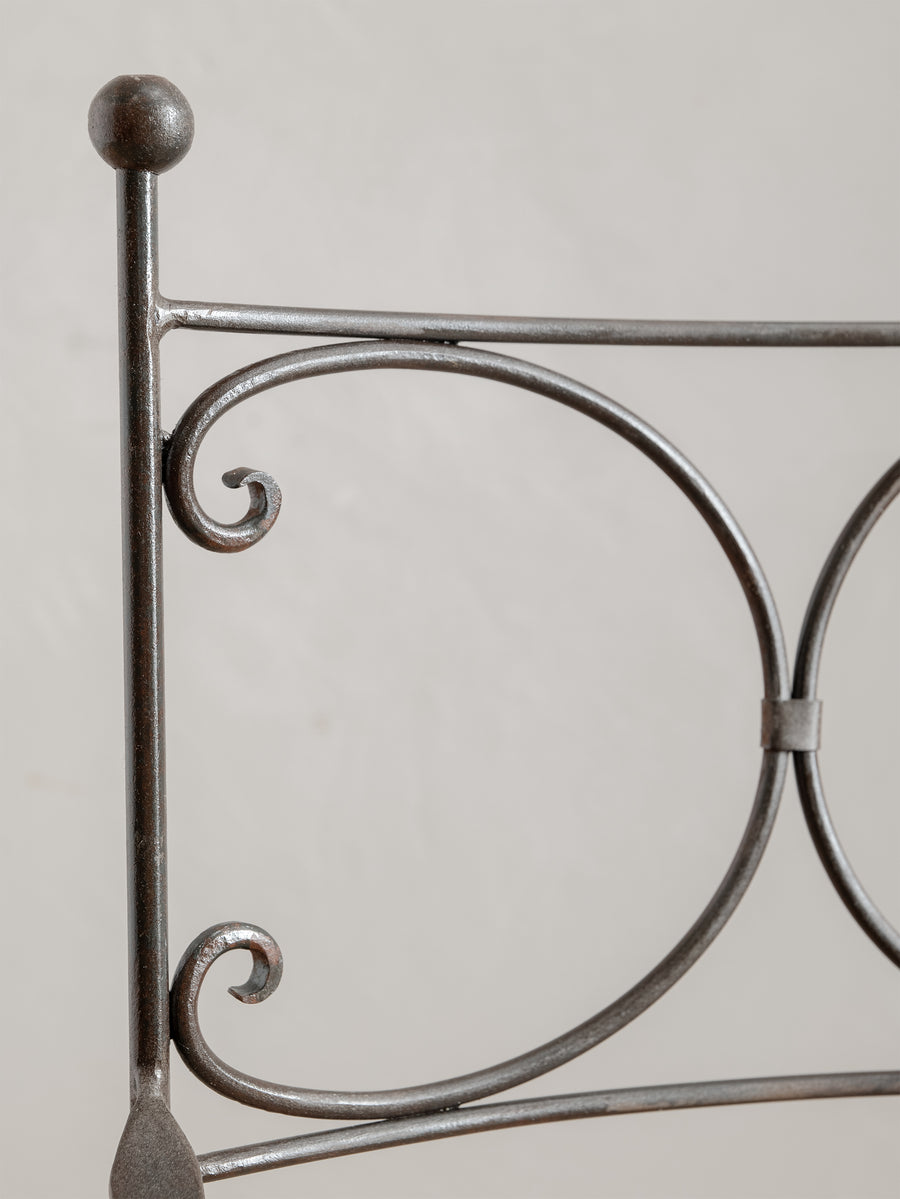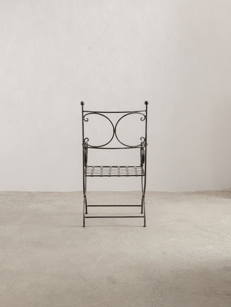 A sculptural iron chair from the 1960s, defined by its elegant scrollwork and refined, architectural form. Crafted in wrought iron with a woven metal seat, it holds a quiet strength and a touch of romanticism, making it as much an object of presence as it is a functional piece.