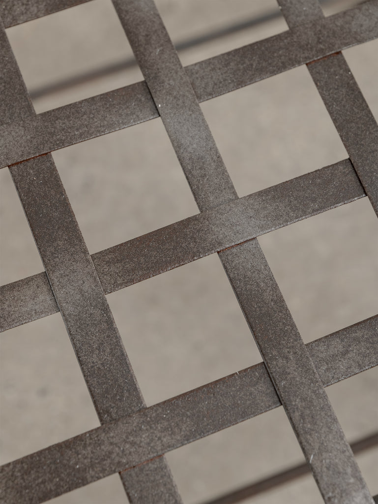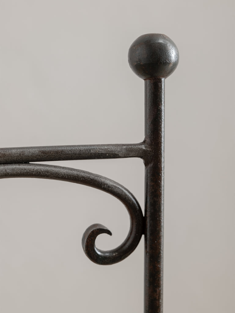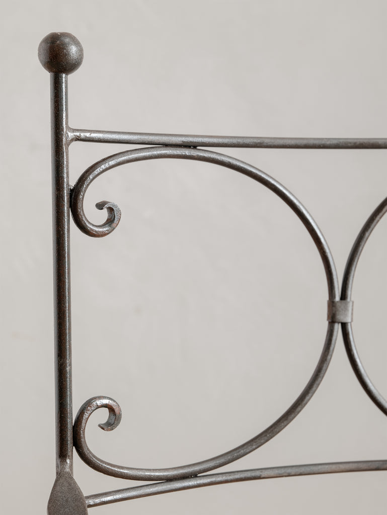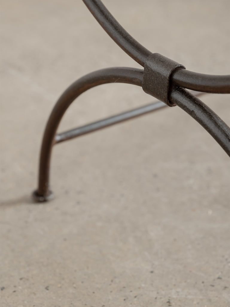 Our iron pieces have been carefully sandblasted to remove rust while preserving their natural patina and character, then sealed with a metal protector. As with all mild steel and iron, weathering will occur over time if exposed to the elements, and occasional maintenance is recommended to preserve its finish.