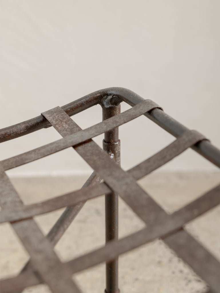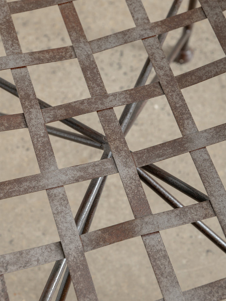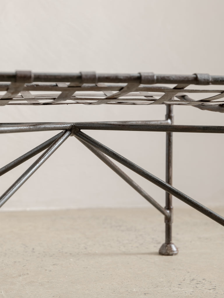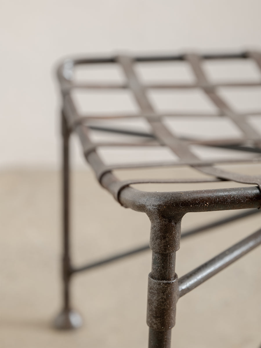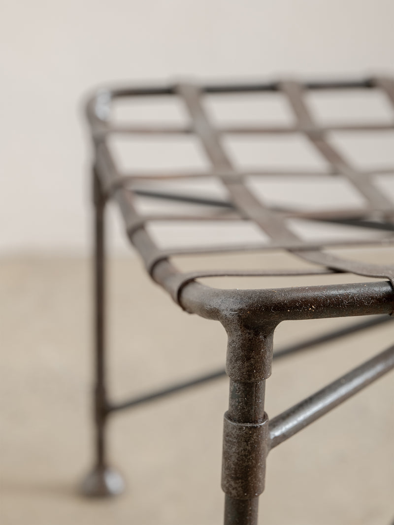 A sculptural wrought iron stool from the 1960s, with a gently curved woven-metal top and finely detailed legs. Light in form yet strong in structure, it carries the quiet presence of hand-forged craftsmanship and the patina of time.