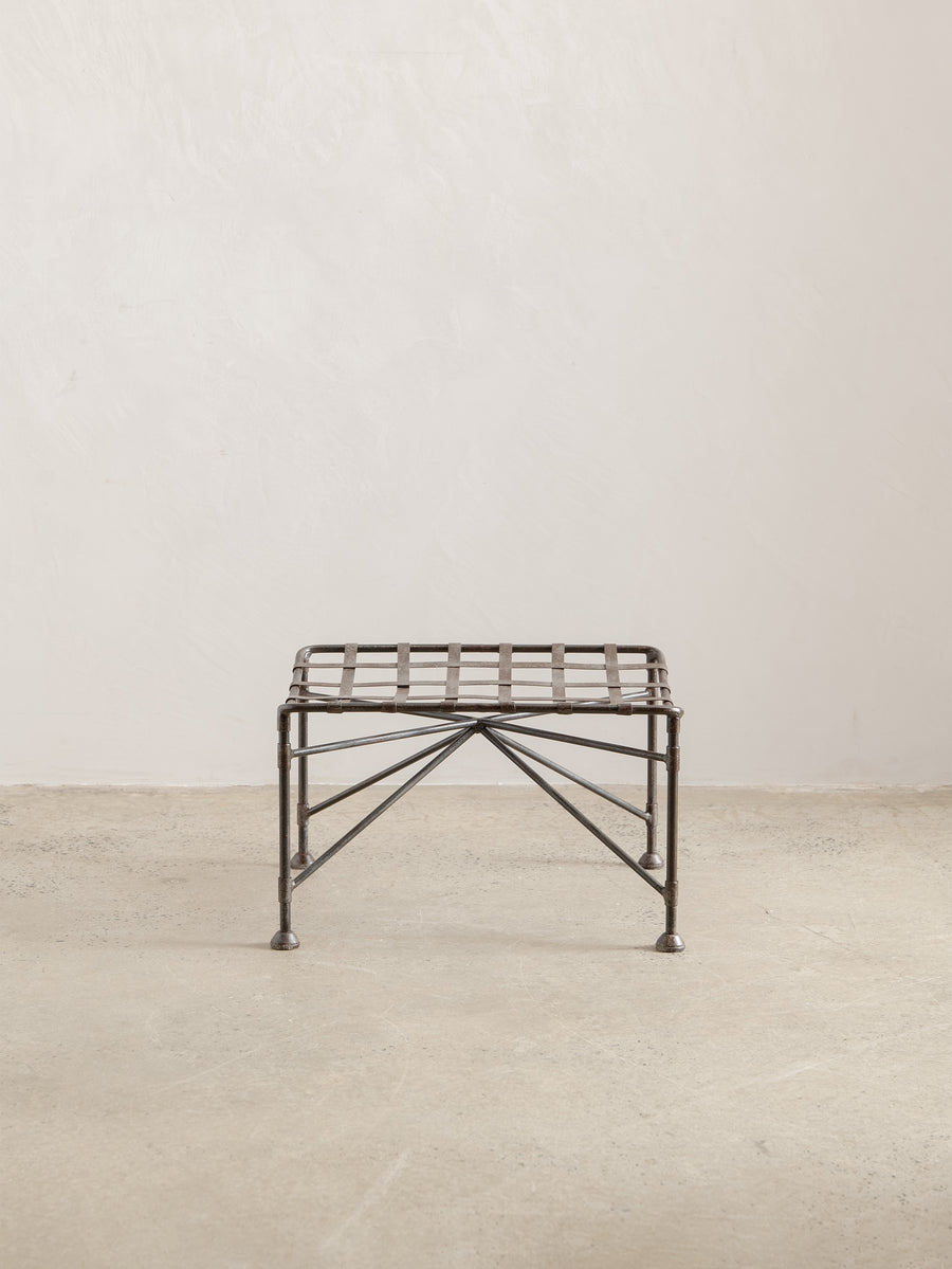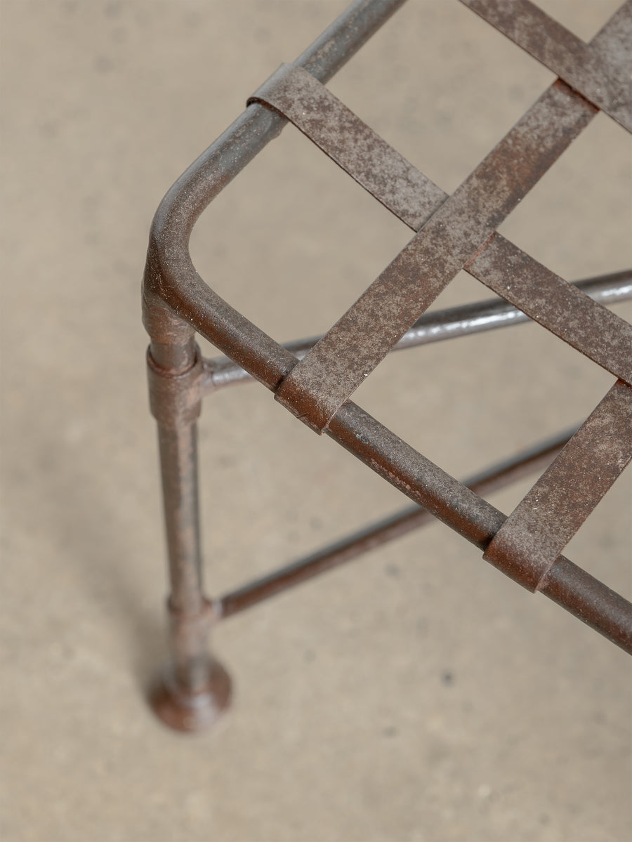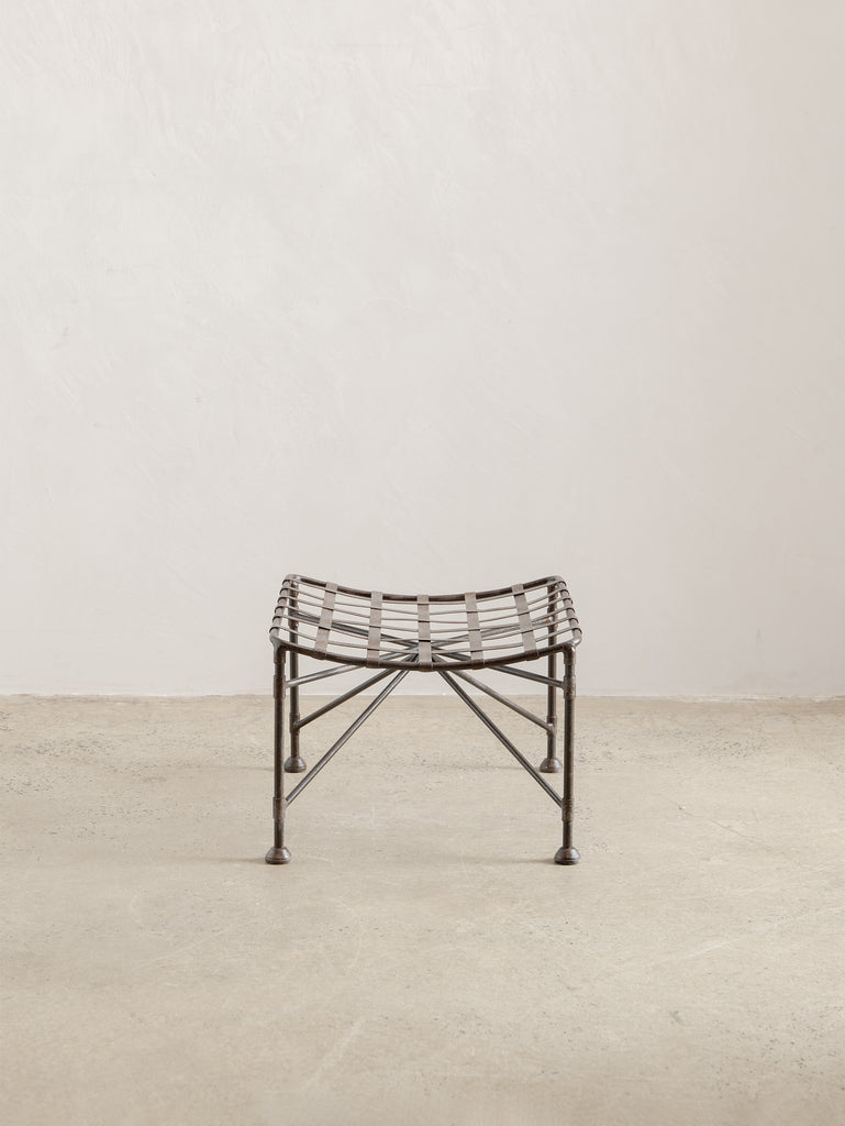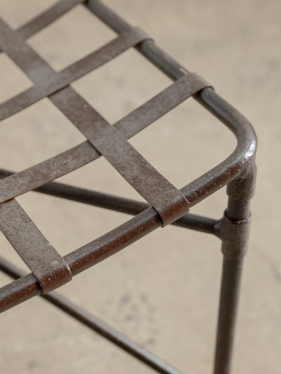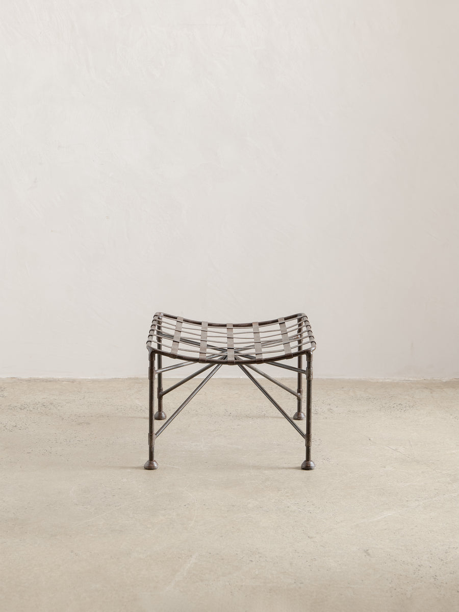 A sculptural wrought iron stool from the 1960s, with a gently curved woven-metal top and finely detailed legs. Light in form yet strong in structure, it carries the quiet presence of hand-forged craftsmanship and the patina of time.