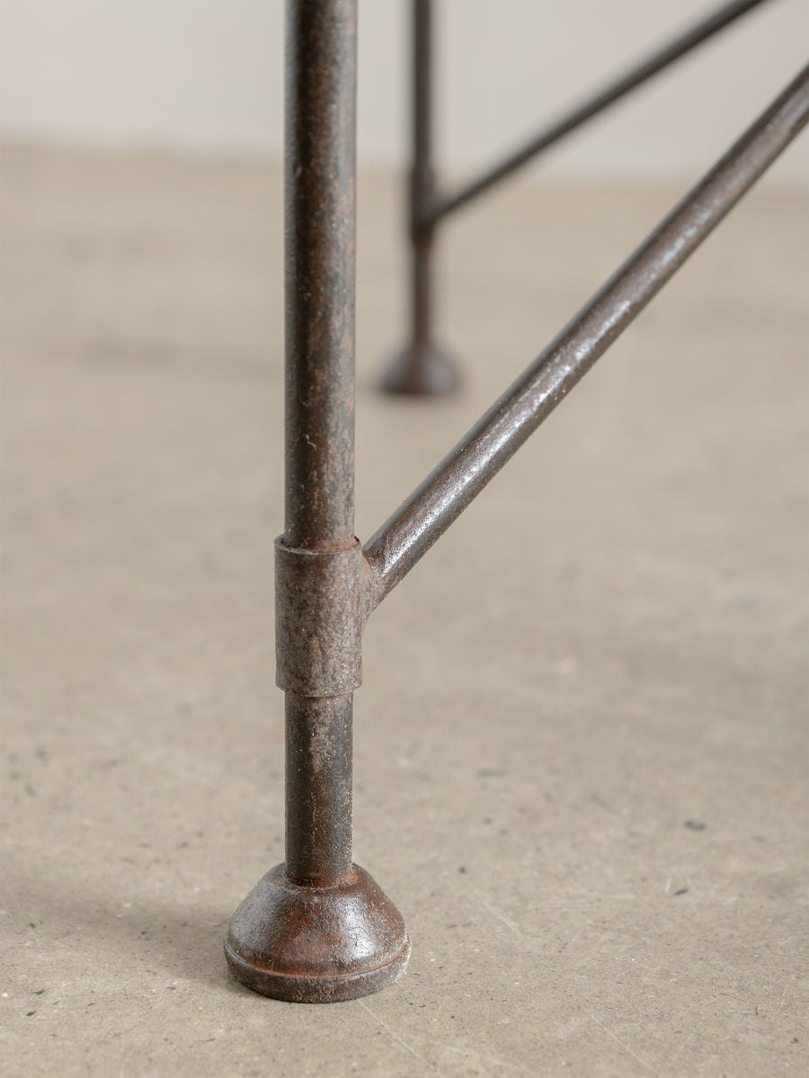 Our iron pieces have been carefully sandblasted to remove rust while preserving their natural character, then sealed with a metal protector. As with all mild steel and iron, weathering will occur over time if exposed to the elements, and occasional maintenance is recommended.