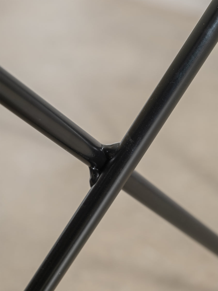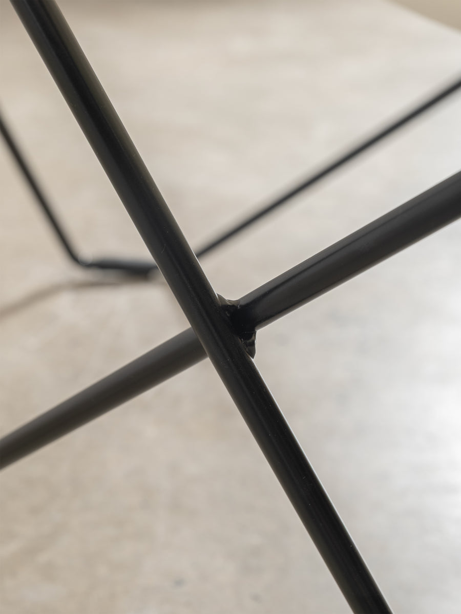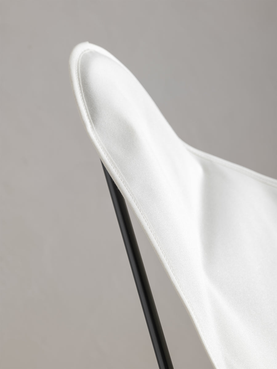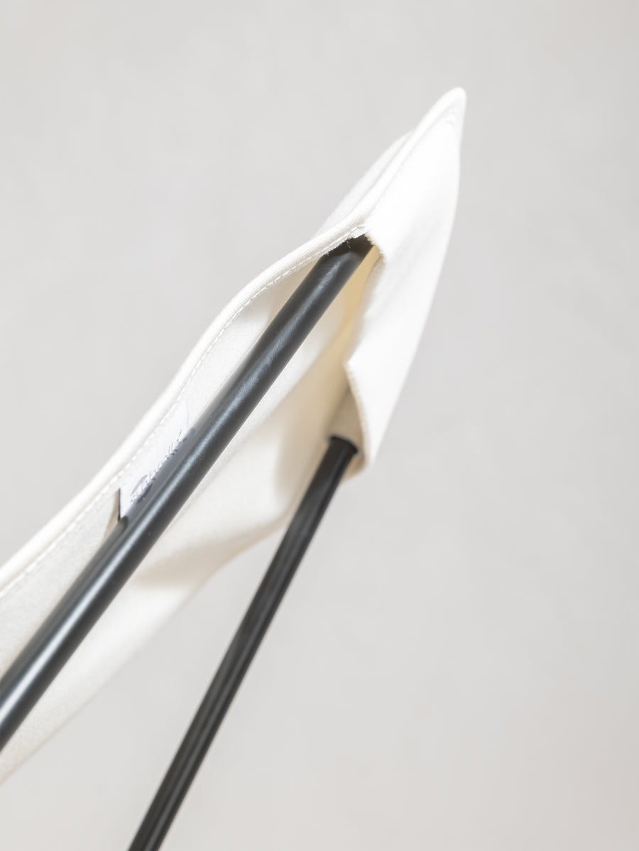Handmade in Sweden, its frame is forged from solid Swedish steel with a rust-resistant zinc undercoat and finished in a durable epoxy paint. The generously oversized seat is upholstered in double-layered Sunbrella Plus® fabric, offering high-performance weather resistance without compromising on comfort or form. Hidden velcro tabs keep the cover taut and secure against the wind, while a discreet drainage opening ensures the seat dries quickly after rainfall.