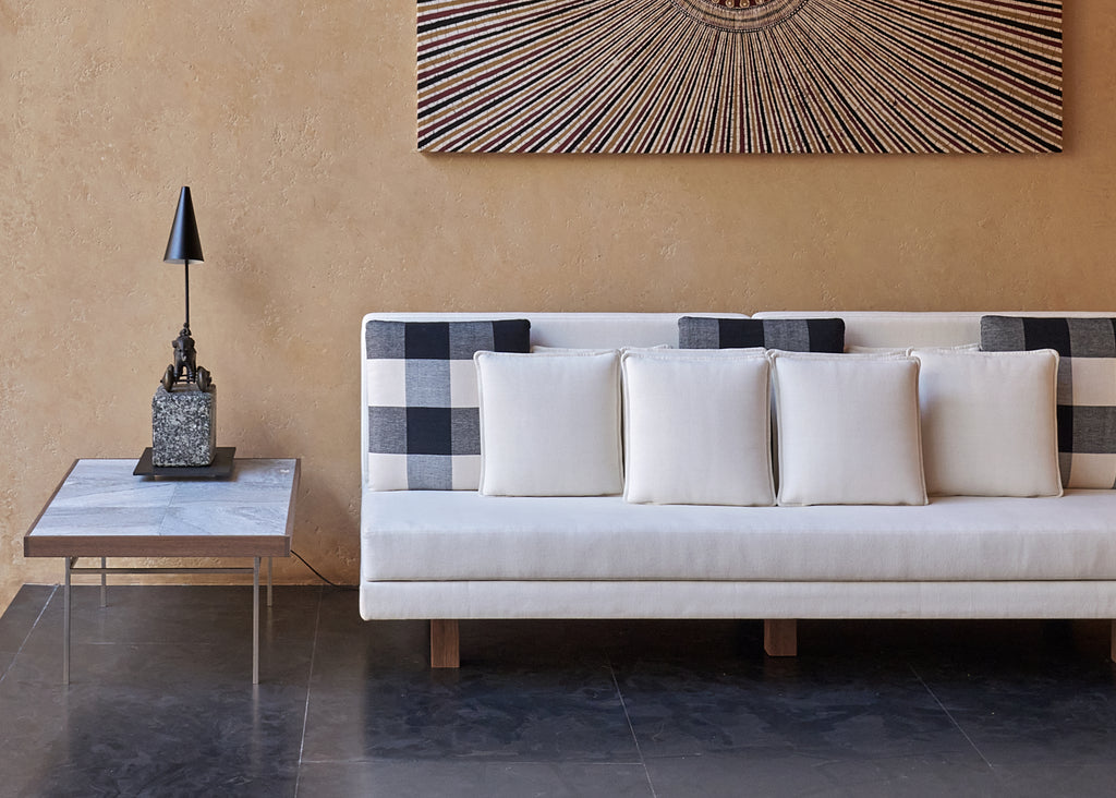 Like with many of Bawa's lamps, the lamp was designed to highlight an artefact placed on the stone base, rather than to just provide light. The lamp at No. 11 has a metal horse figurine placed on the stone. The figuring was was a gift from a client whose house in New Delhi Bawa was designing at the time.