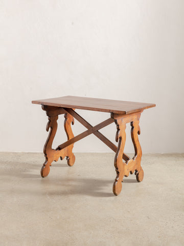 Beautifully crafted from solid pine, this table features a sculptural base with hand-carved detailing and warm honeyed tones that speak to its age. Its proportions make it versatile enough to use as a side, writing, or display table - adding rustic charm and texture to any interior.