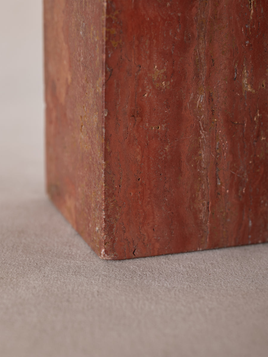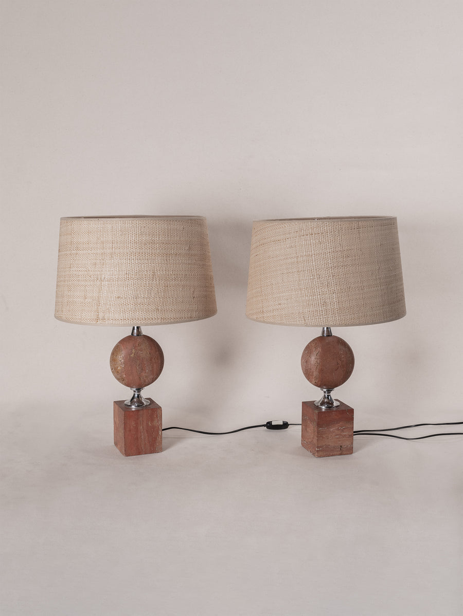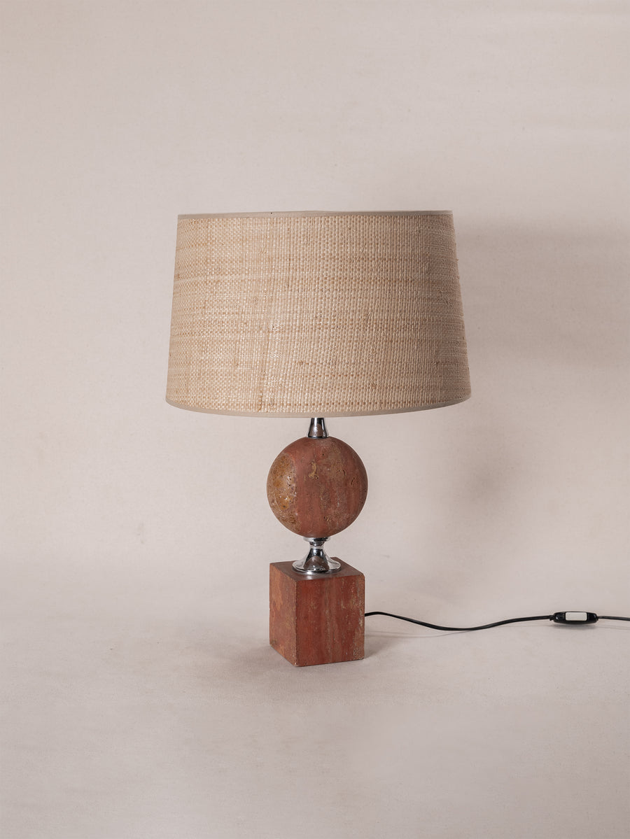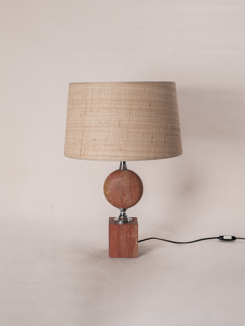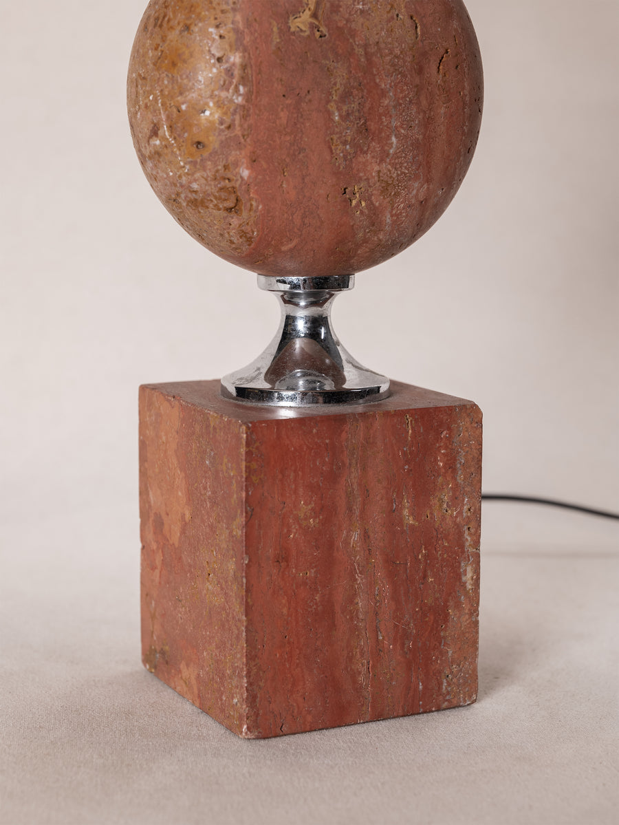 Designed in France during the 1970s by Philippe Barbier, this sculptural table lamp embodies the refined modernism that defined his work. The design features a pink travertine sphere balanced upon a matching cube base, contrasted by polished chrome detailing that lends a subtle graphic edge.