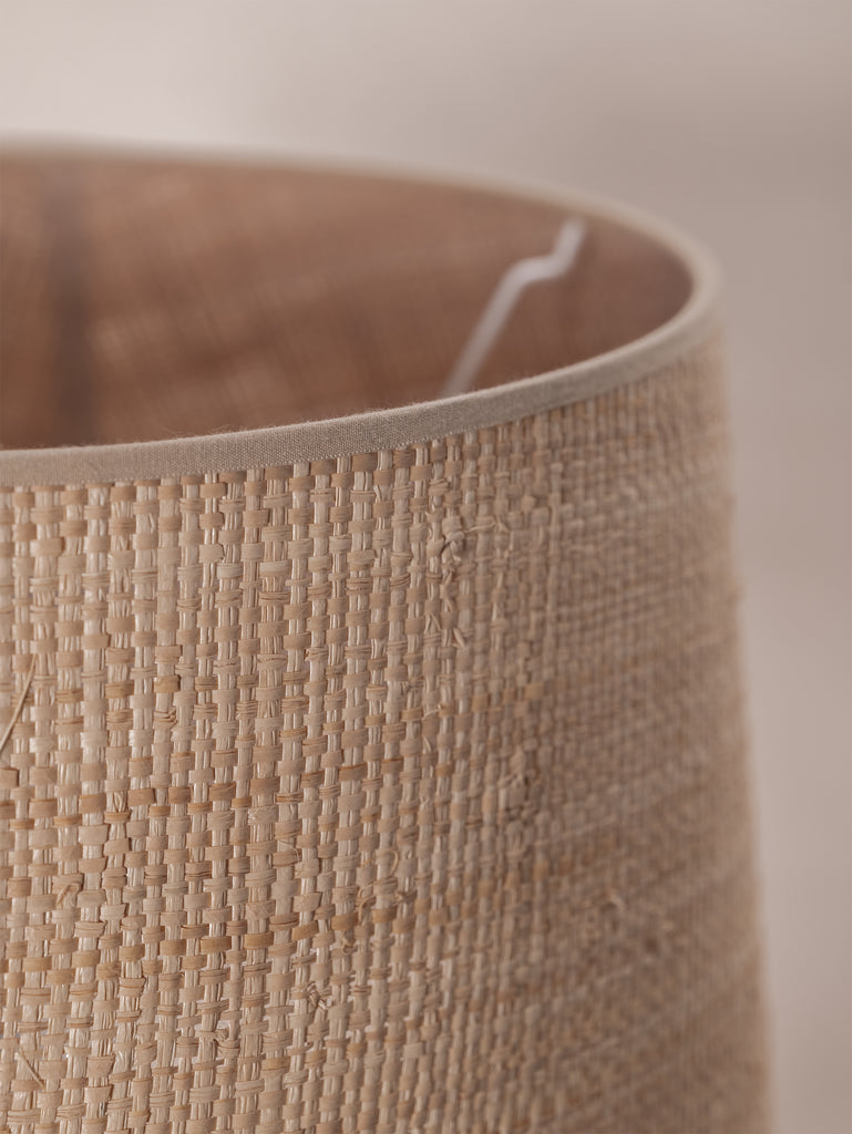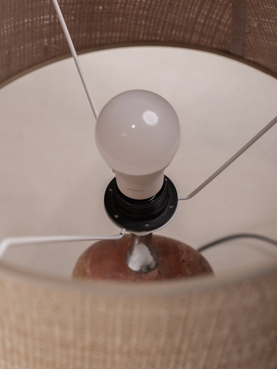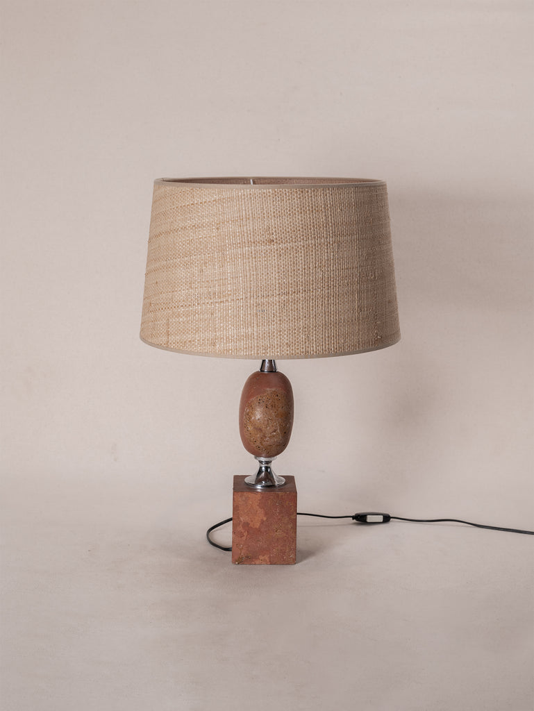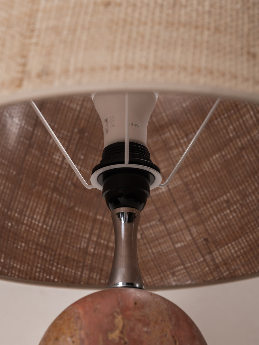 Its natural stone surface reveals soft tonal variations in blush and sand, while the woven shade diffuses a warm, ambient glow - an elegant interplay between organic materiality and geometric form.