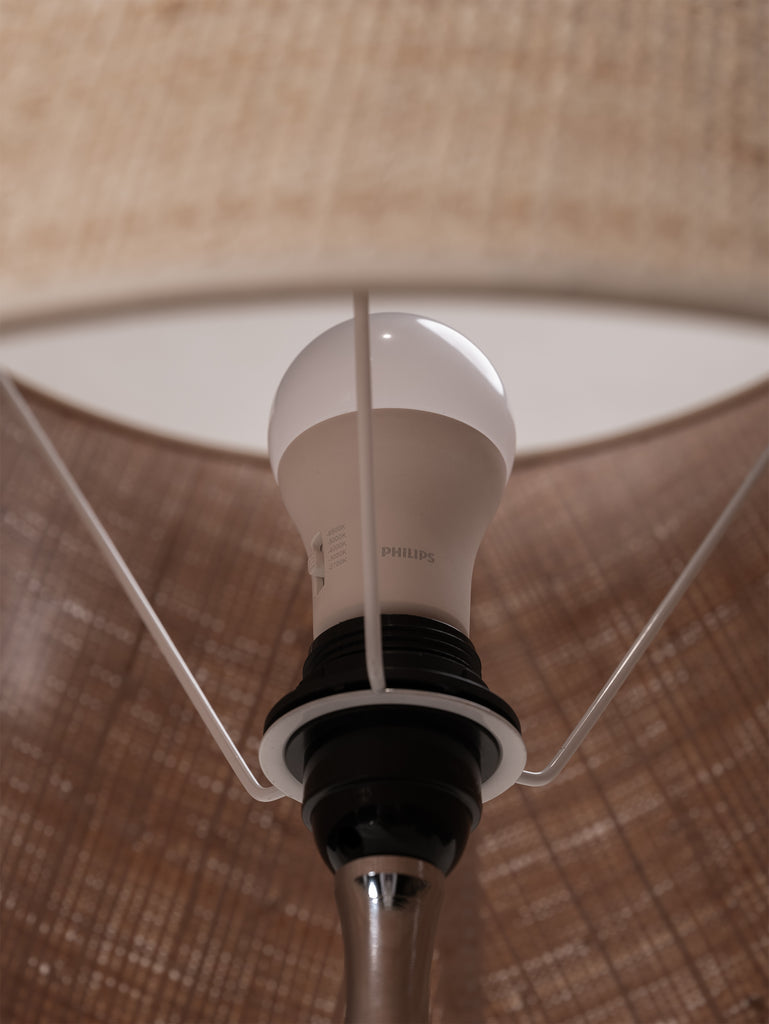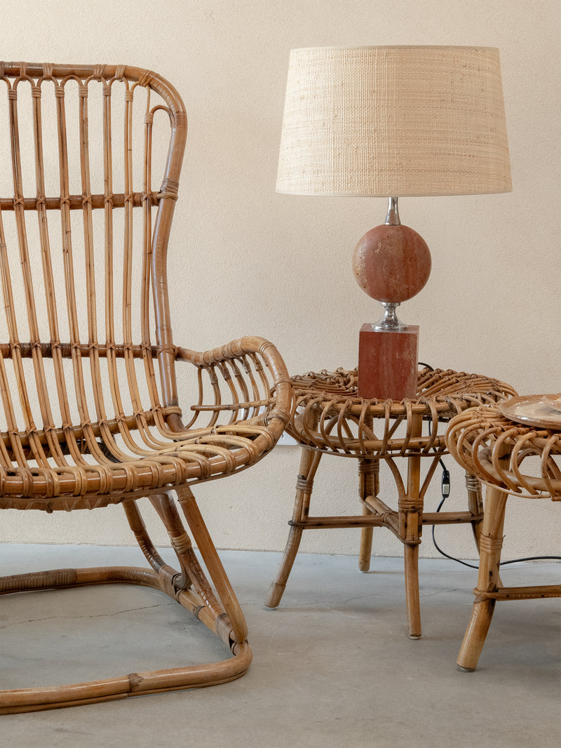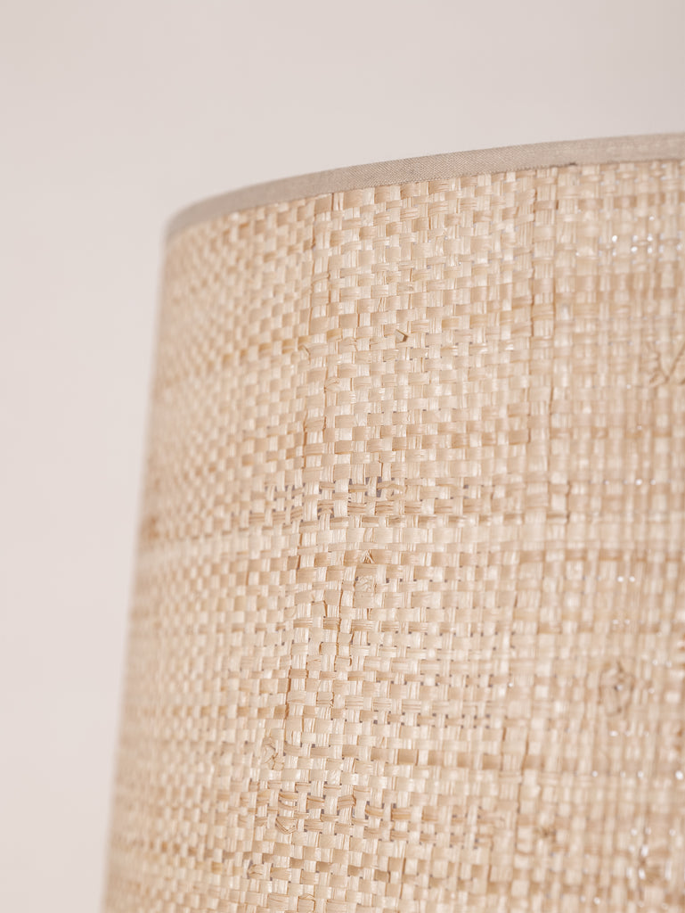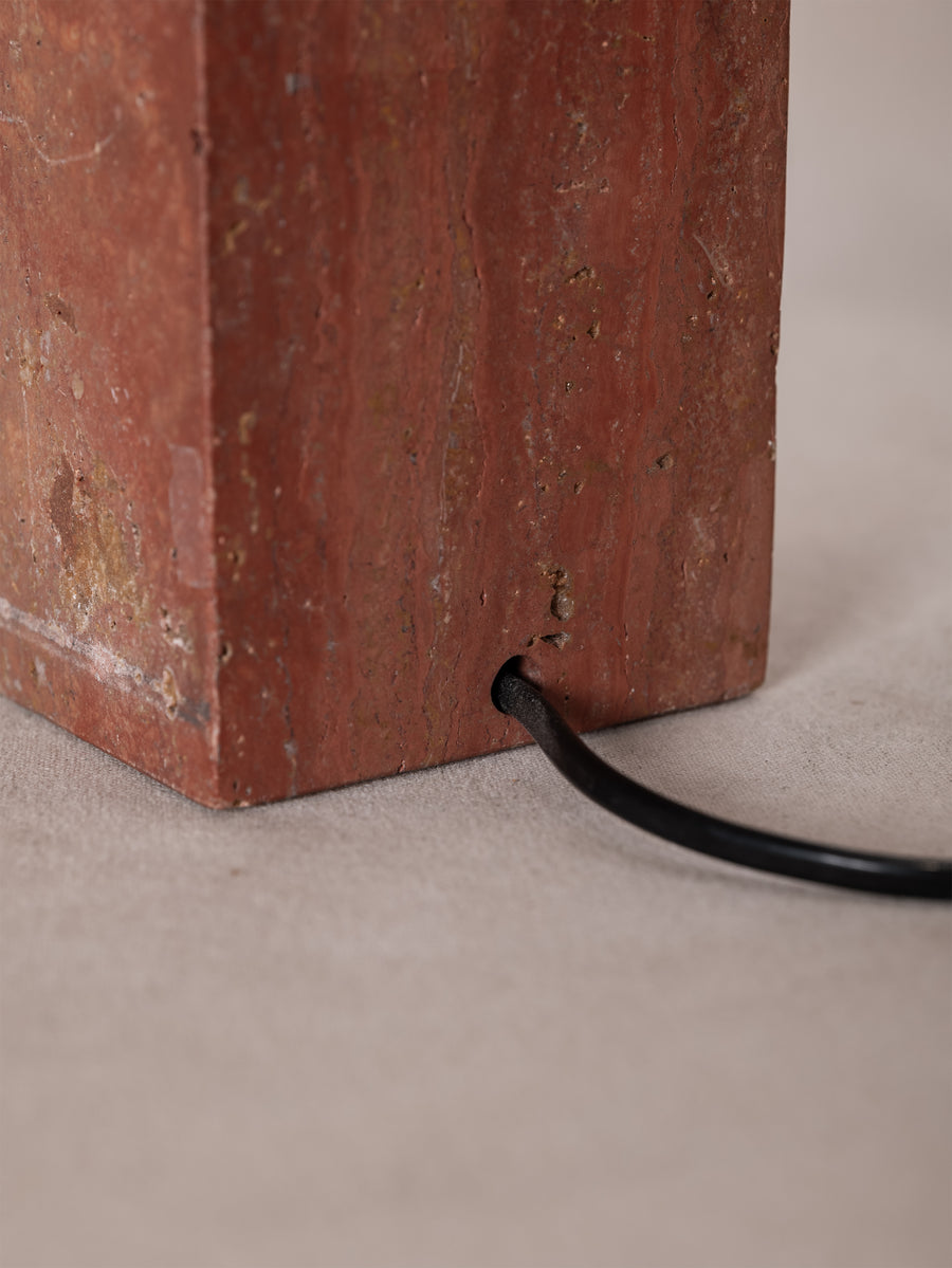 Its natural stone surface reveals soft tonal variations in blush and sand, while the woven shade diffuses a warm, ambient glow - an elegant interplay between organic materiality and geometric form.