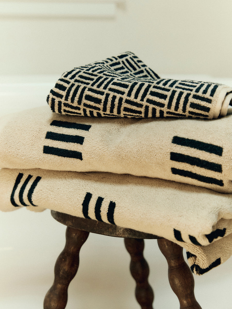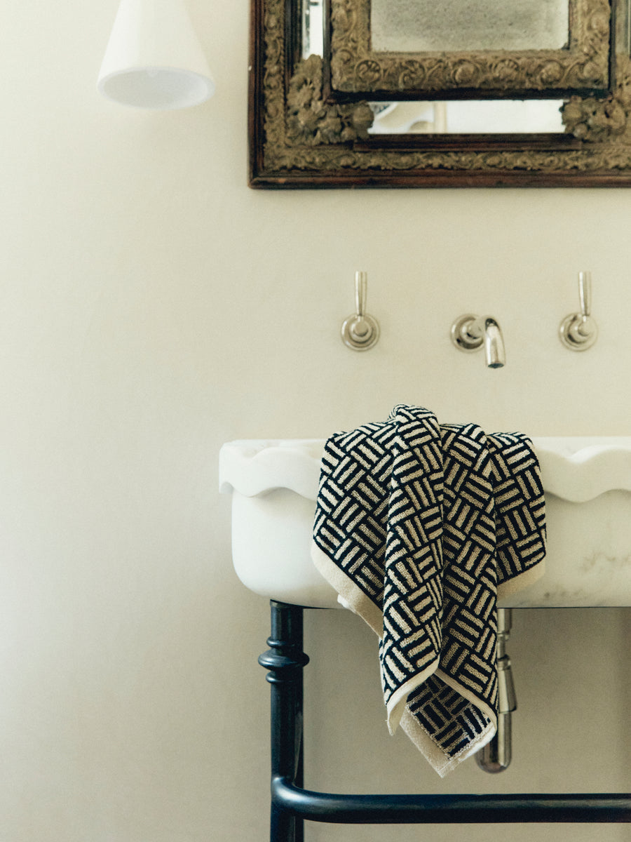 Conveying a sense of modernity sink side, the Torrens Hand Towel features a geometric weave print inspired by the rhythmic repetition seen in Art Deco tiling. Crafted from 100% organic cotton.