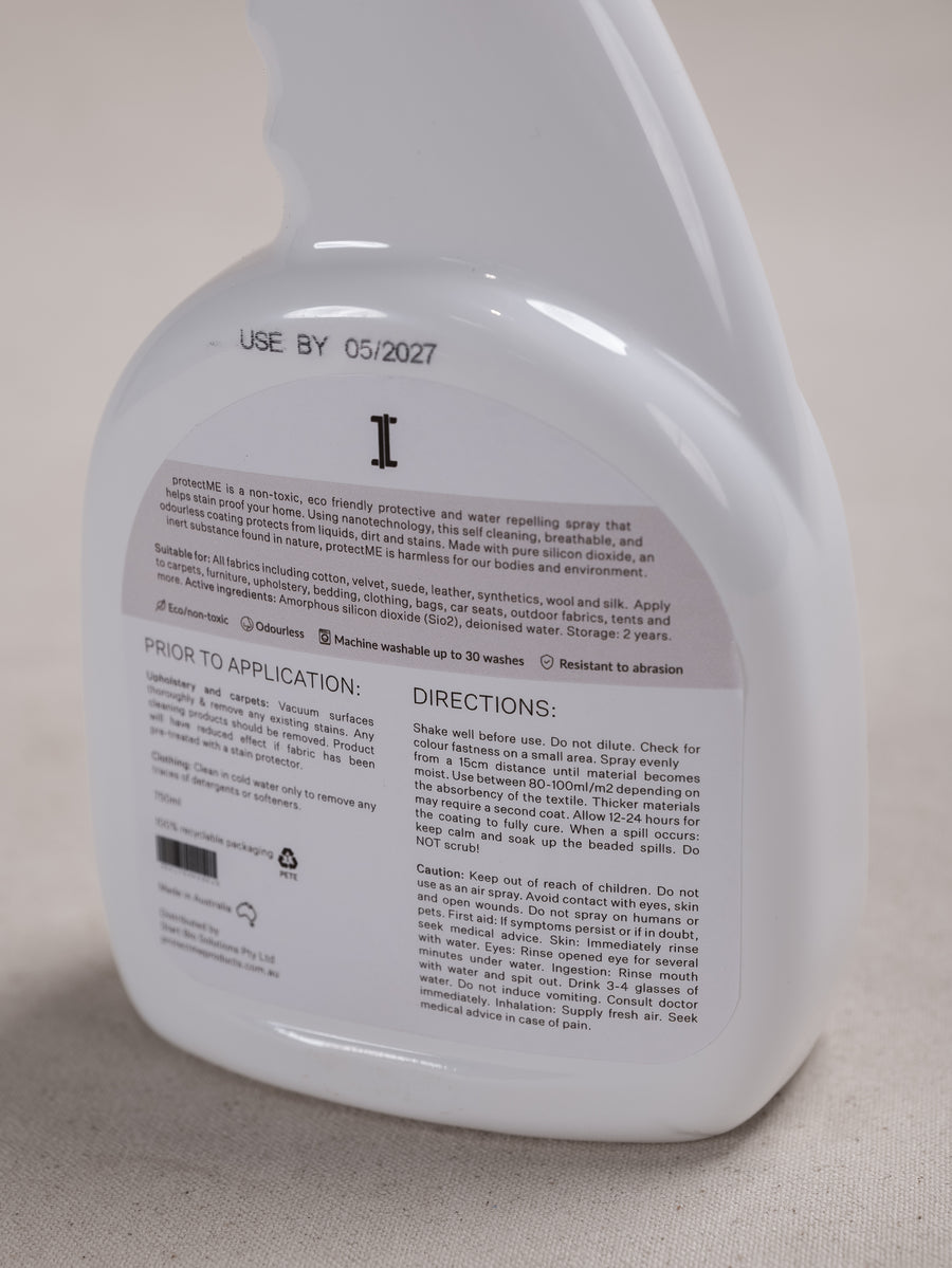 ProtectME is a non-toxic, eco-friendly protective and water repelling spray that helps stain proof your home. Using nanotechnology, this self cleaning, breathable, and odourless coating protects from liquids, dirt and stains. Made with pure silicon dioxide, an inert substance found in nature, protectME is harmless for our bodies and environment.