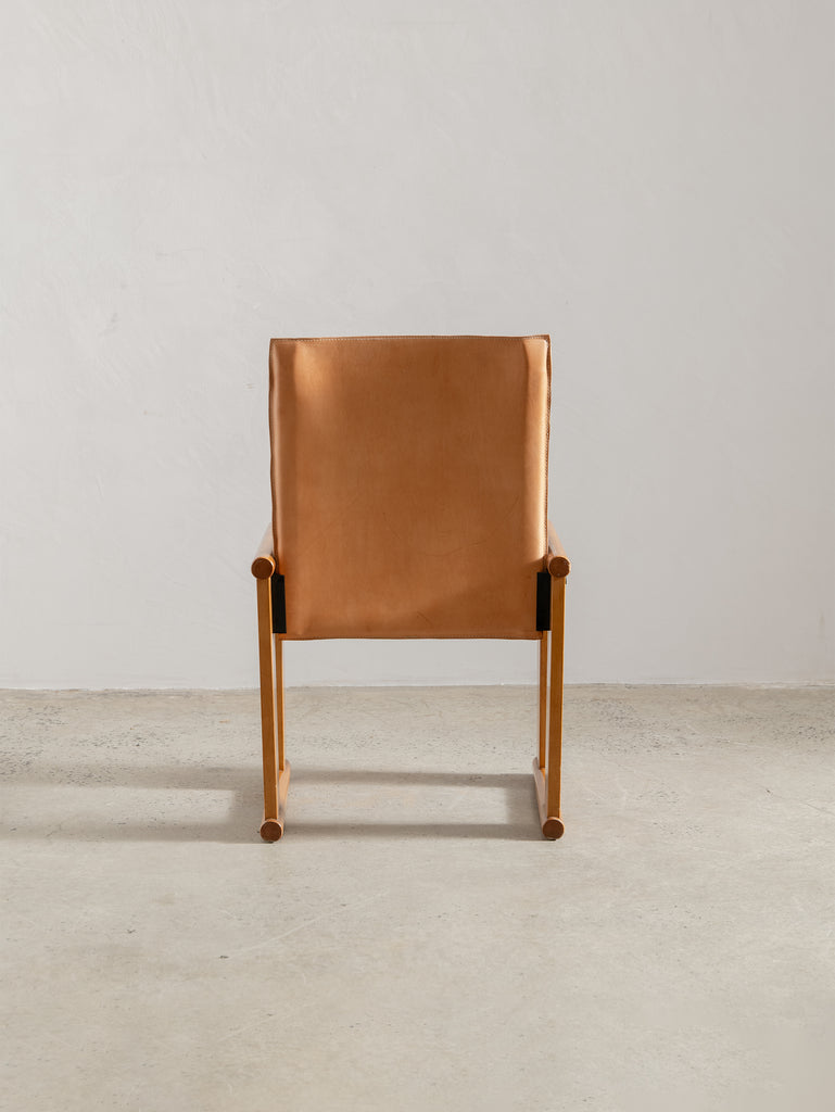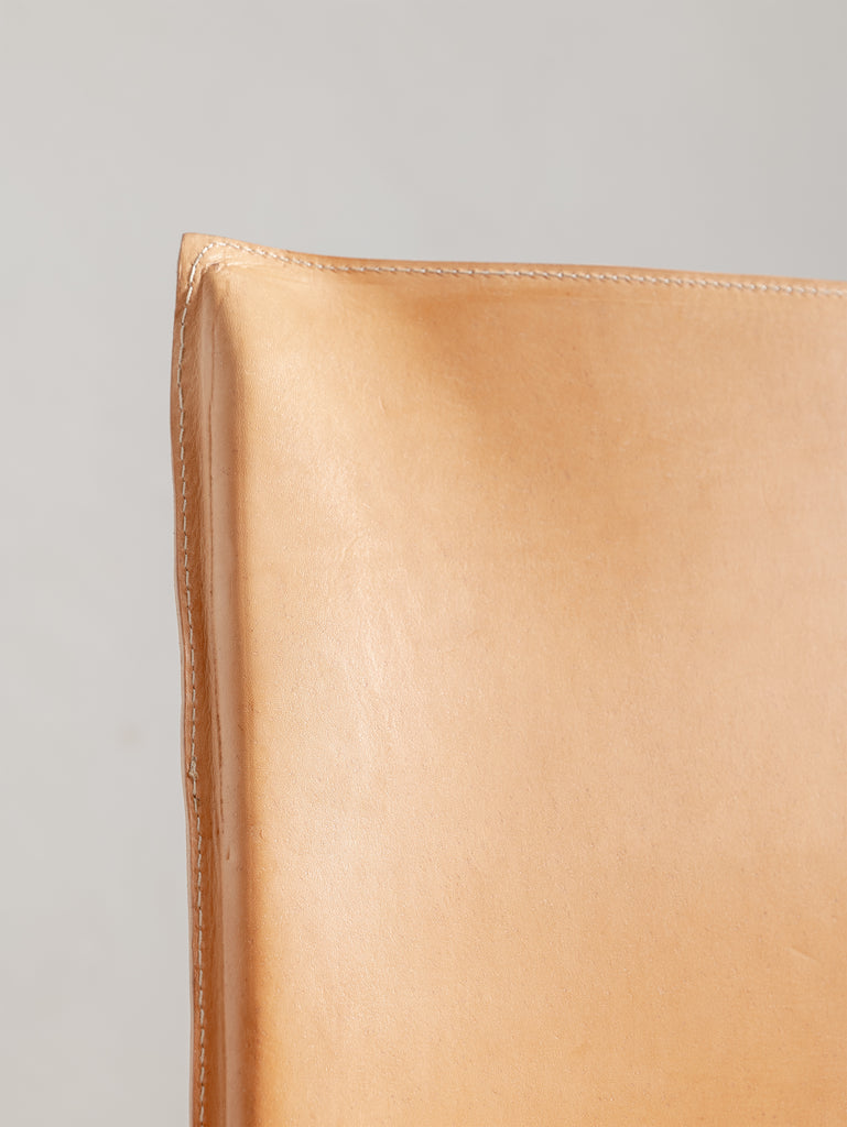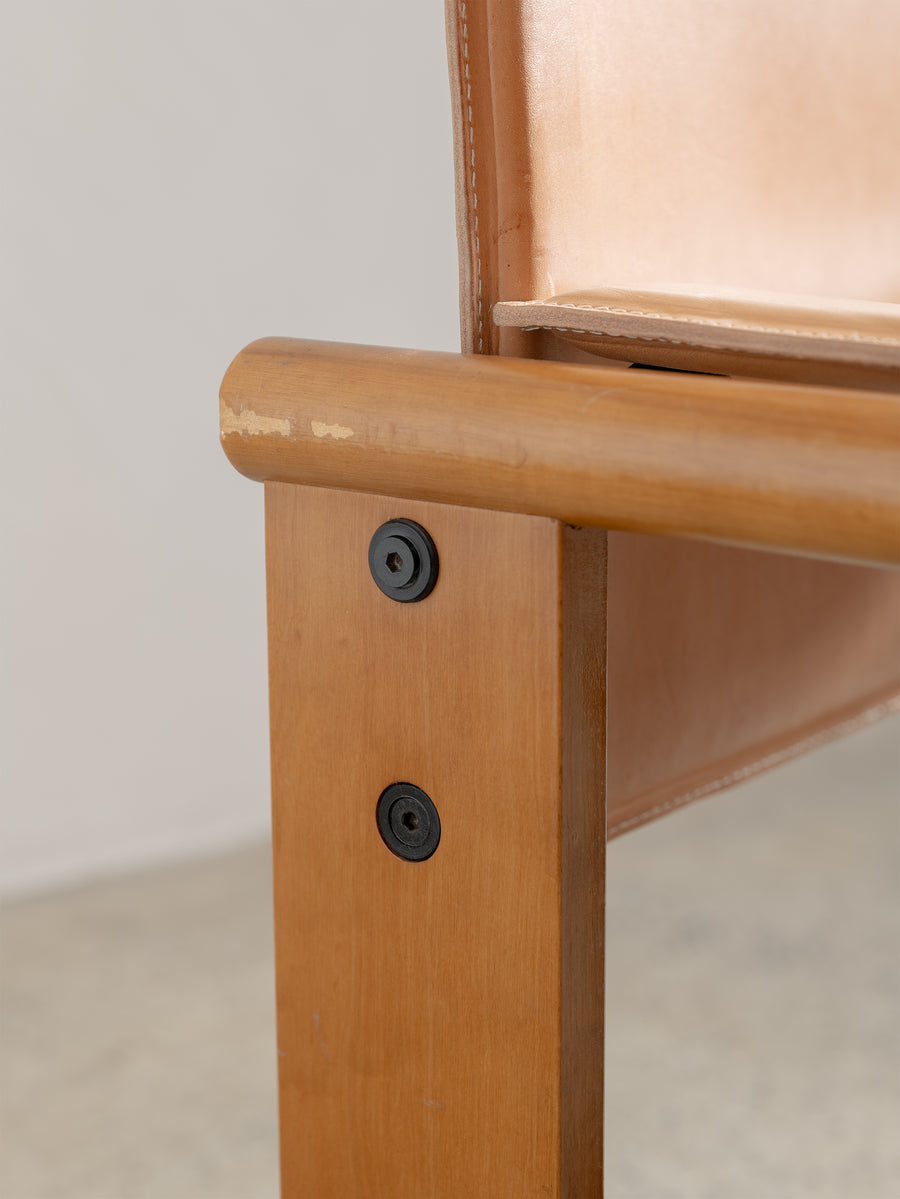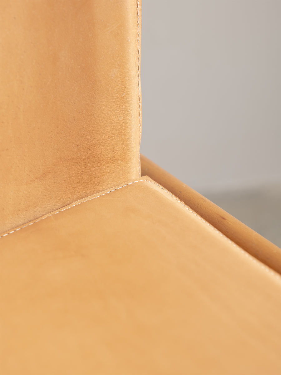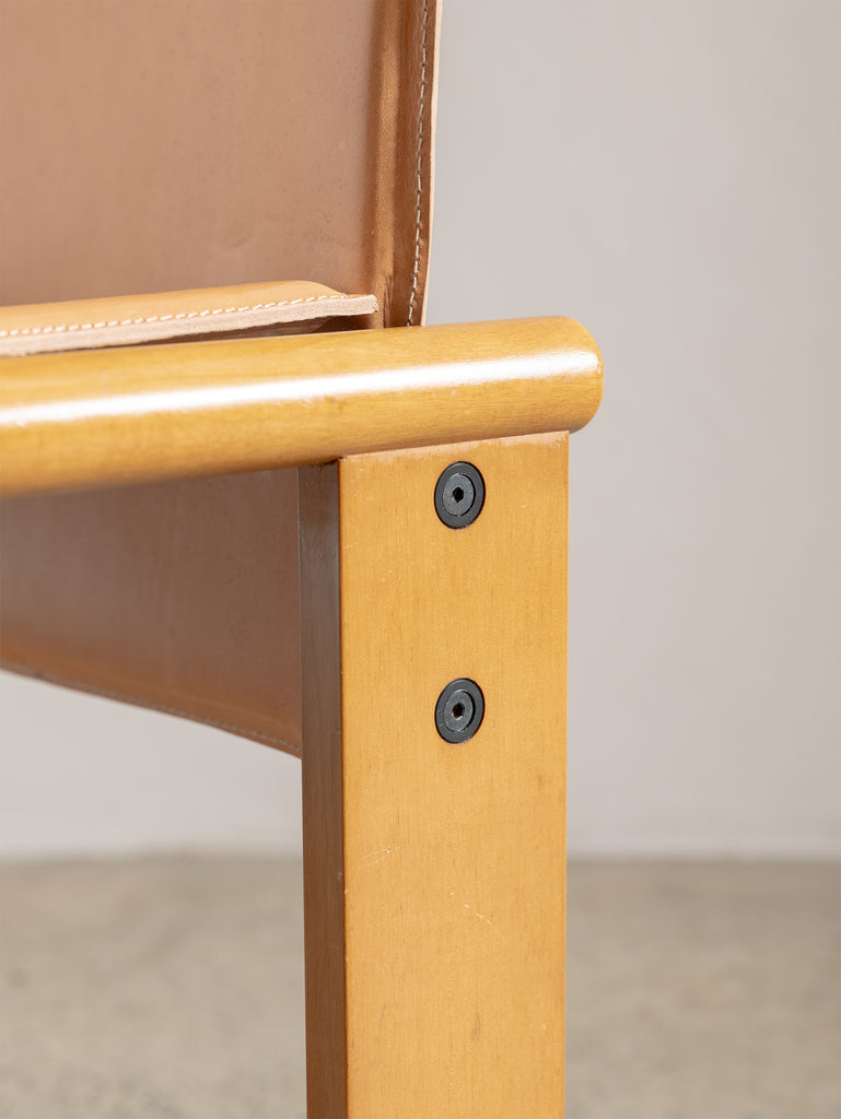An emblem of Italian modernism, this chair showcases the Scarpas’ masterful balance between structure and sculpture. Its design is defined by two solid timber trestles joined with exposed burnished steel bolts - an expression of material and form. The newly upholstered seat and back in supple tan leather highlight the refined craftsmanship and architectural precision for which the Scarpas are renowned.
