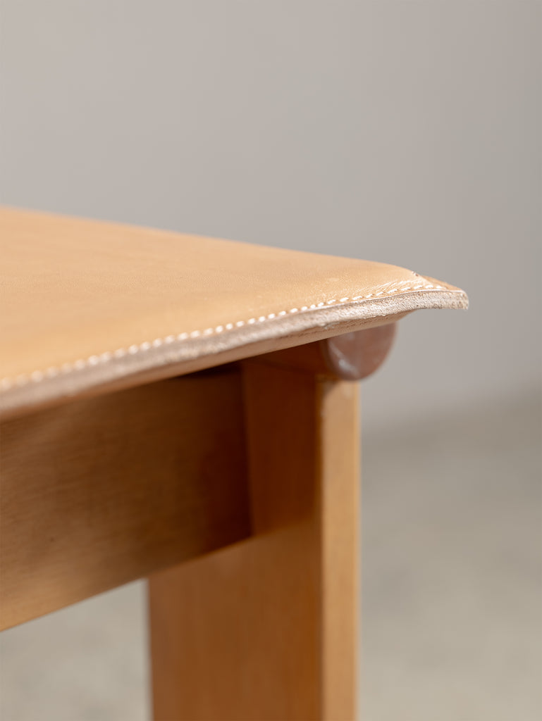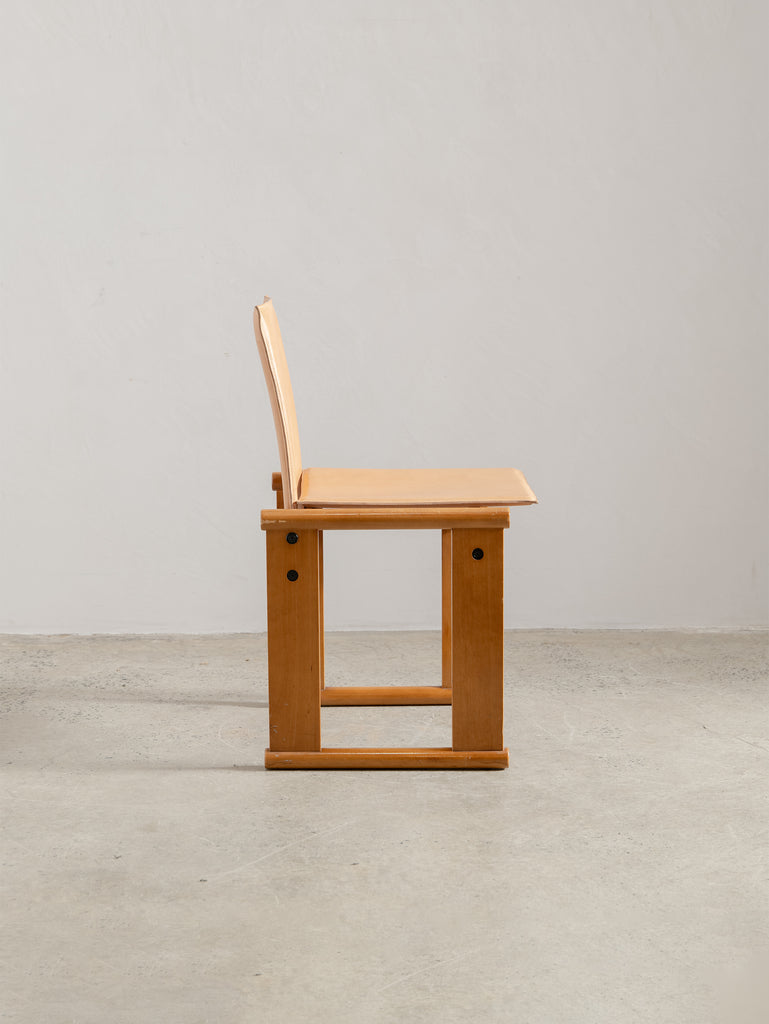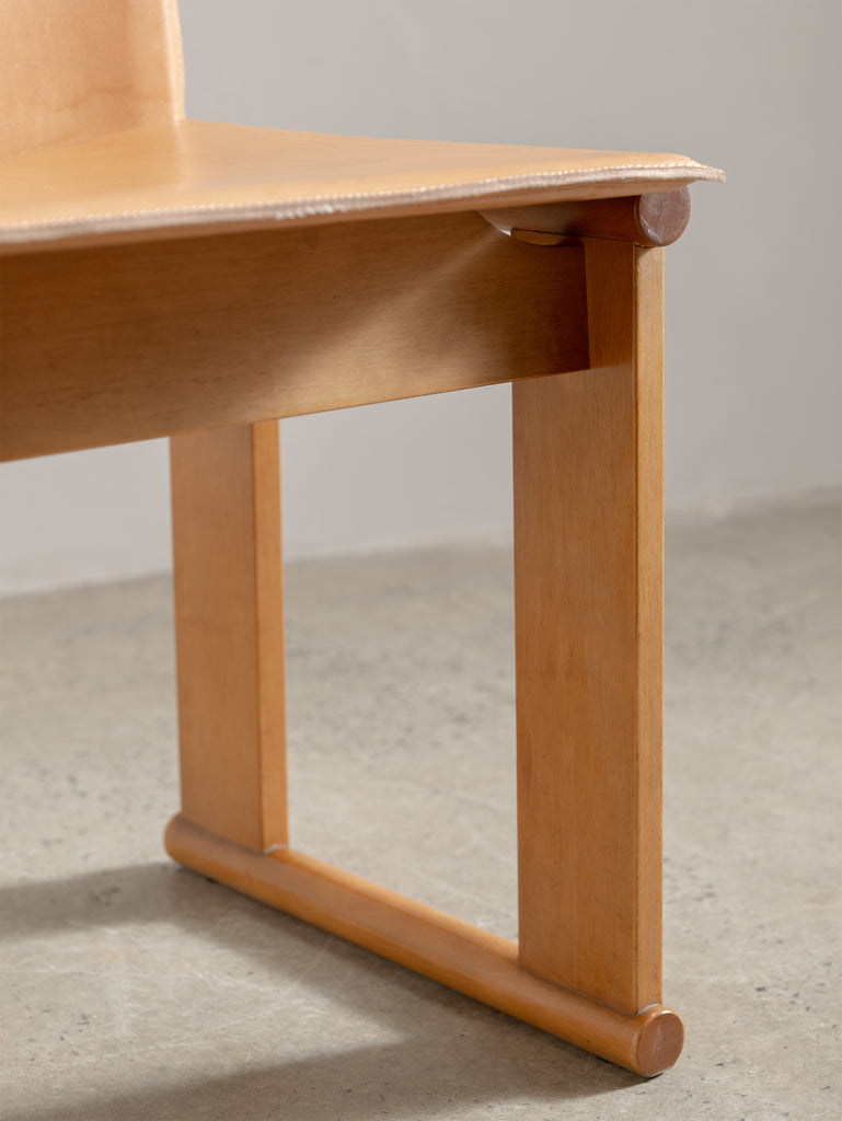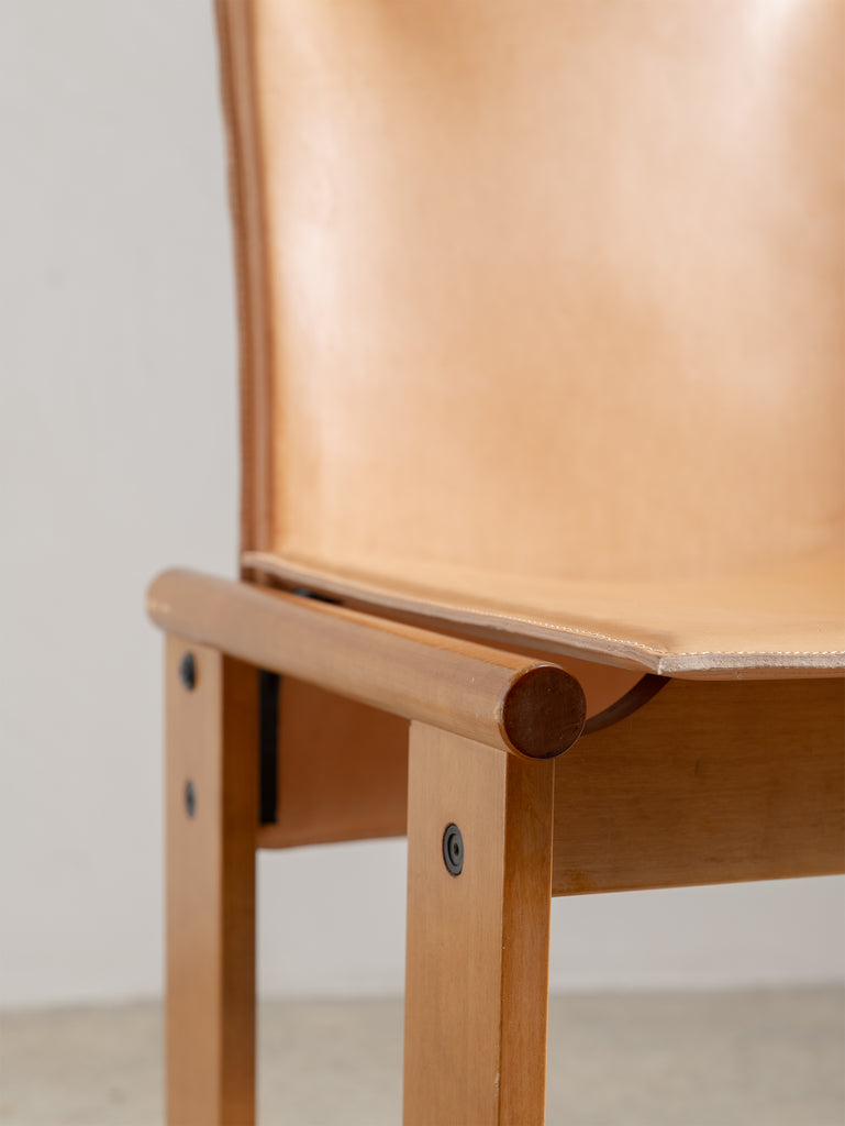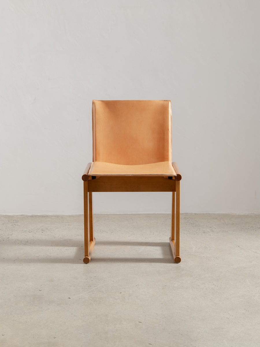 An emblem of Italian modernism, this chair showcases the Scarpas’ masterful balance between structure and sculpture. Its design is defined by two solid timber trestles joined with exposed burnished steel bolts - an expression of material and form. The newly upholstered seat and back in supple tan leather highlight the refined craftsmanship and architectural precision for which the Scarpas are renowned.