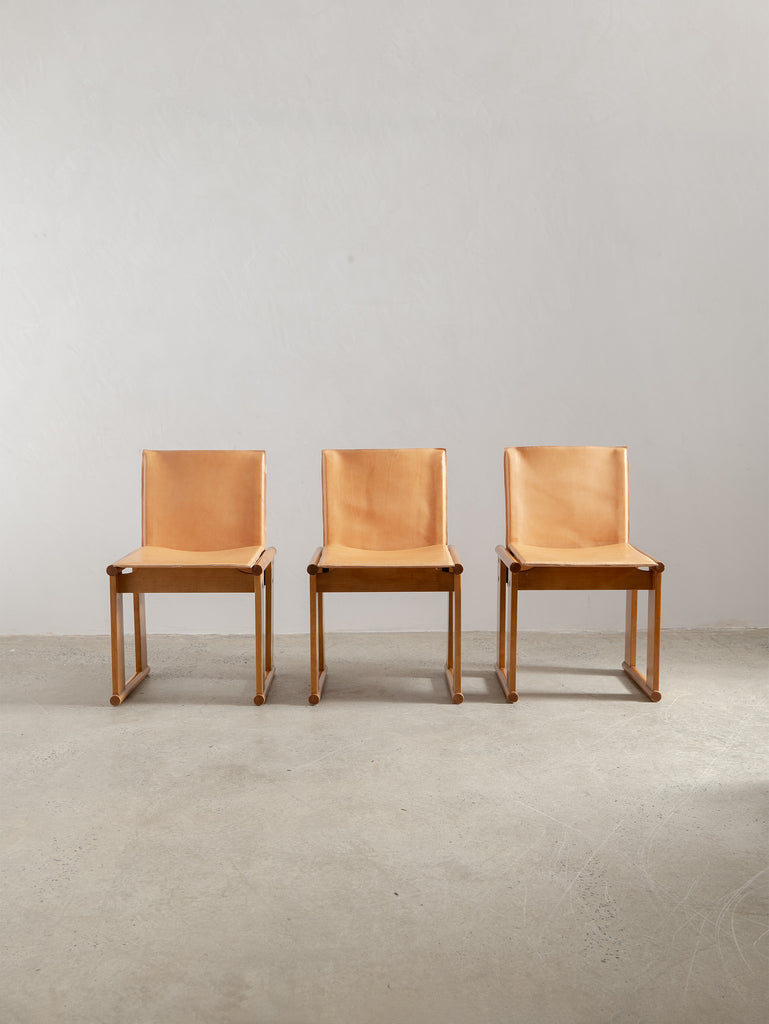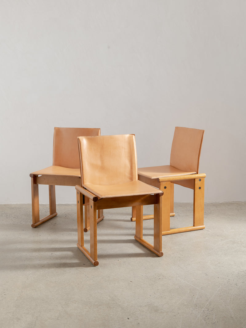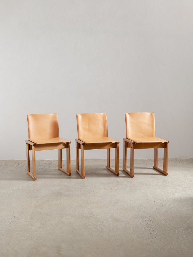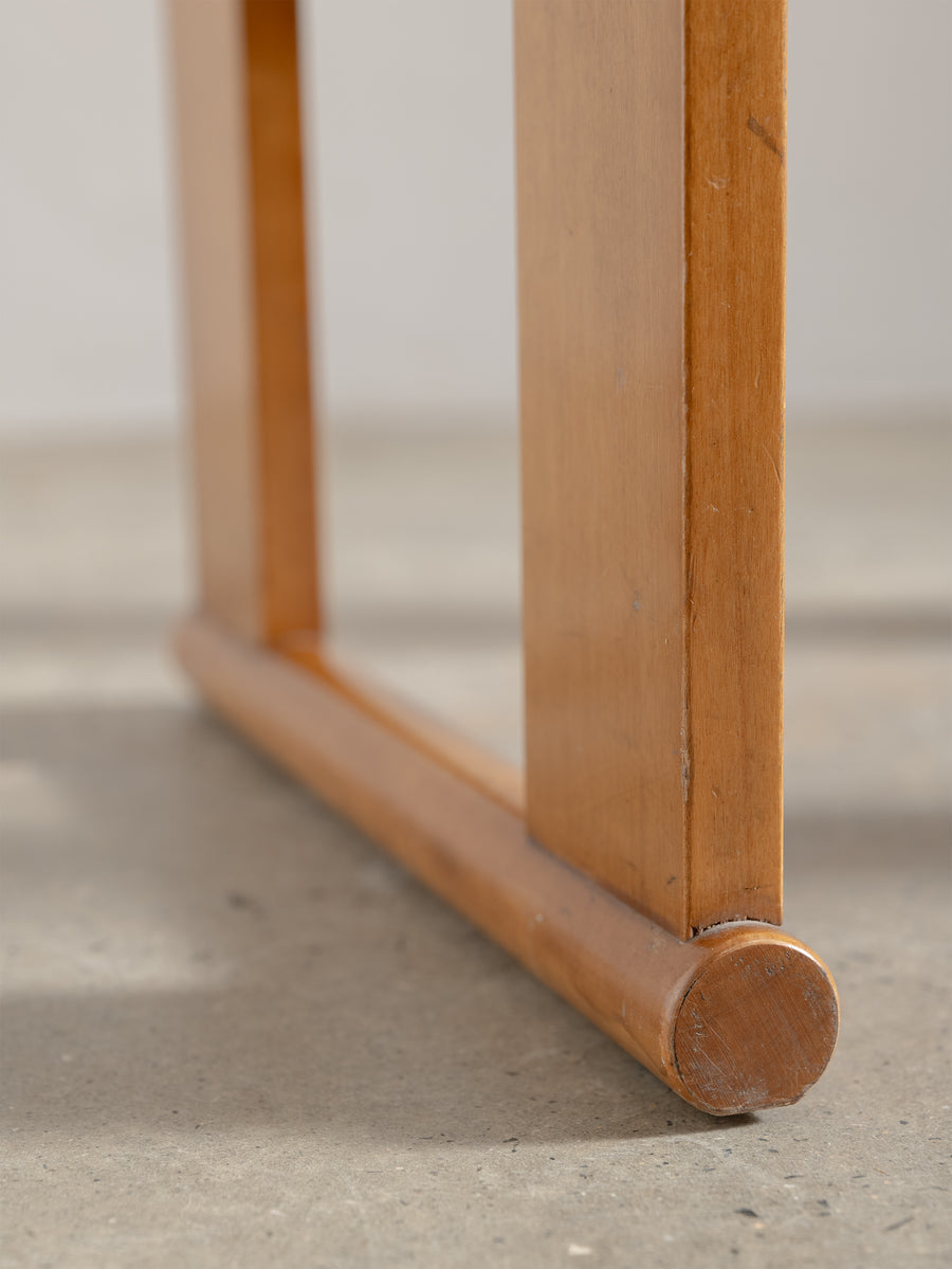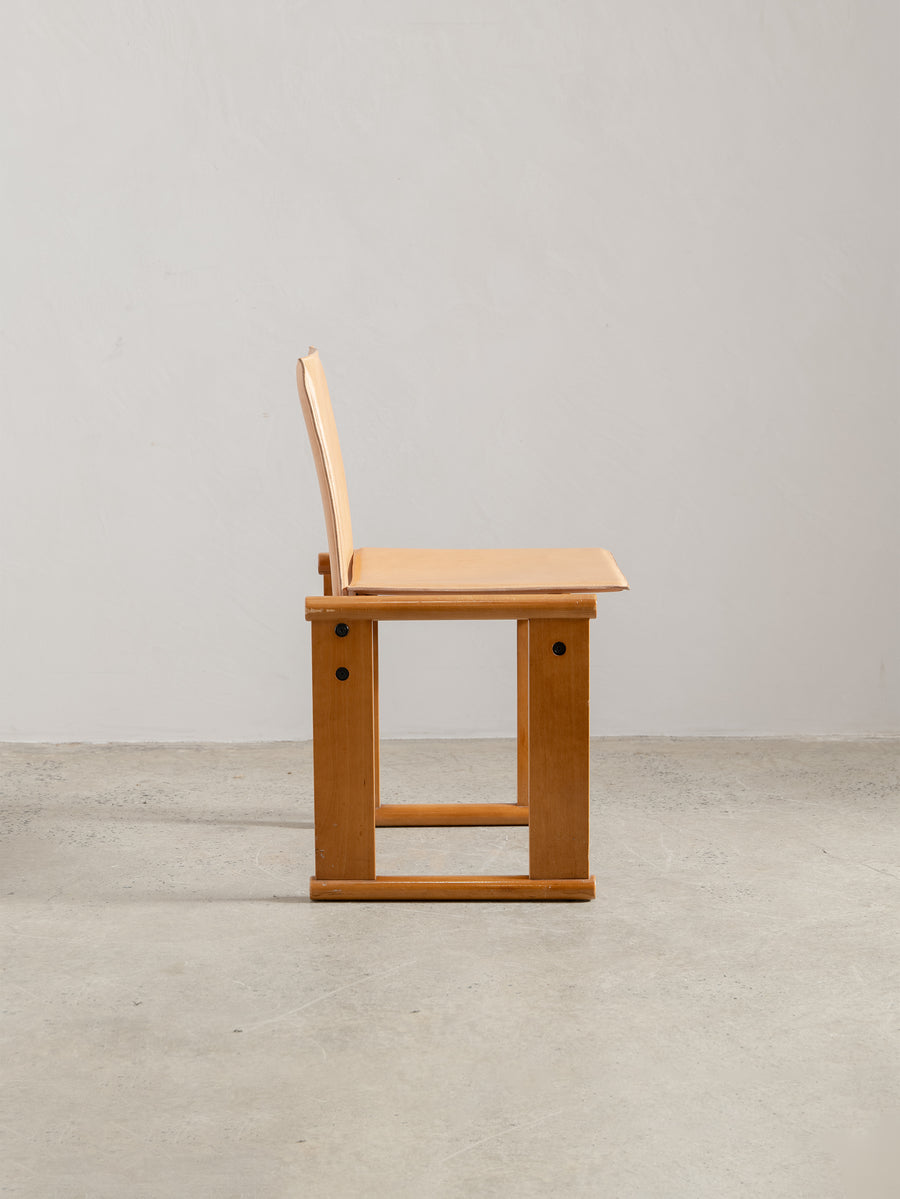 An emblem of Italian modernism, this chair showcases the Scarpas’ masterful balance between structure and sculpture. Its design is defined by two solid timber trestles joined with exposed burnished steel bolts - an expression of material and form. The newly upholstered seat and back in supple tan leather highlight the refined craftsmanship and architectural precision for which the Scarpas are renowned.