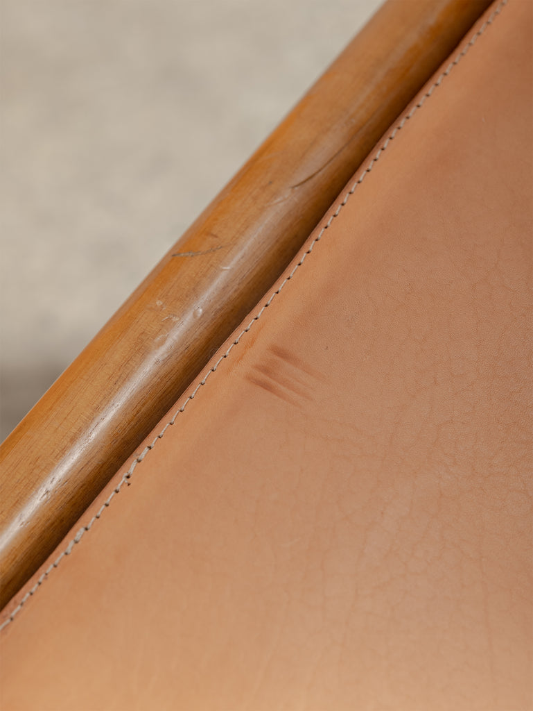 Newly upholstered in tan leather. Original frame with minor wear consistent with age.