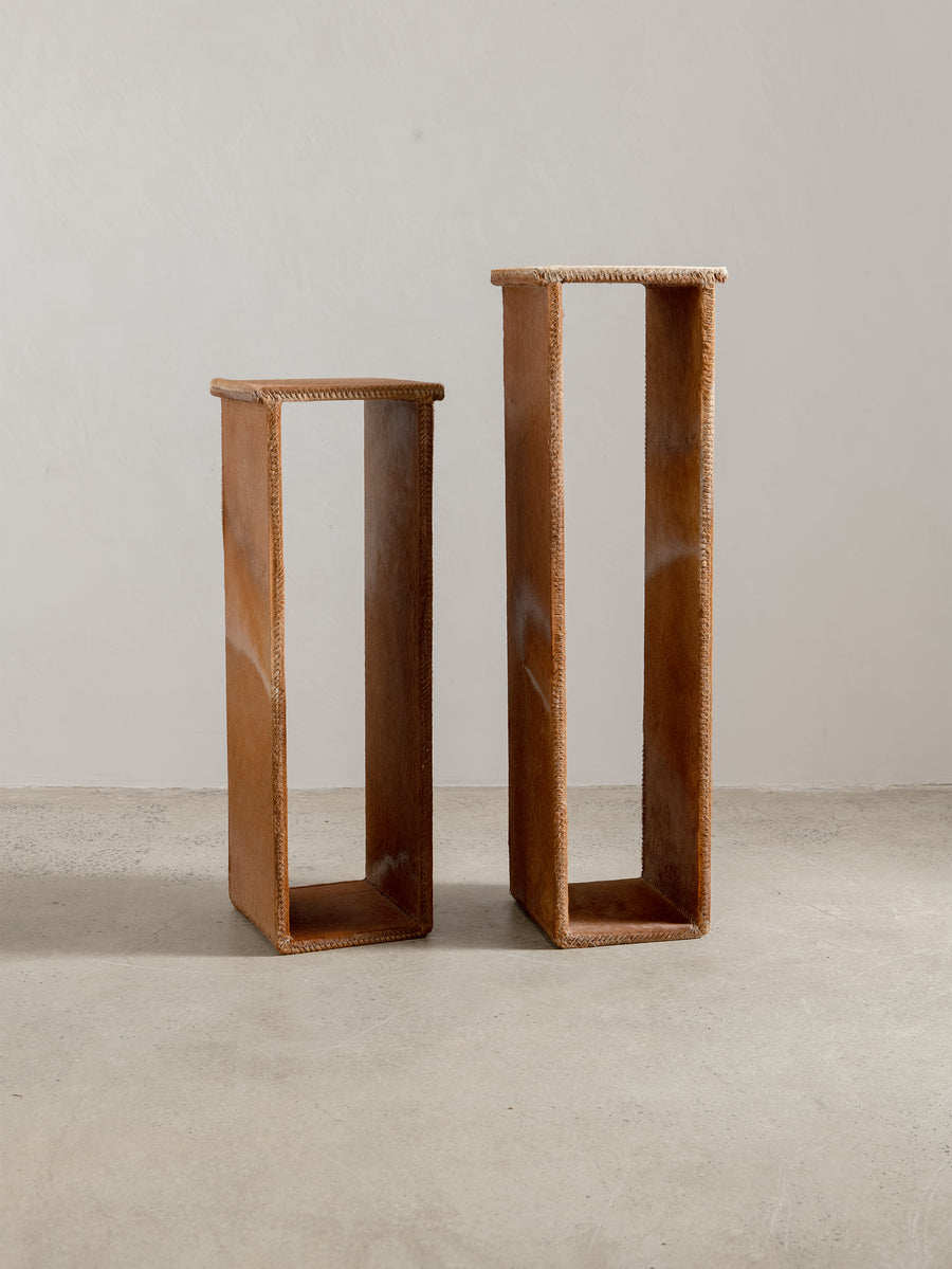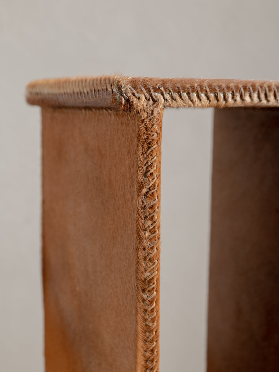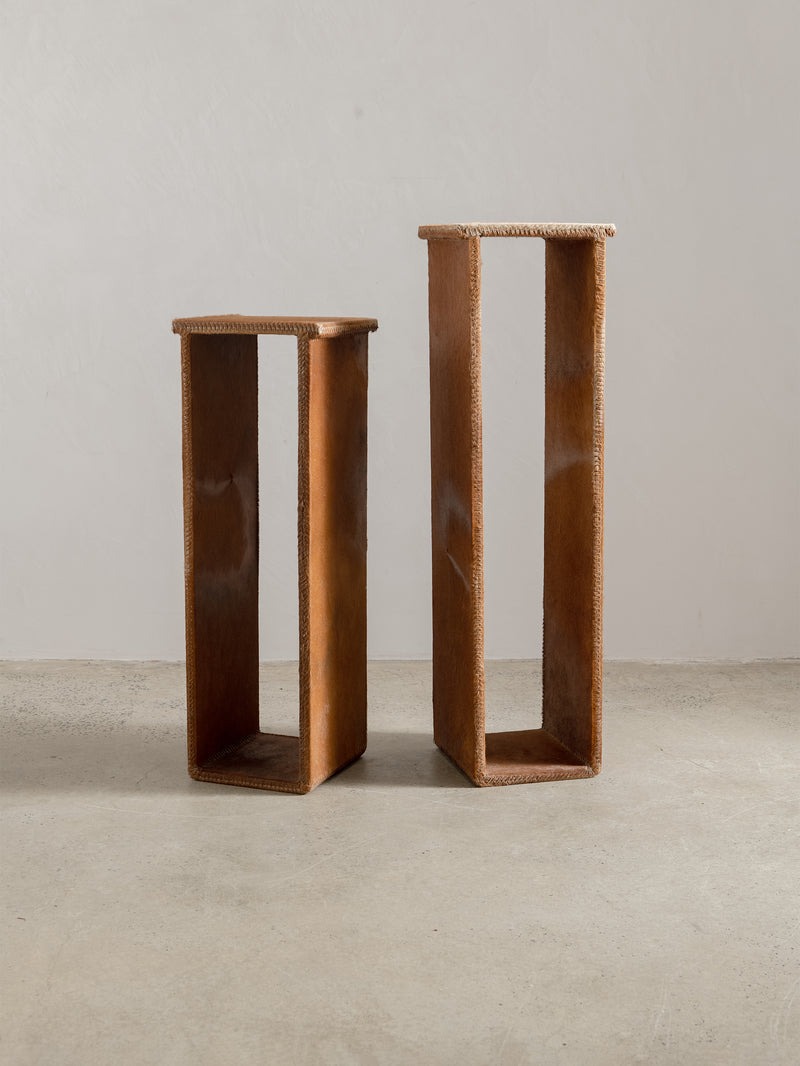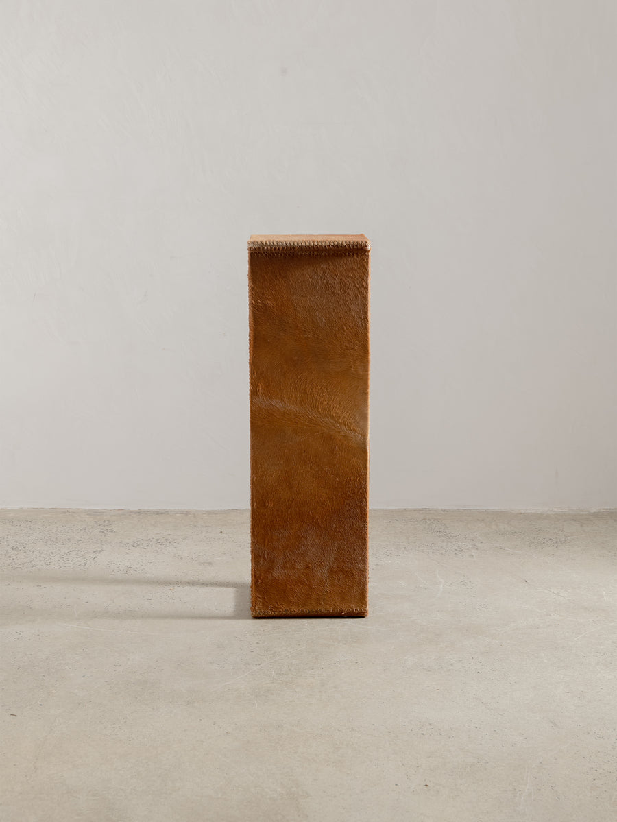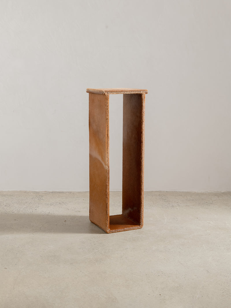 Elegant in its restraint, this vintage plinth is wrapped entirely in horse hide, lending a warm, tactile richness to its minimalist form. The rectangular silhouette with open sides reveals the craftsmanship of the era - precise stitching and natural patina that comes only with age. Both sculptural and functional, it stands beautifully as a pedestal for art or as an object of design in its own right.