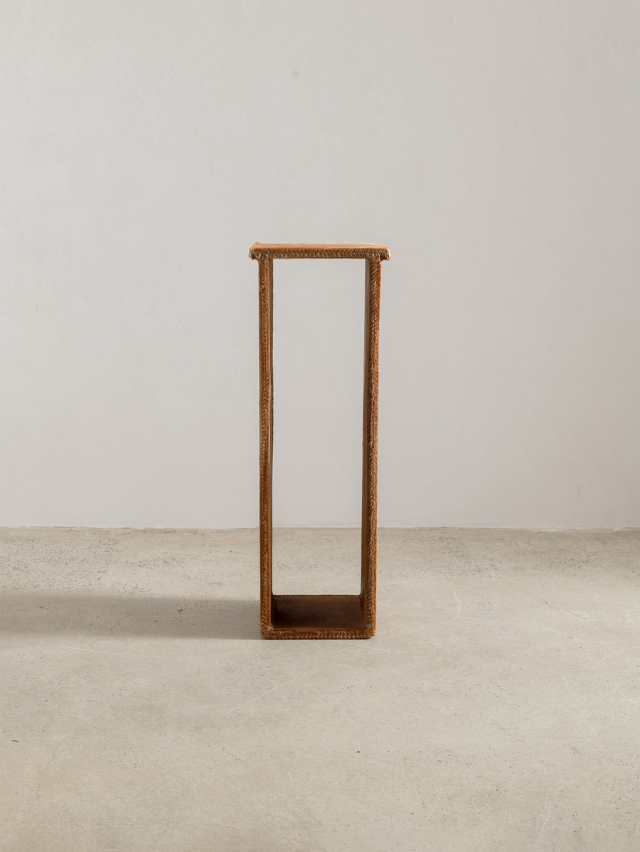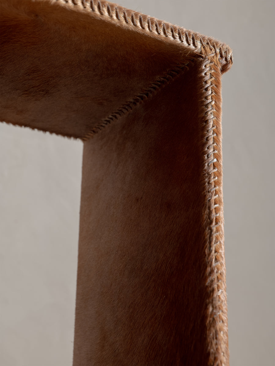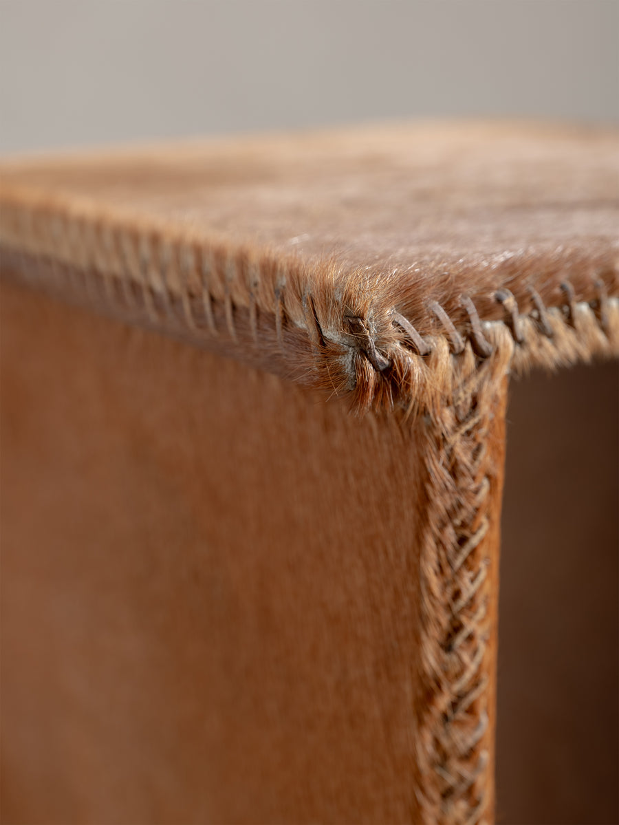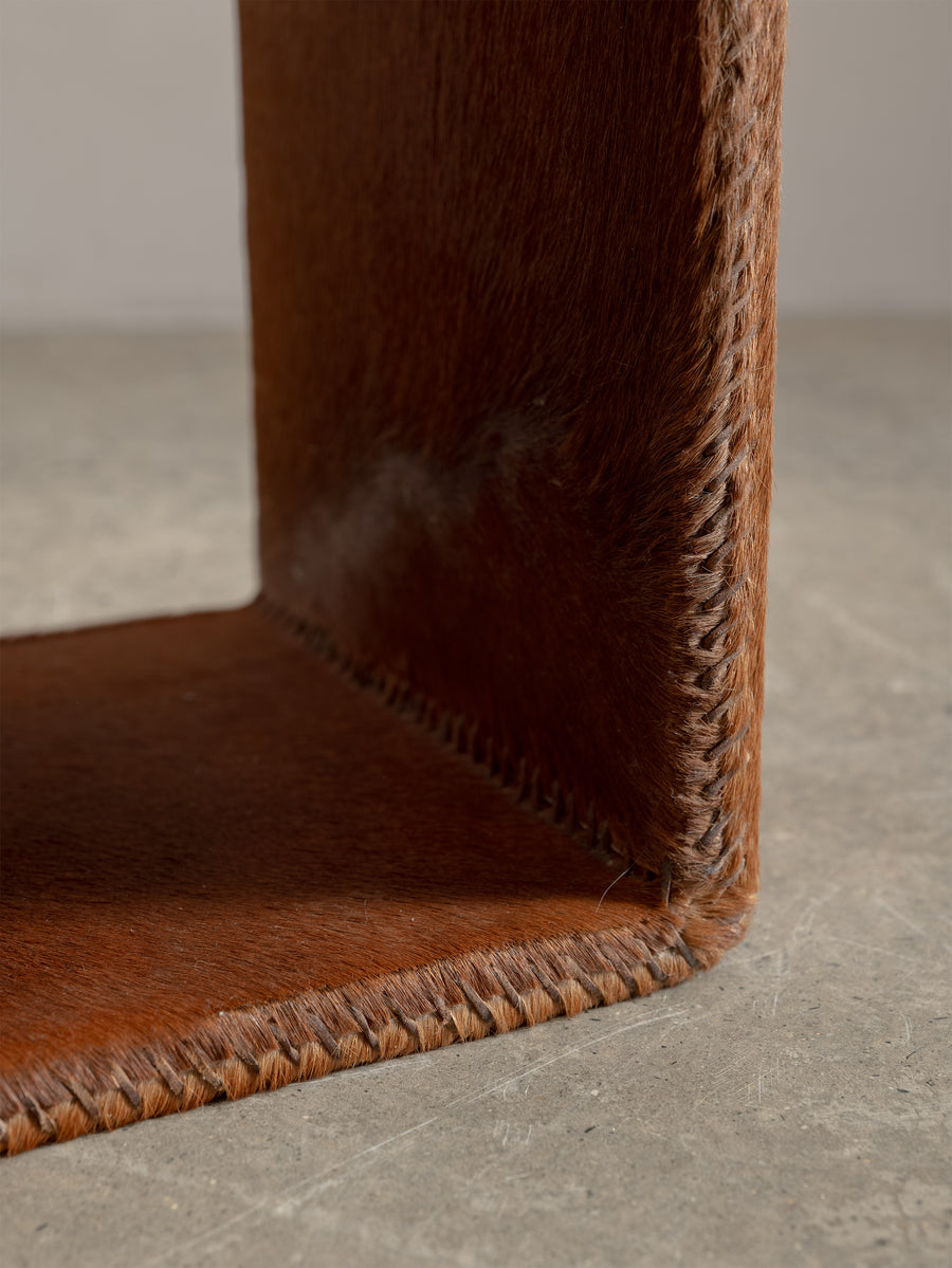 Elegant in its restraint, this vintage plinth is wrapped entirely in horse hide, lending a warm, tactile richness to its minimalist form. The rectangular silhouette with open sides reveals the craftsmanship of the era - precise stitching and natural patina that comes only with age. Both sculptural and functional, it stands beautifully as a pedestal for art or as an object of design in its own right.
