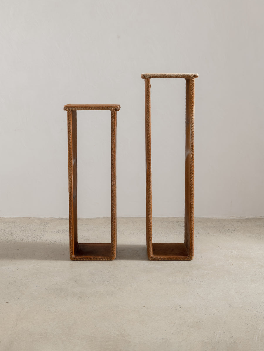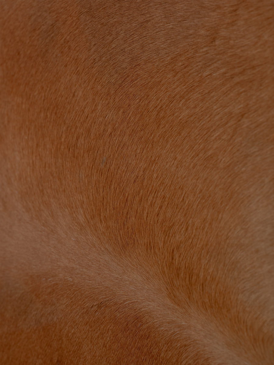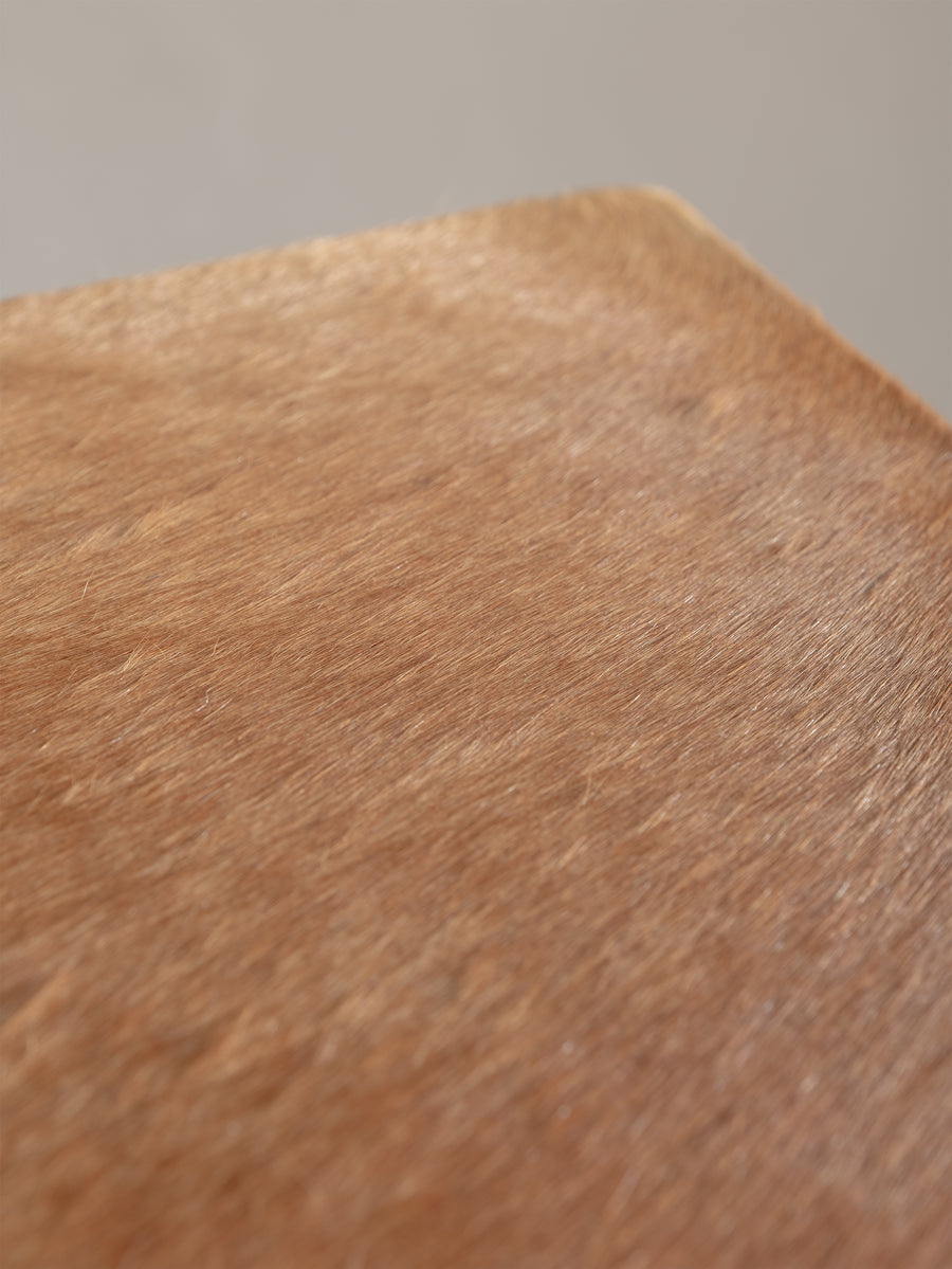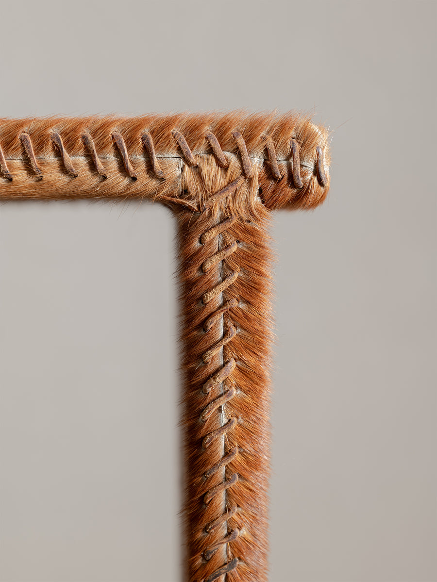 Elegant in its restraint, this vintage plinth is wrapped entirely in horse hide, lending a warm, tactile richness to its minimalist form. The rectangular silhouette with open sides reveals the craftsmanship of the era - precise stitching and natural patina that comes only with age. Both sculptural and functional, it stands beautifully as a pedestal for art or as an object of design in its own right.