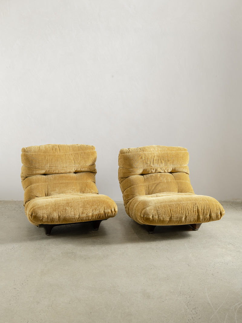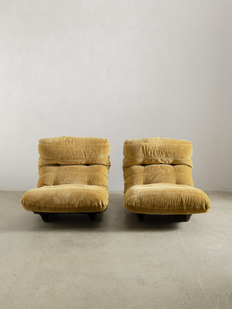 The Marsala lounge chair, designed by Michel Ducaroy for French maker Ligne Roset. Characterised by its low, modular profile, the chair features a moulded base that cradles generous cushions in it's original cotton velvet upholstery. Both sculptural and deeply comfortable, the Marsala embodies Ducaroy’s pioneering vision for relaxed, contemporary living and remains an enduring icon of 1970s French design.