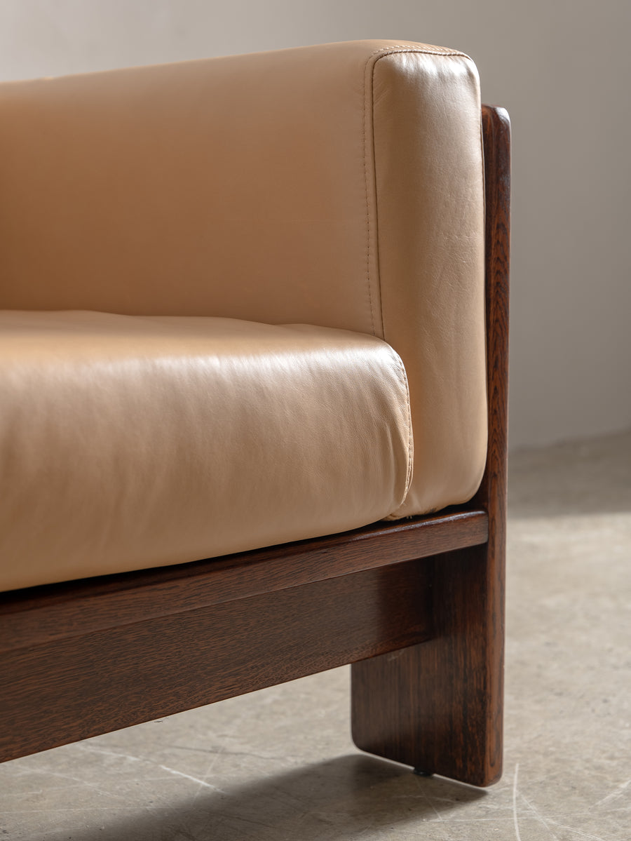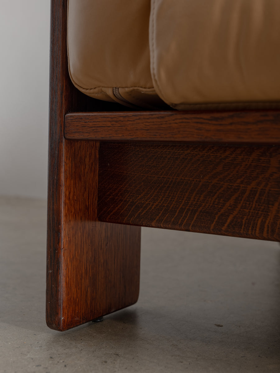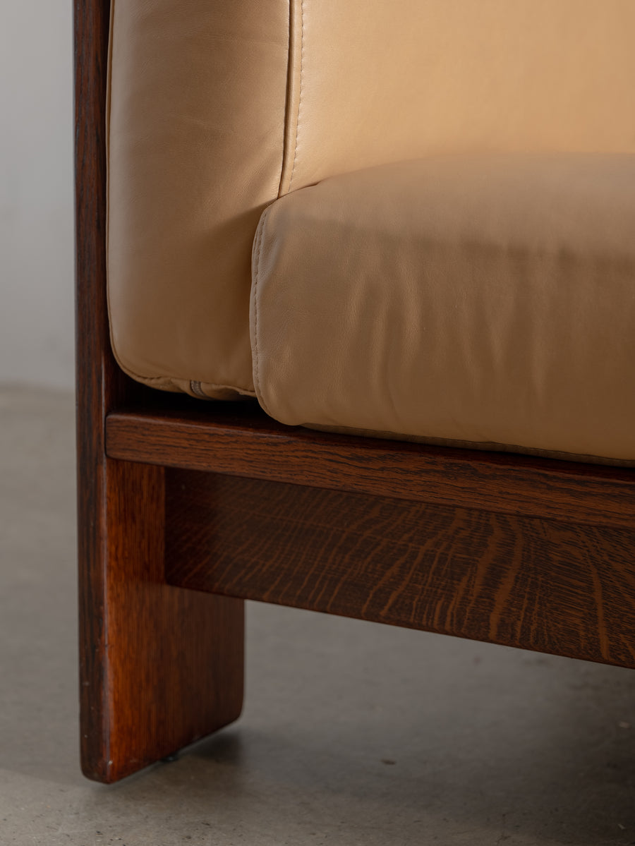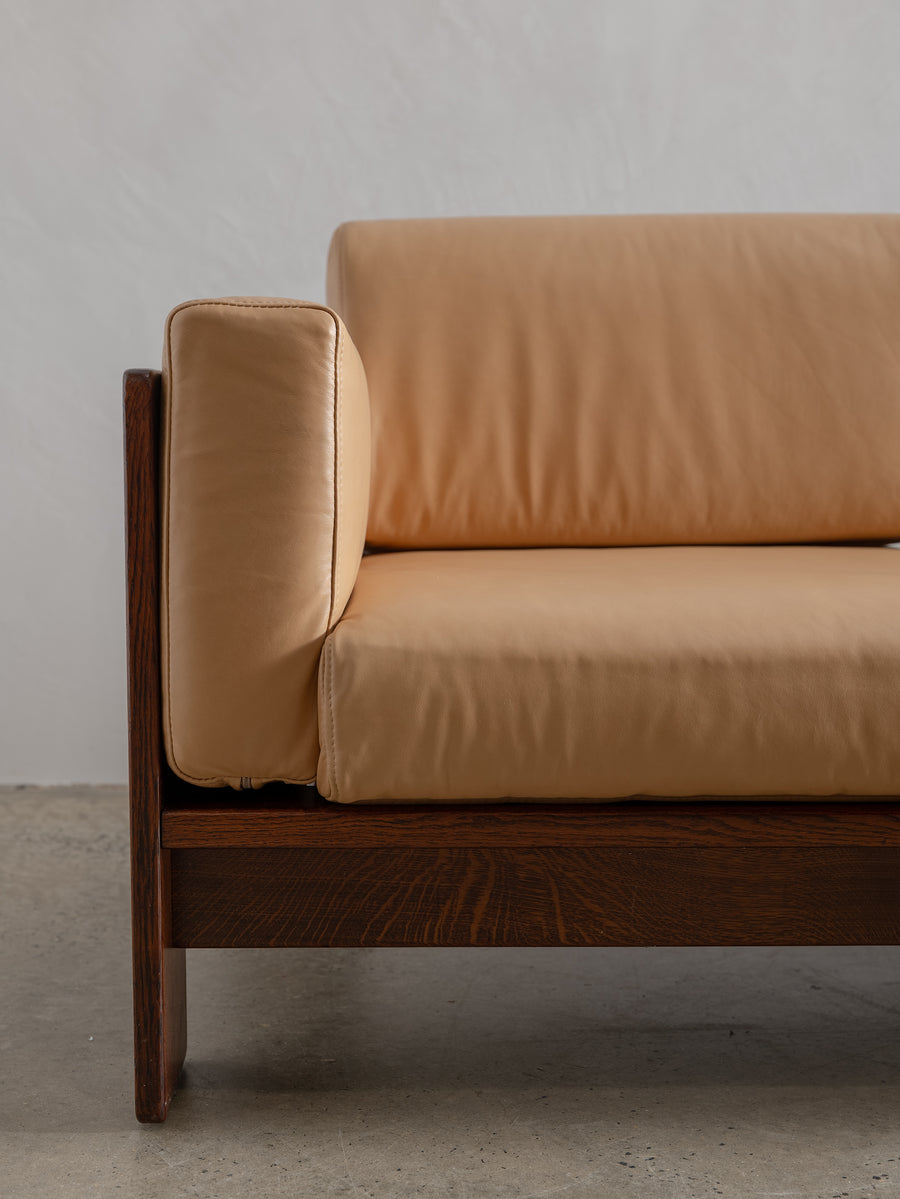 This 3-seater edition has been newly reupholstered in supple macadamia-toned leather, lending a soft, tactile contrast to the strong geometry of its solid wood frame. The design allows the cushions to sit nestled within the structure, creating a sense of openness while offering deep, relaxed seating.