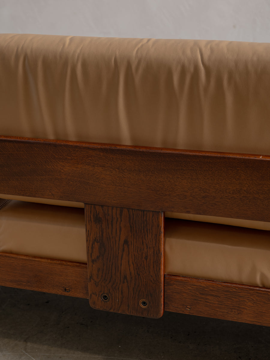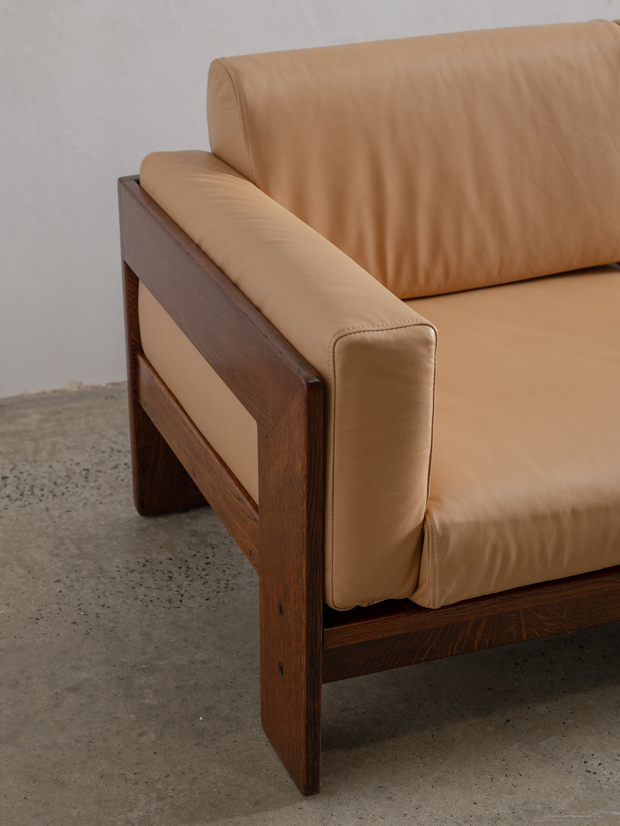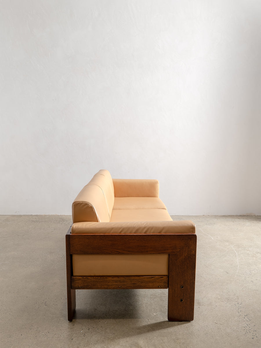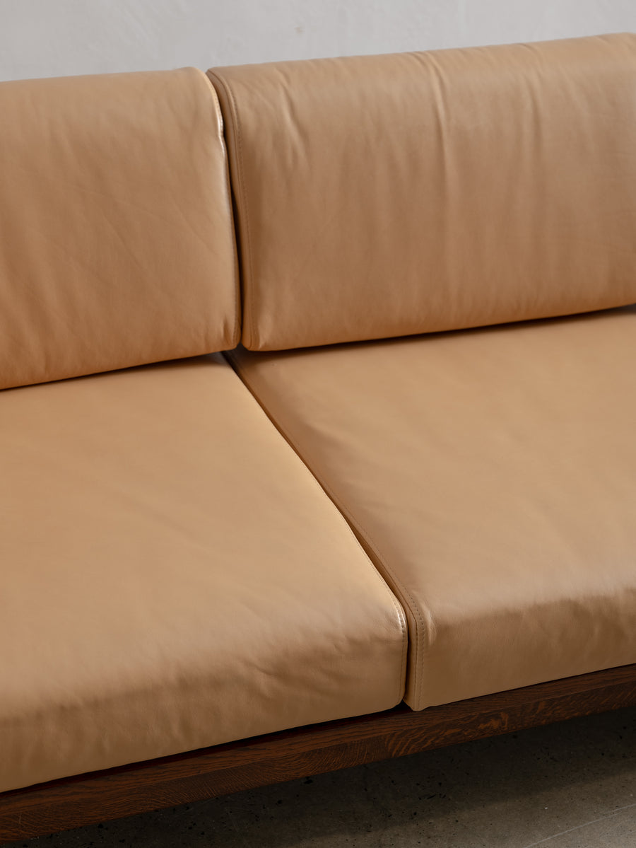 This 3-seater edition has been newly reupholstered in supple macadamia-toned leather, lending a soft, tactile contrast to the strong geometry of its solid wood frame. The design allows the cushions to sit nestled within the structure, creating a sense of openness while offering deep, relaxed seating.