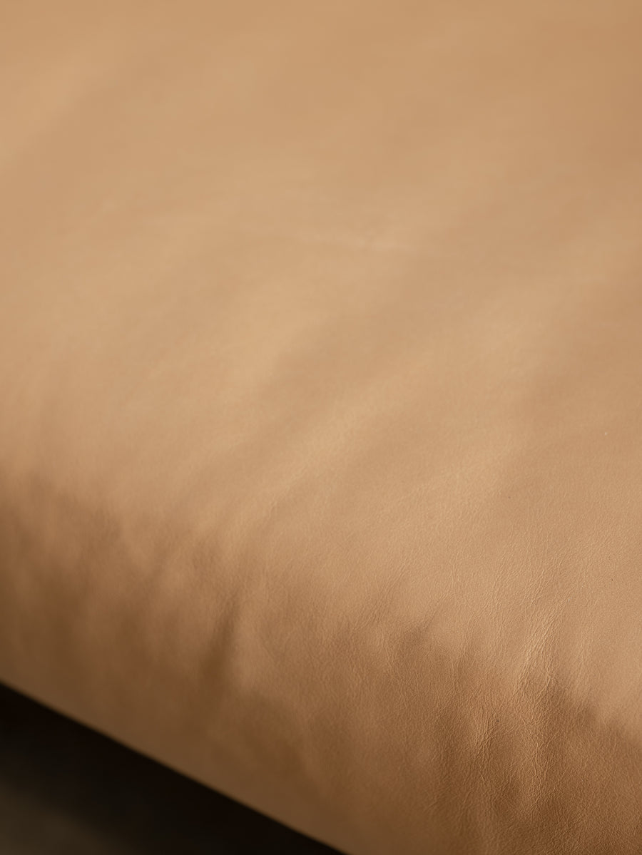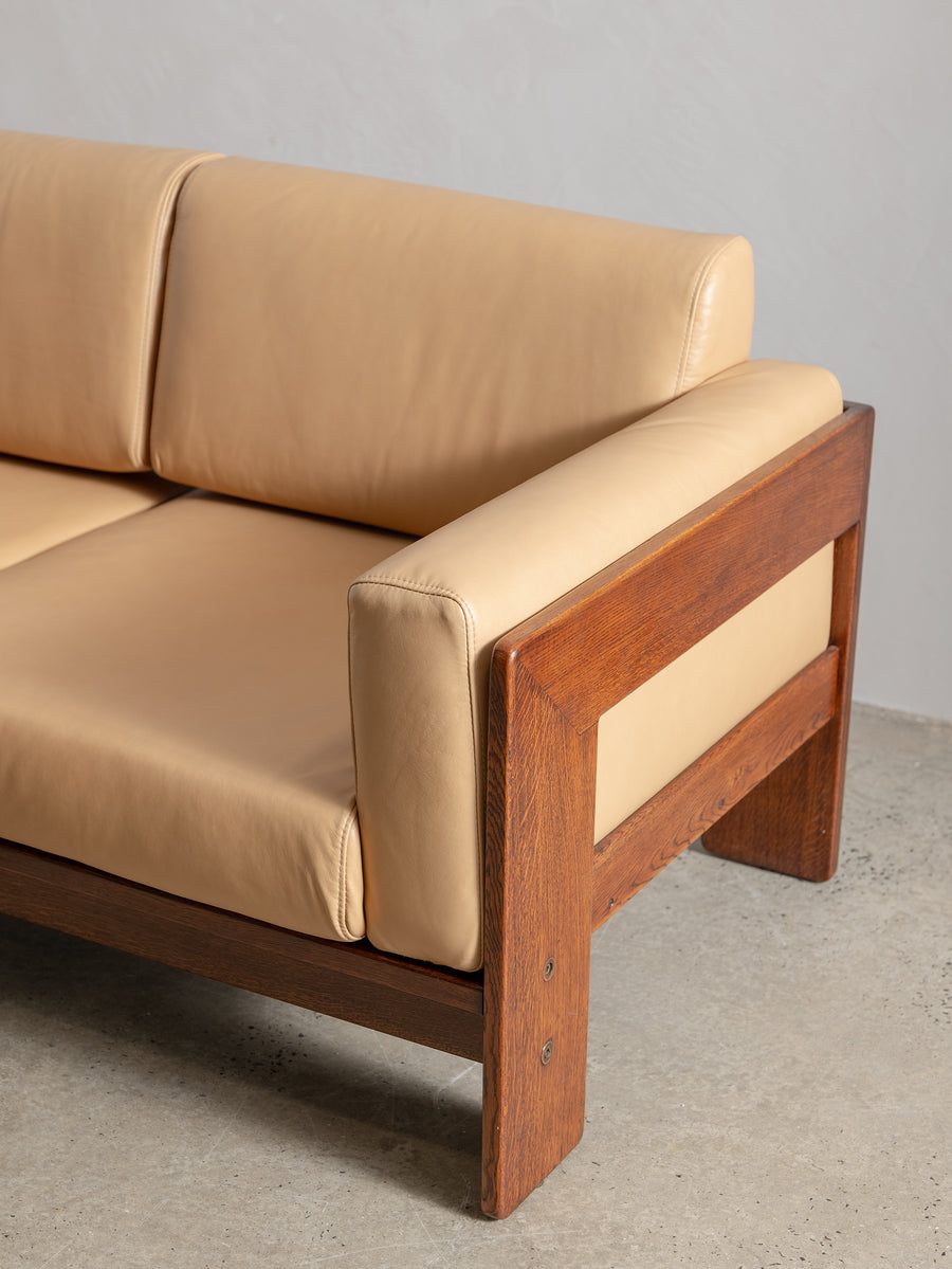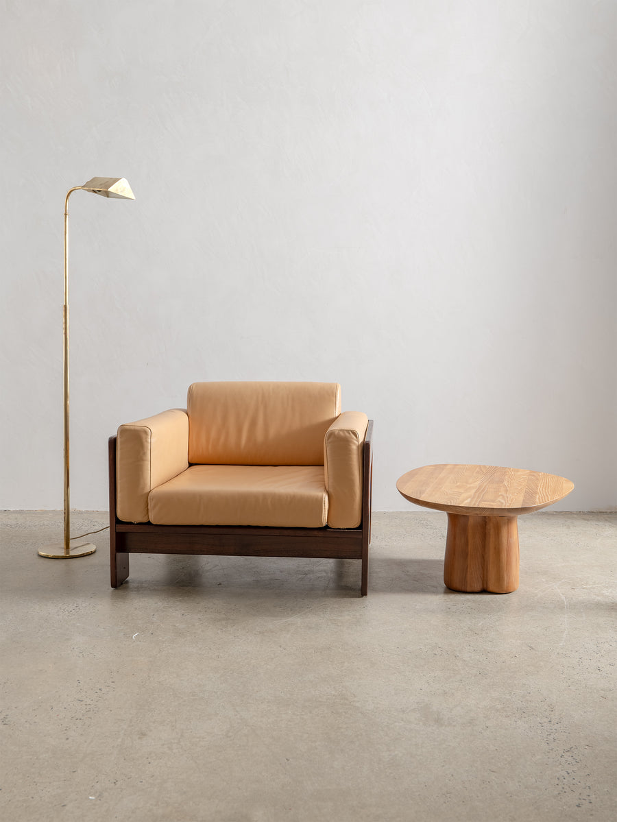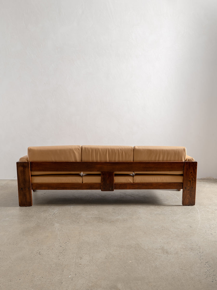 This 3-seater edition has been newly reupholstered in supple macadamia-toned leather, lending a soft, tactile contrast to the strong geometry of its solid wood frame. The design allows the cushions to sit nestled within the structure, creating a sense of openness while offering deep, relaxed seating.