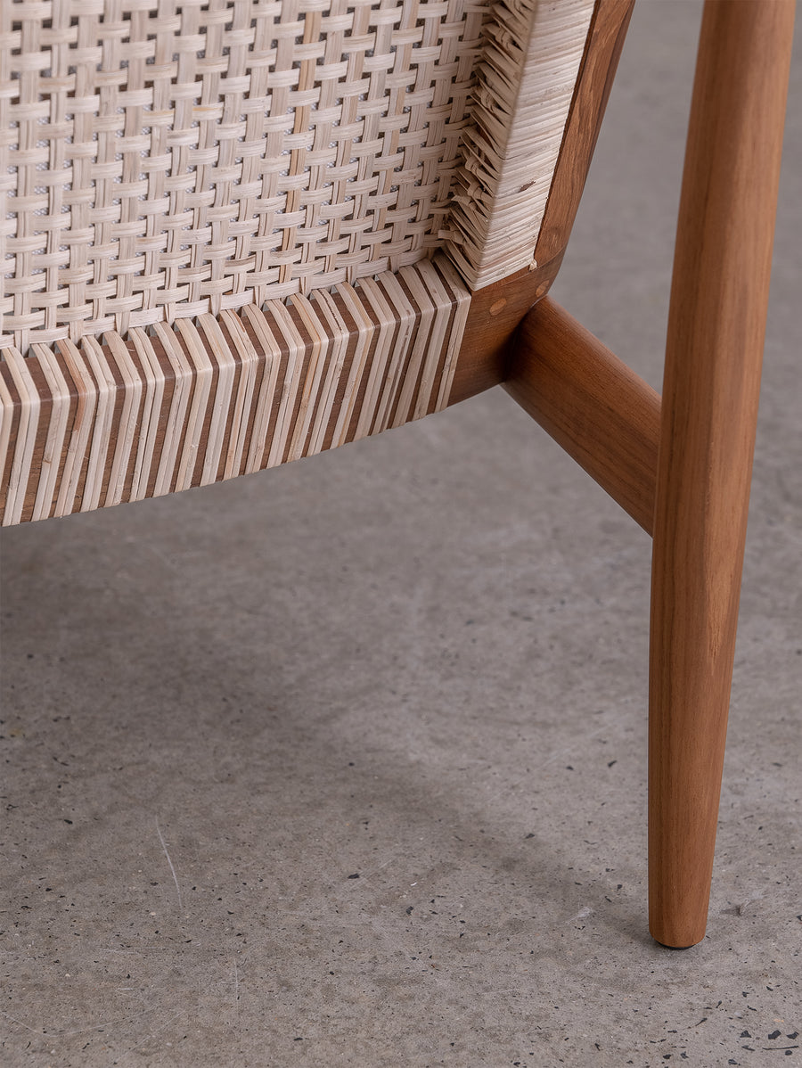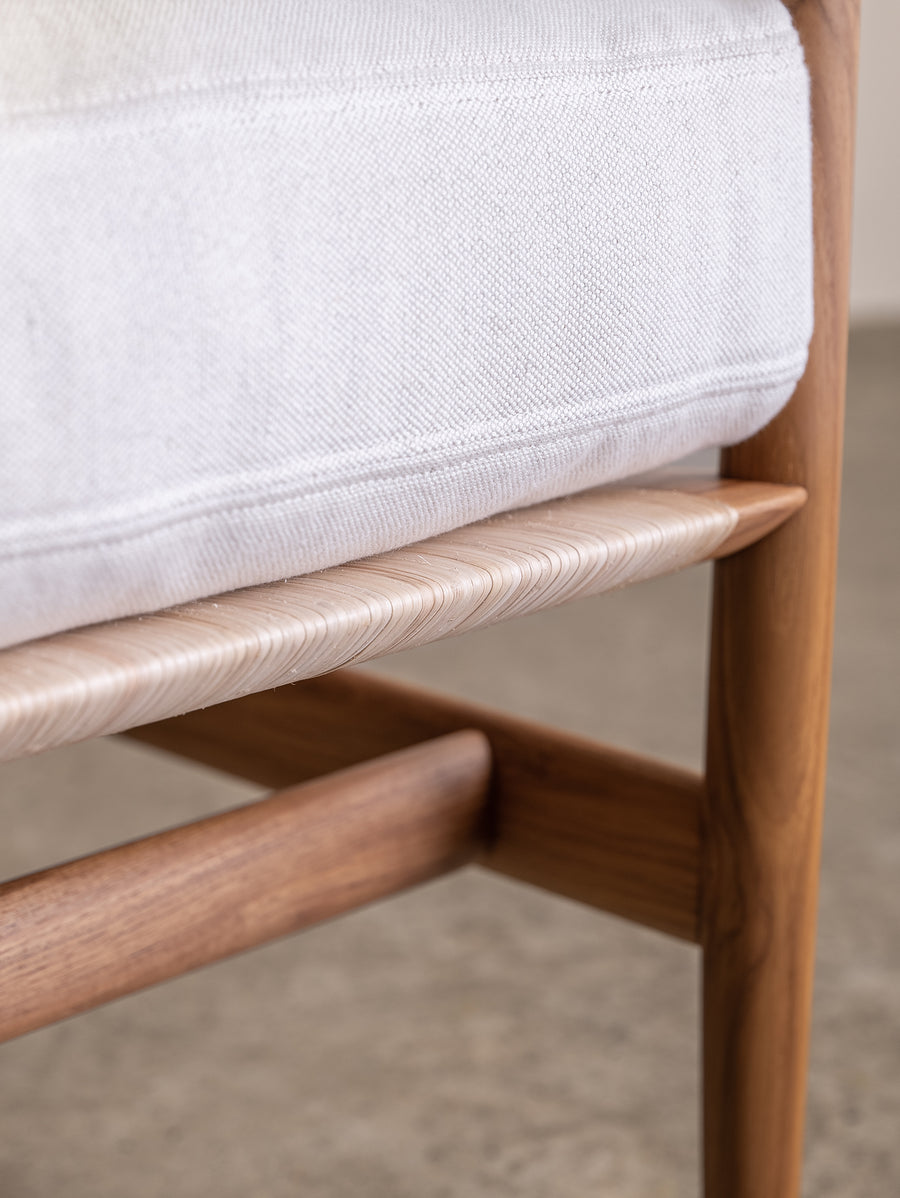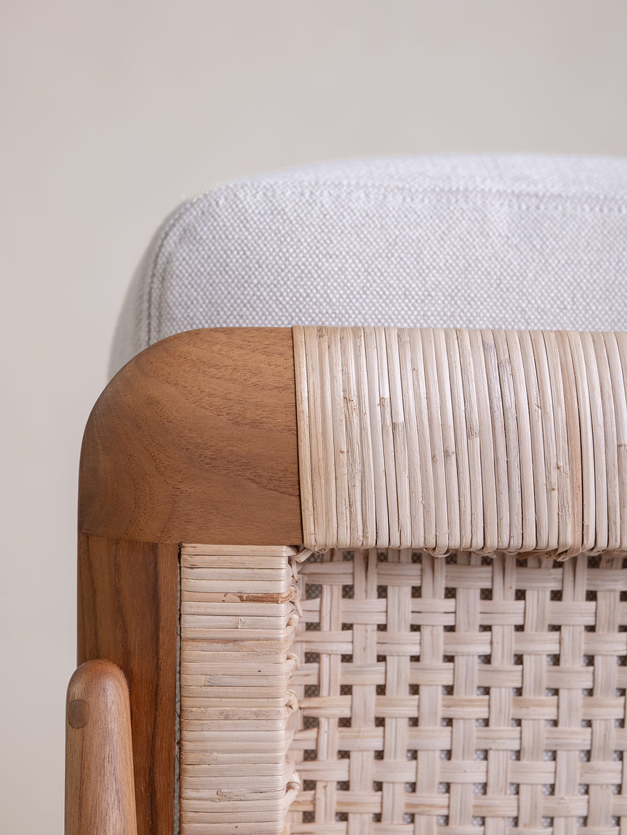 The Tangali Comfort Chair is a spacious and cozy lounge chair that is accompanied by back and seat cushions; designed for ultimate relaxation. This luxurious piece features hand-spun cotton fabric cushions that are filled with foam and wadding atop the signature Tangali cane weave and teak timber frame.