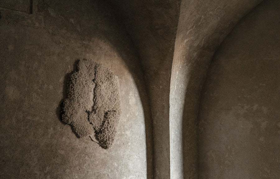 The irregular shaped Tapestry No. 03 explores different yarns and techniques that creates a vibrant and artistic wall piece. Elements of natural dark grey fields adds a contrasting shade to the over all beige hues.