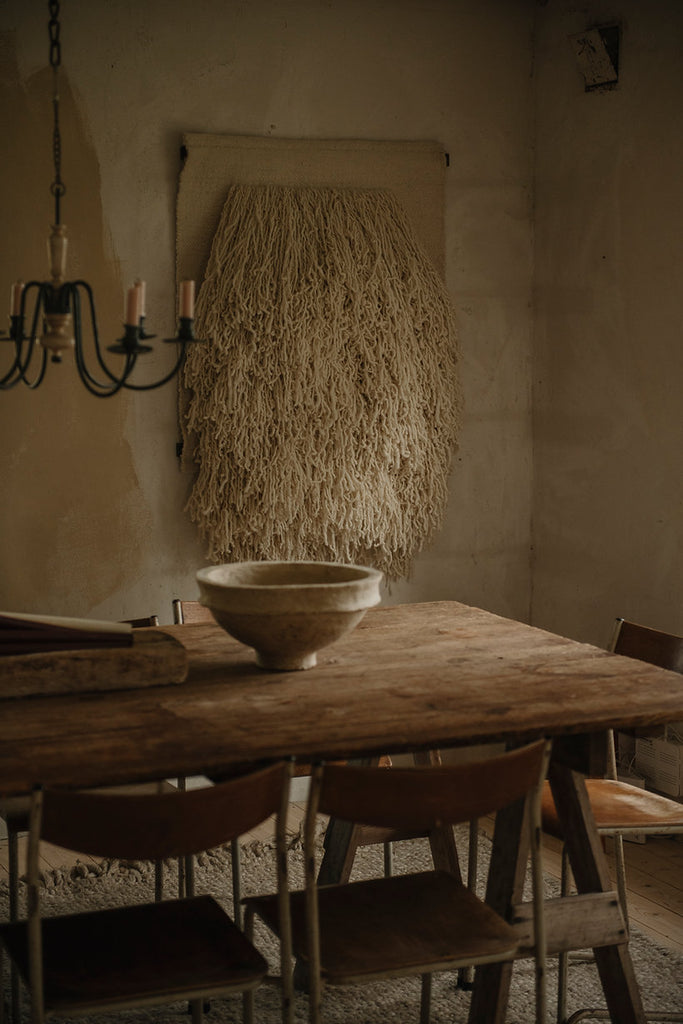 Tapestry No. 04 is an expressive wall piece, perfectly balancing soft and bold. Its long hand spun yarn in natural white wool lends the piece a tactility that makes it stand out; literally and metaphorically. It is an avantgarde interpretation of traditional textile art - handcrafted and unique.