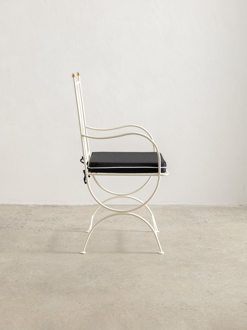 Crafted from 100% steel with a matte finish powder coating in Ivory, the chair is finished with a solid brass ball detail and outdoor cushion in sage with white piping.