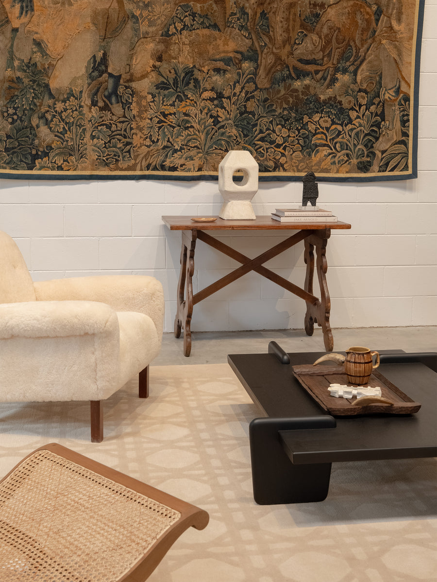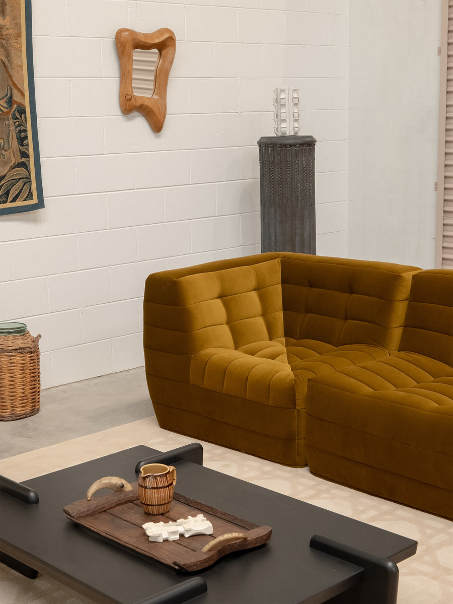 A striking Brutalist-era serving tray crafted from dark, hand-carved timber and accented with sculptural ivory handles. The piece captures the raw beauty of natural materials, combining rustic texture with elegant form. Once used for serving wine or aperitifs, it now serves beautifully as a decorative centrepiece - a refined example of French artisanal design from the period.