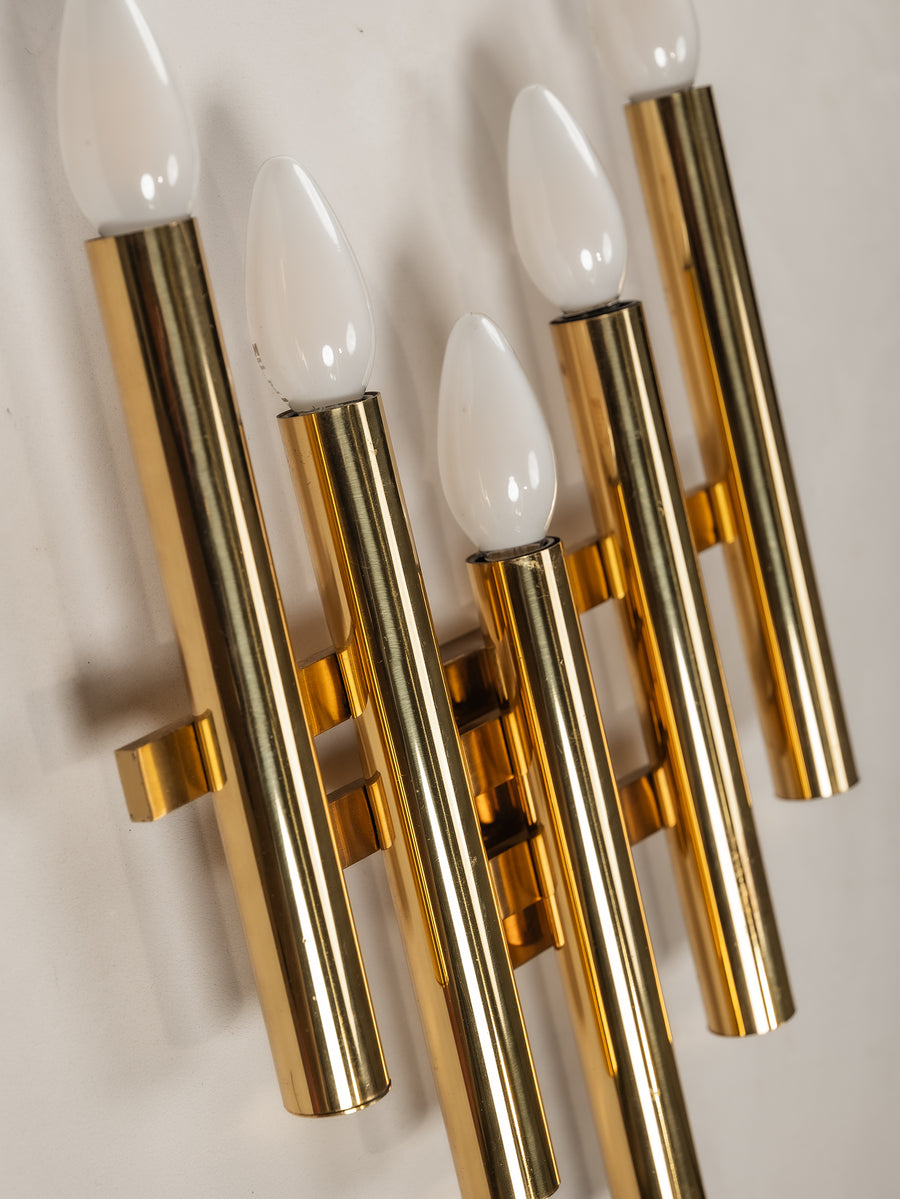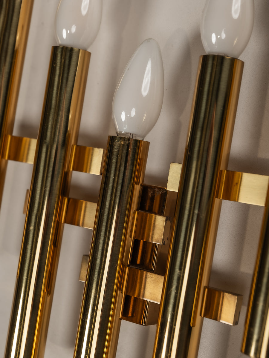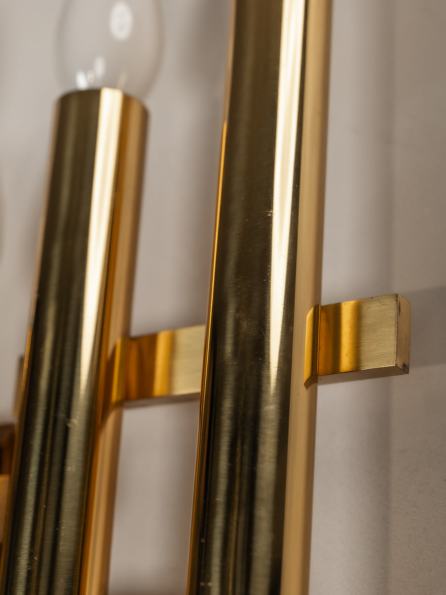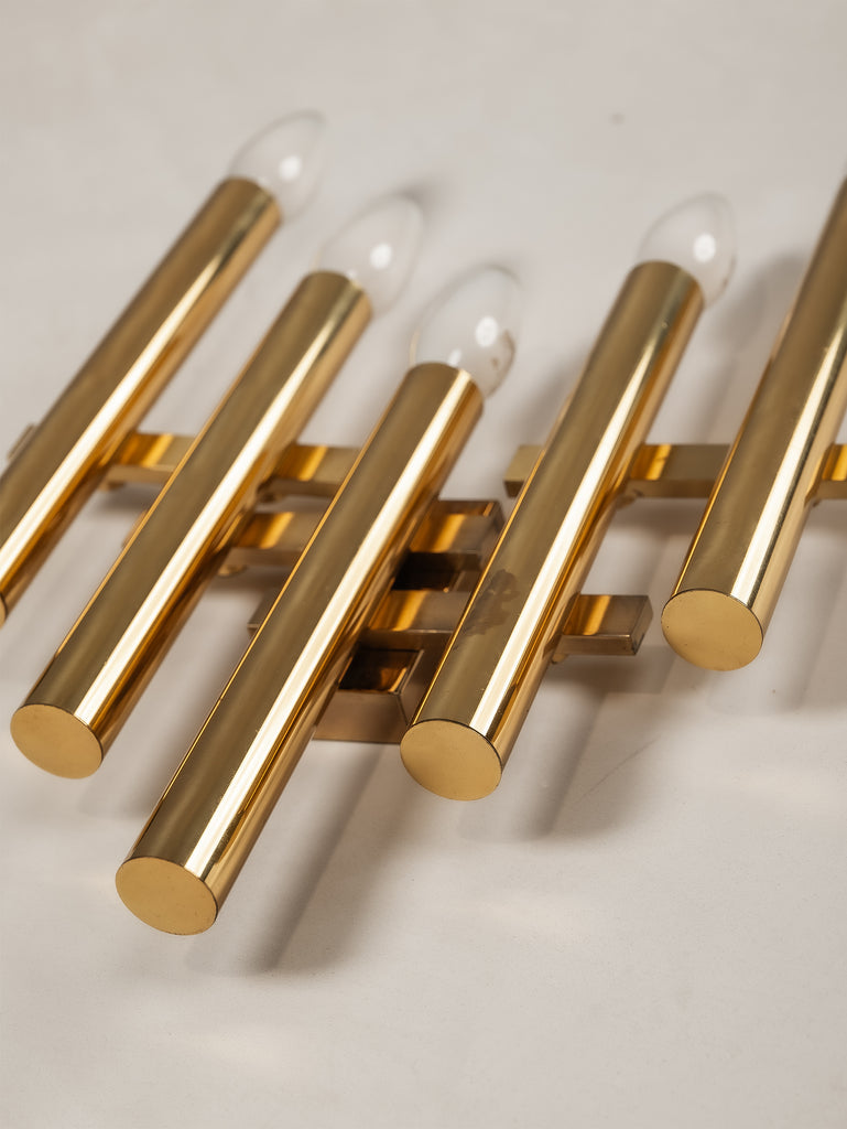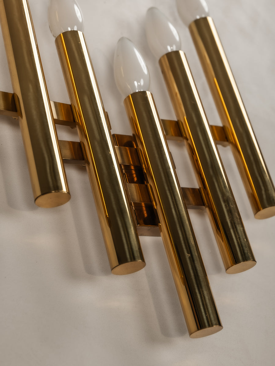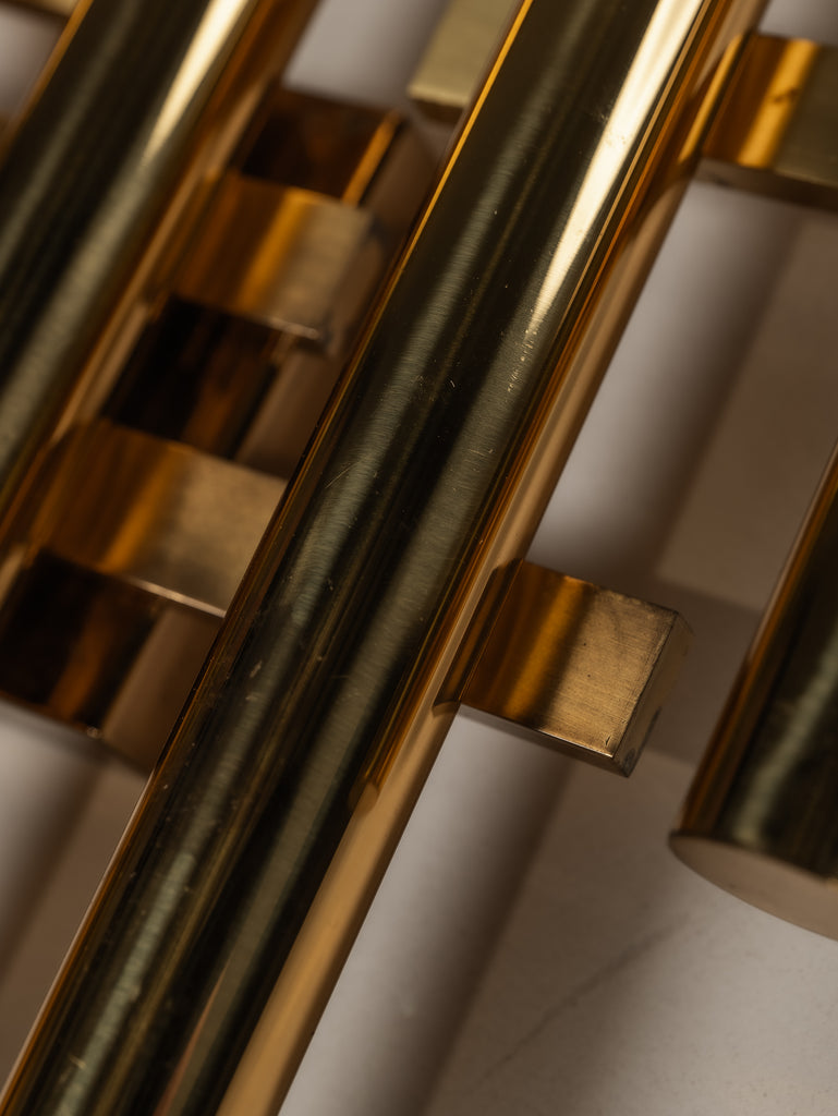 A striking interplay of light and form, this 1970s tubular wall light by Gaetano Sciolari embodies the designer’s refined approach to minimalism and glamour. Crafted from gilt brass, its sleek, architectural structure houses five lights, casting a warm, radiant glow. Subtle patina softens the polished surface, adding depth and character without diminishing its luminous presence. A timeless piece of Italian design—elegant, sculptural, and effortlessly sophisticated.