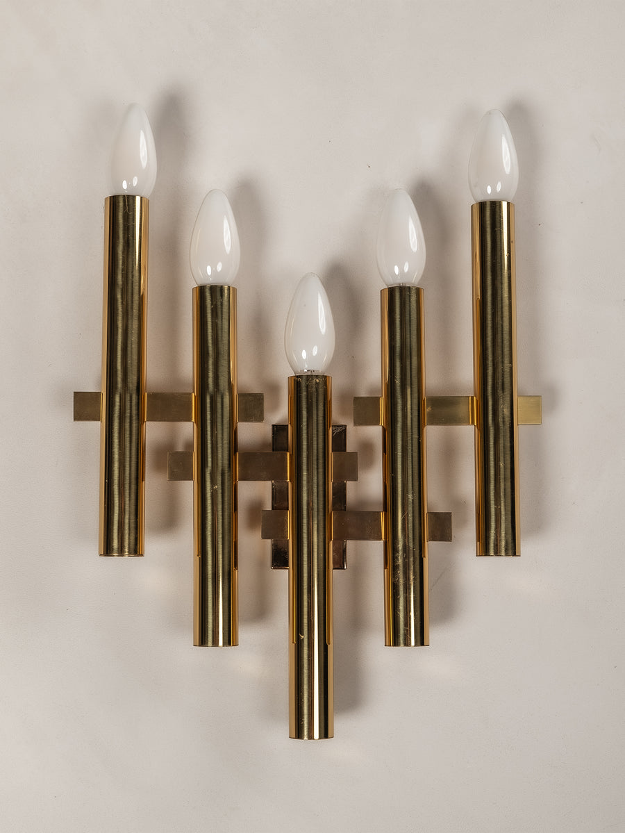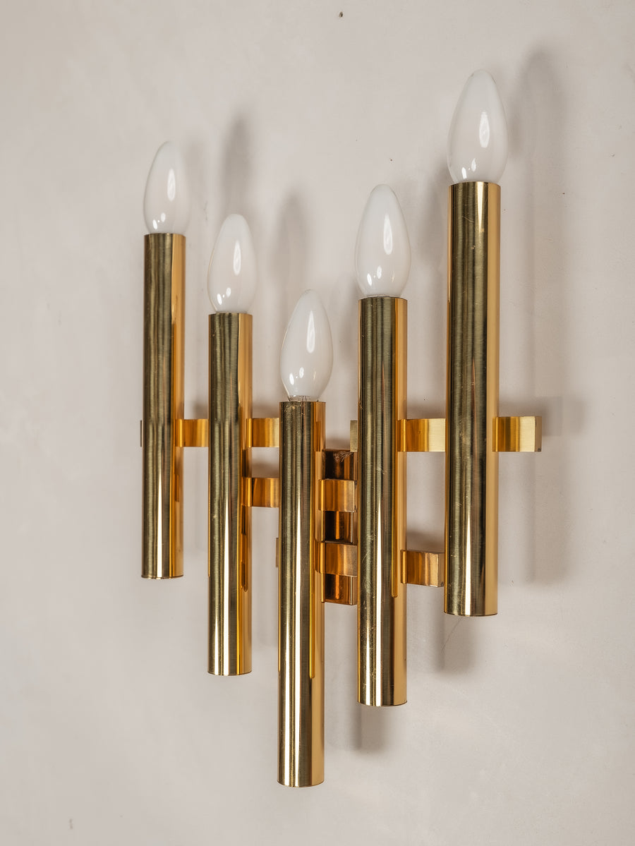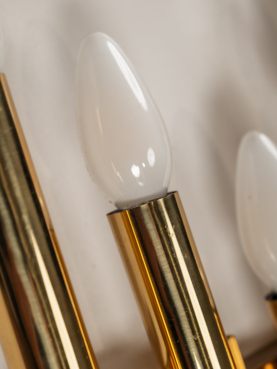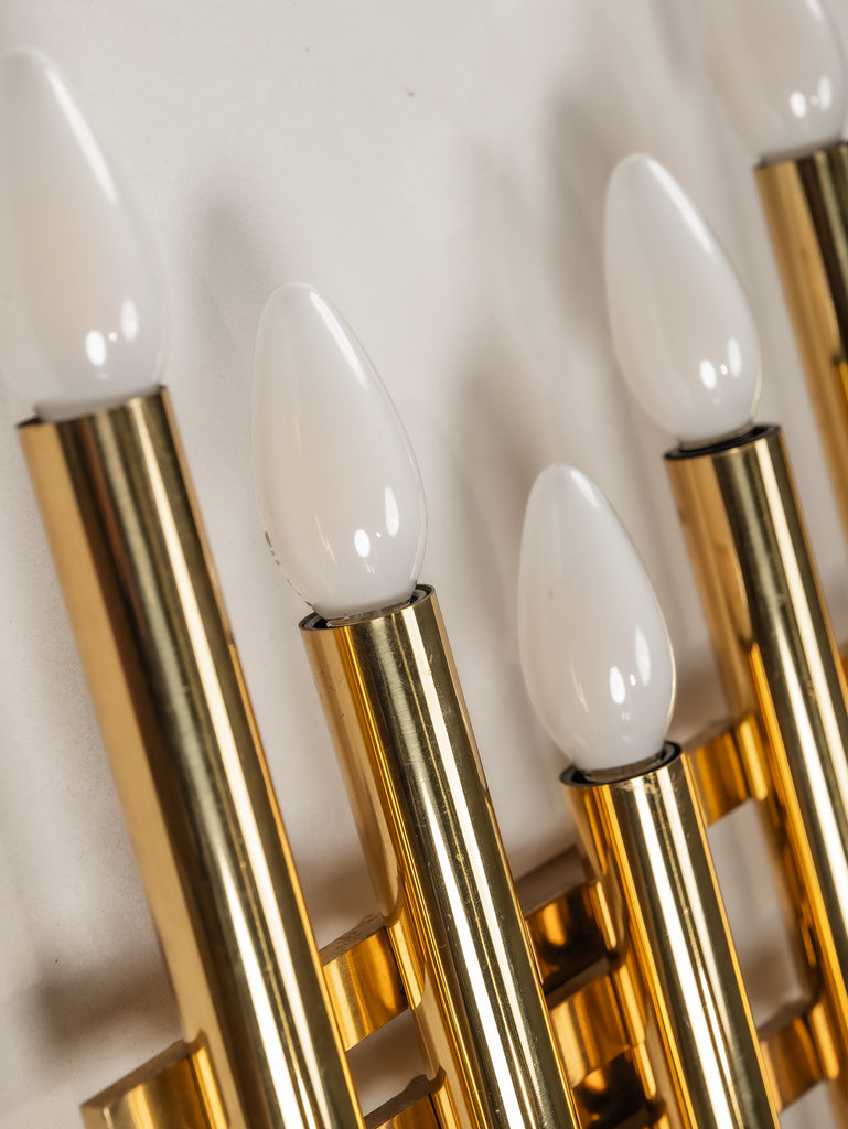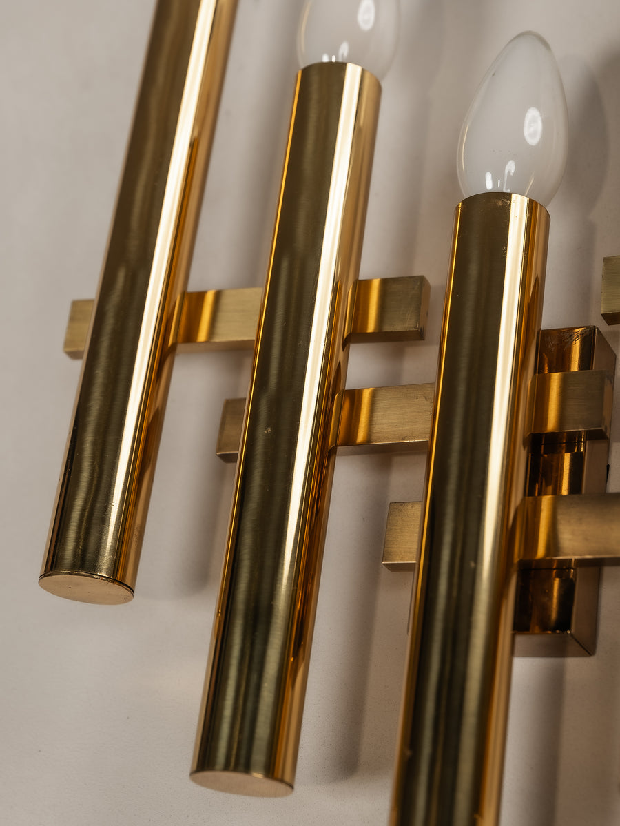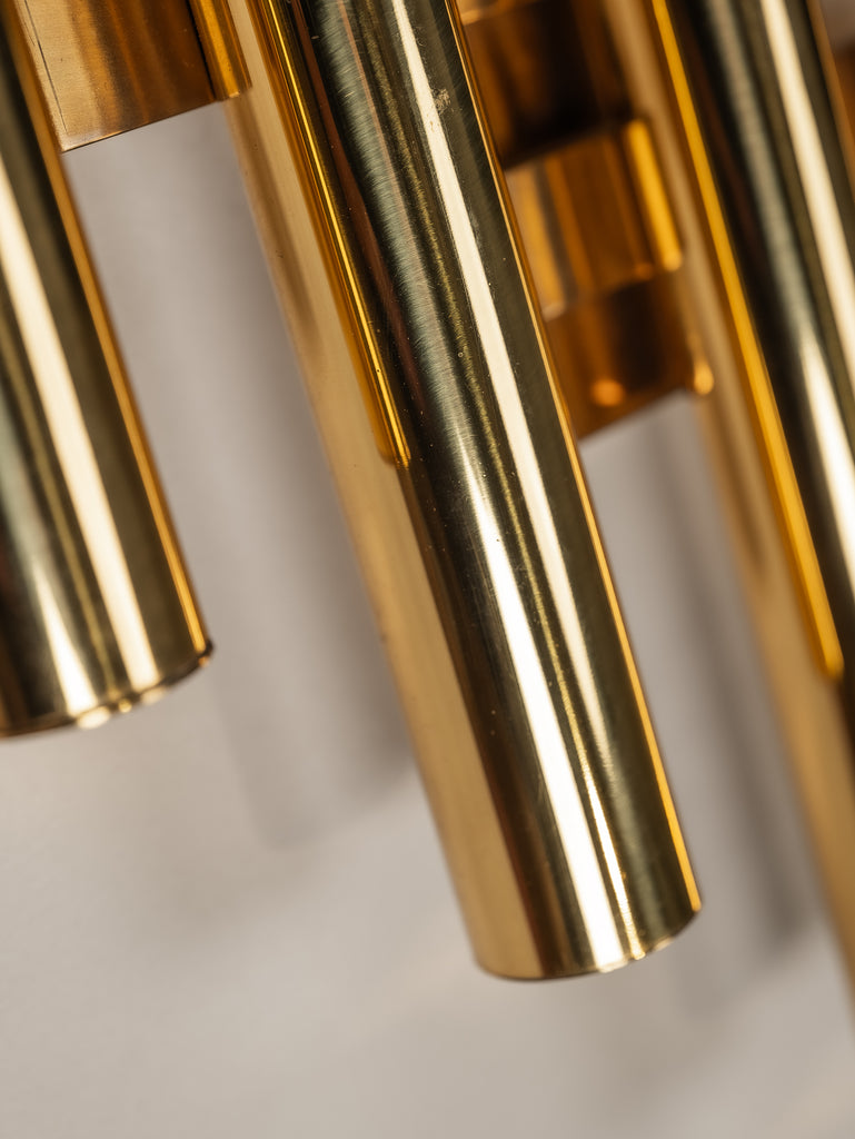 A striking interplay of light and form, this 1970s tubular wall light by Gaetano Sciolari embodies the designer’s refined approach to minimalism and glamour. Crafted from gilt brass, its sleek, architectural structure houses five lights, casting a warm, radiant glow. Subtle patina softens the polished surface, adding depth and character without diminishing its luminous presence. A timeless piece of Italian design—elegant, sculptural, and effortlessly sophisticated.