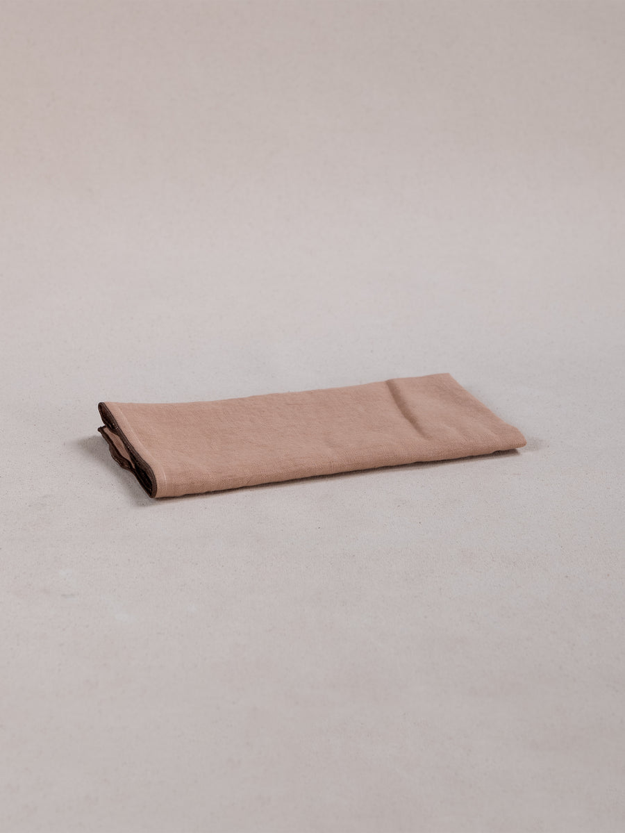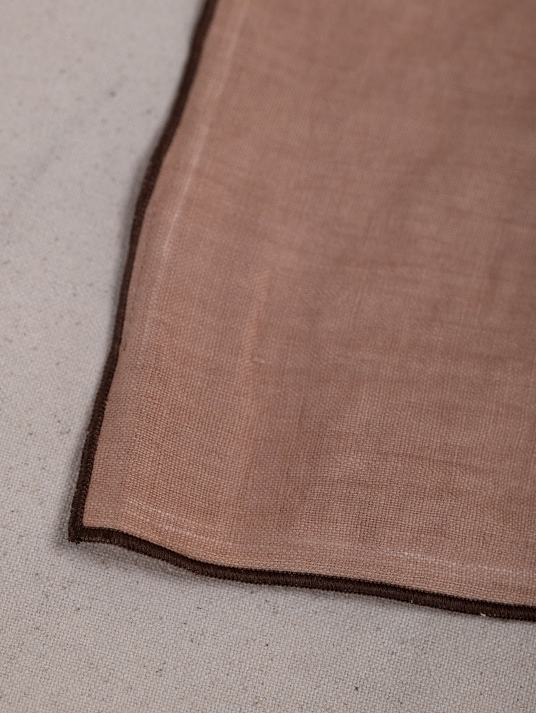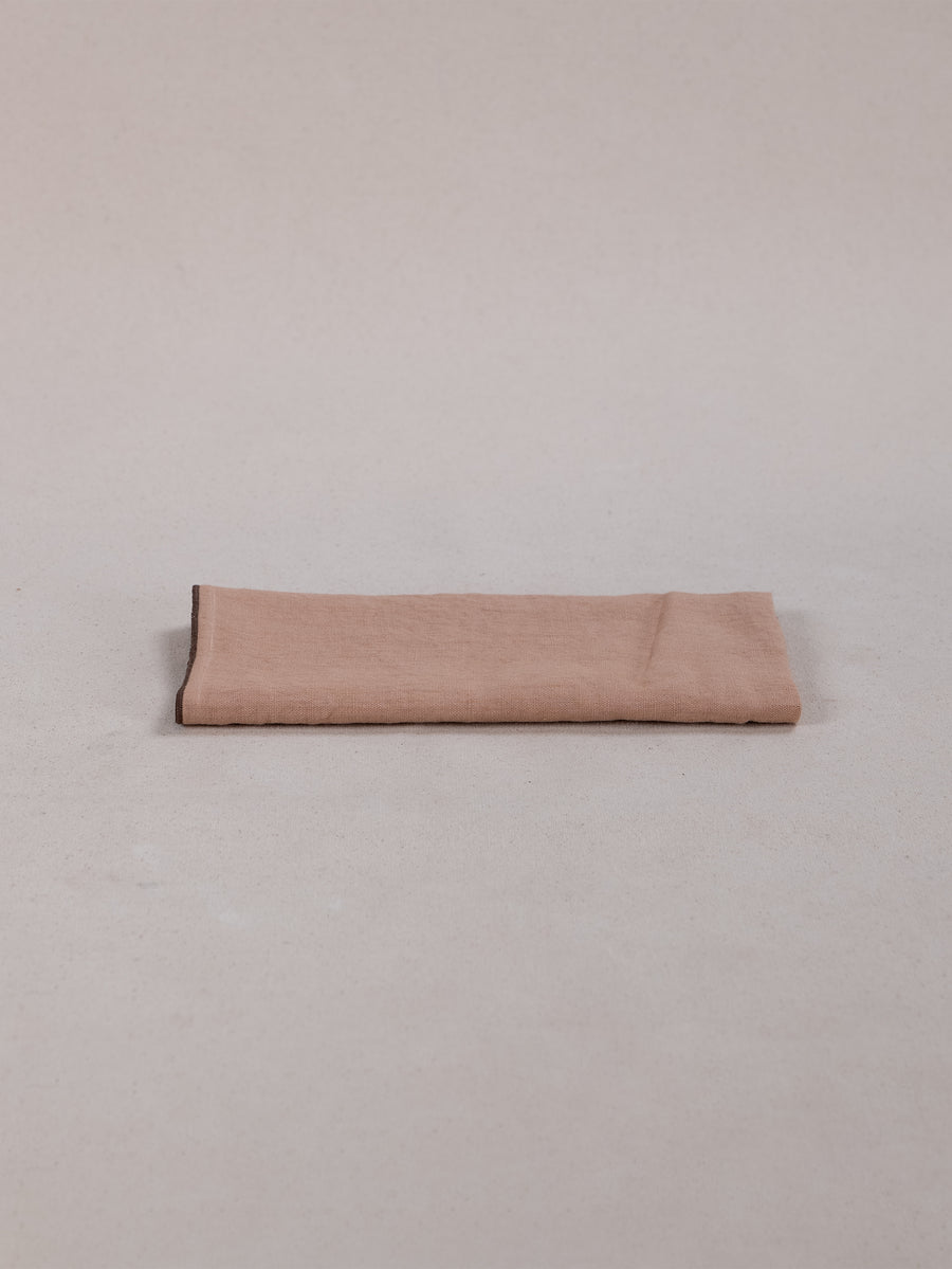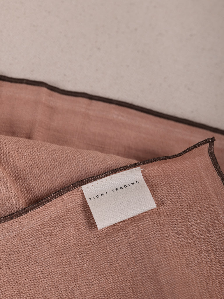 Woven from 100% stonewashed linen, this soft, tactile napkin features a dusty coral base, framed with a chocolate-hued overlocked edge.