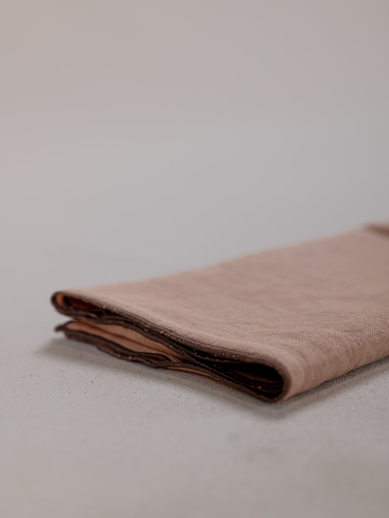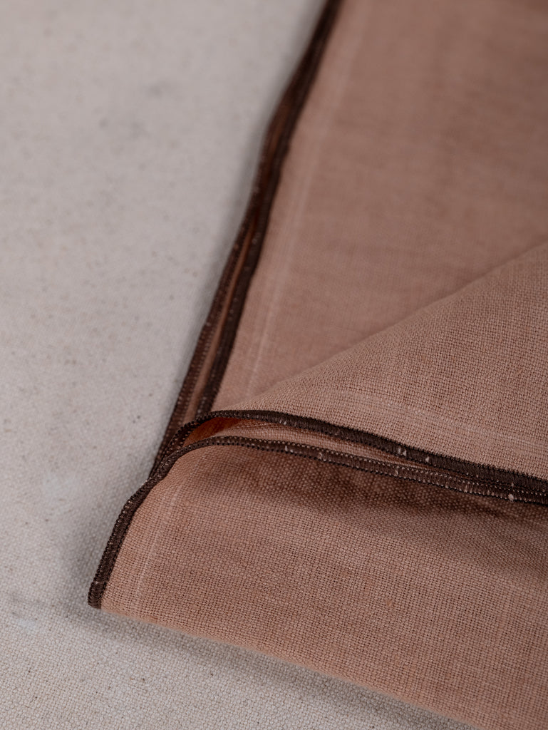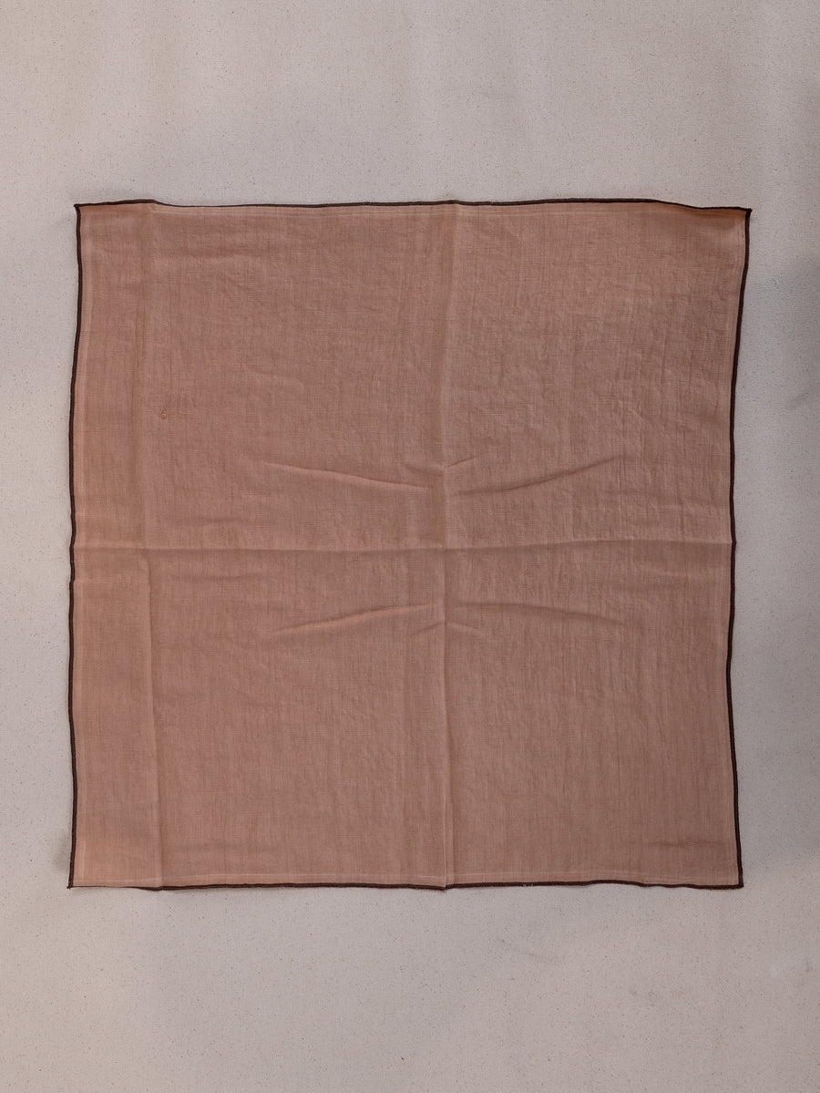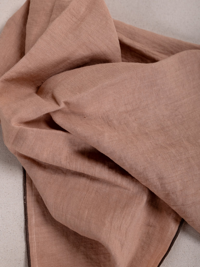 Woven from 100% stonewashed linen, this soft, tactile napkin features a dusty coral base, framed with a chocolate-hued overlocked edge.