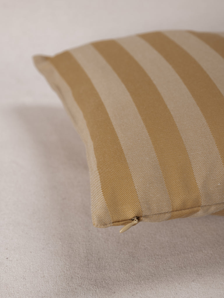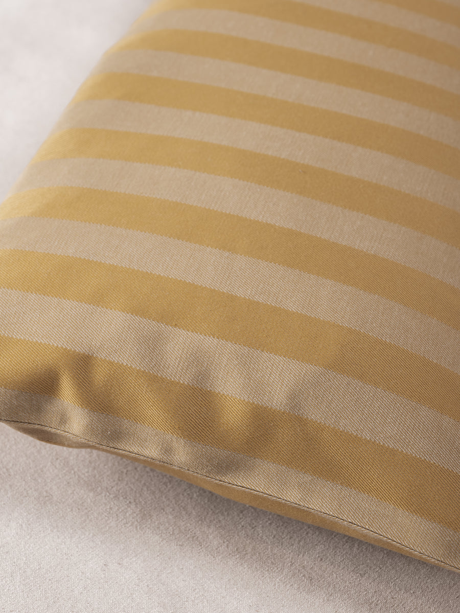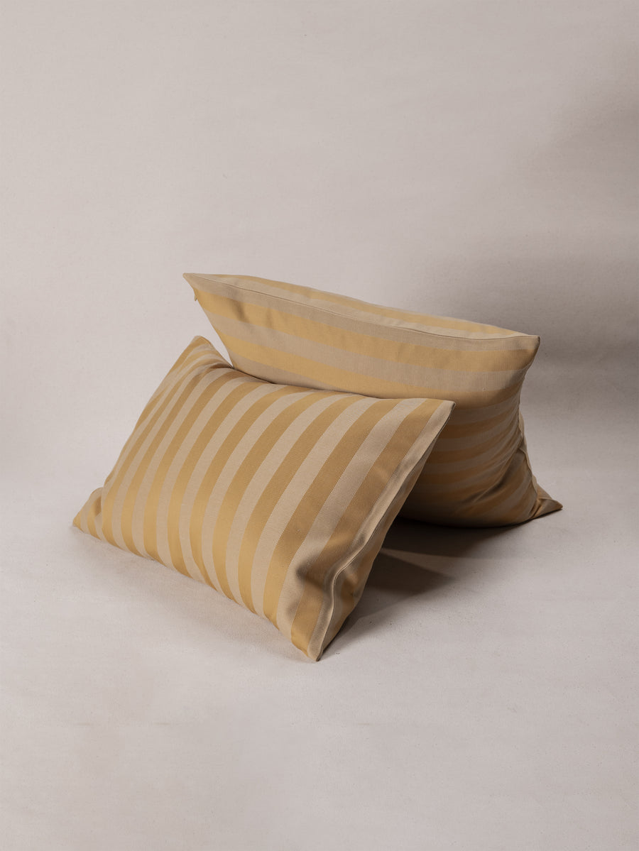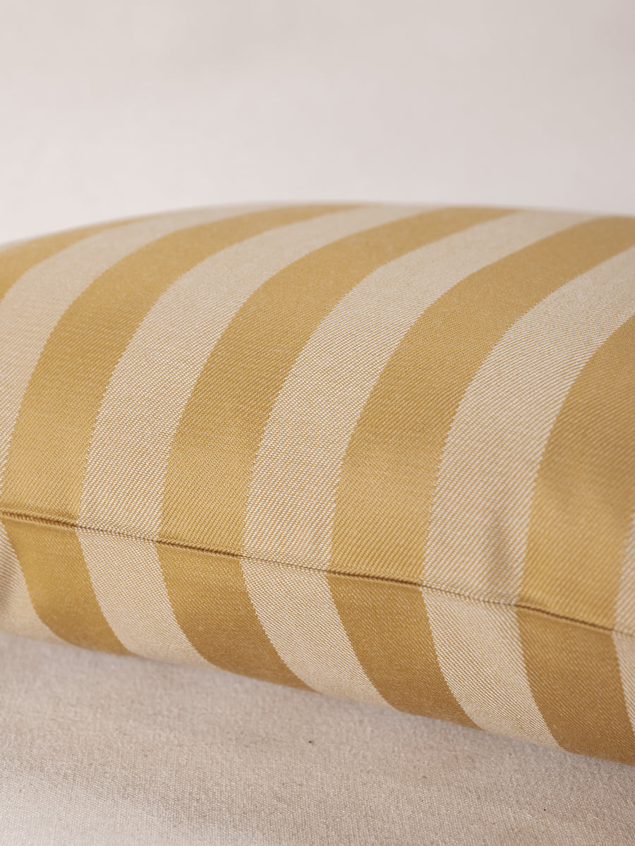 Upholstered in a striped performance fabric, this lumbar cushion balances softness with durability. The subtle stripe offers a layered, tonal texture, both earthy and elevated. Designed to withstand daily living while maintaining its tactile elegance, it’s the perfect accent for both indoor and outdoor spaces. Finished with a feather insert for added comfort.