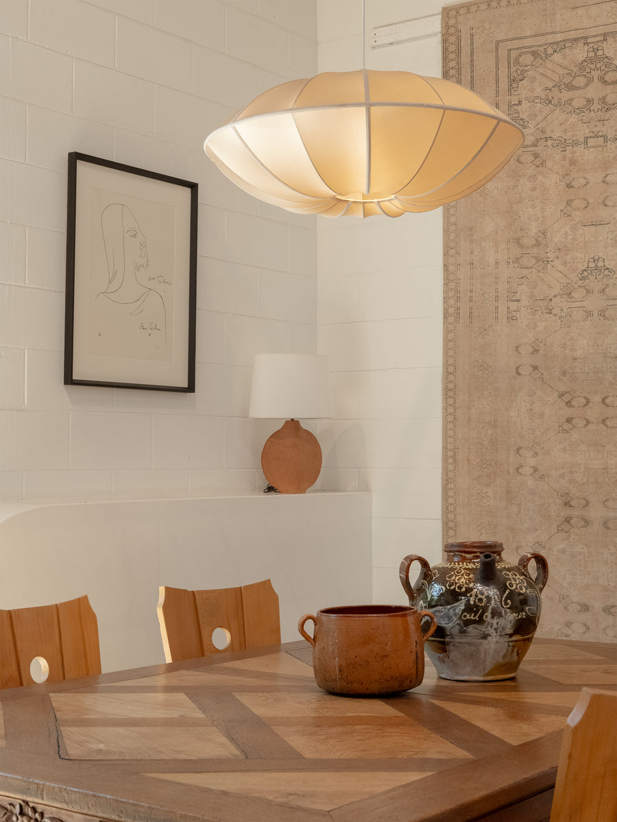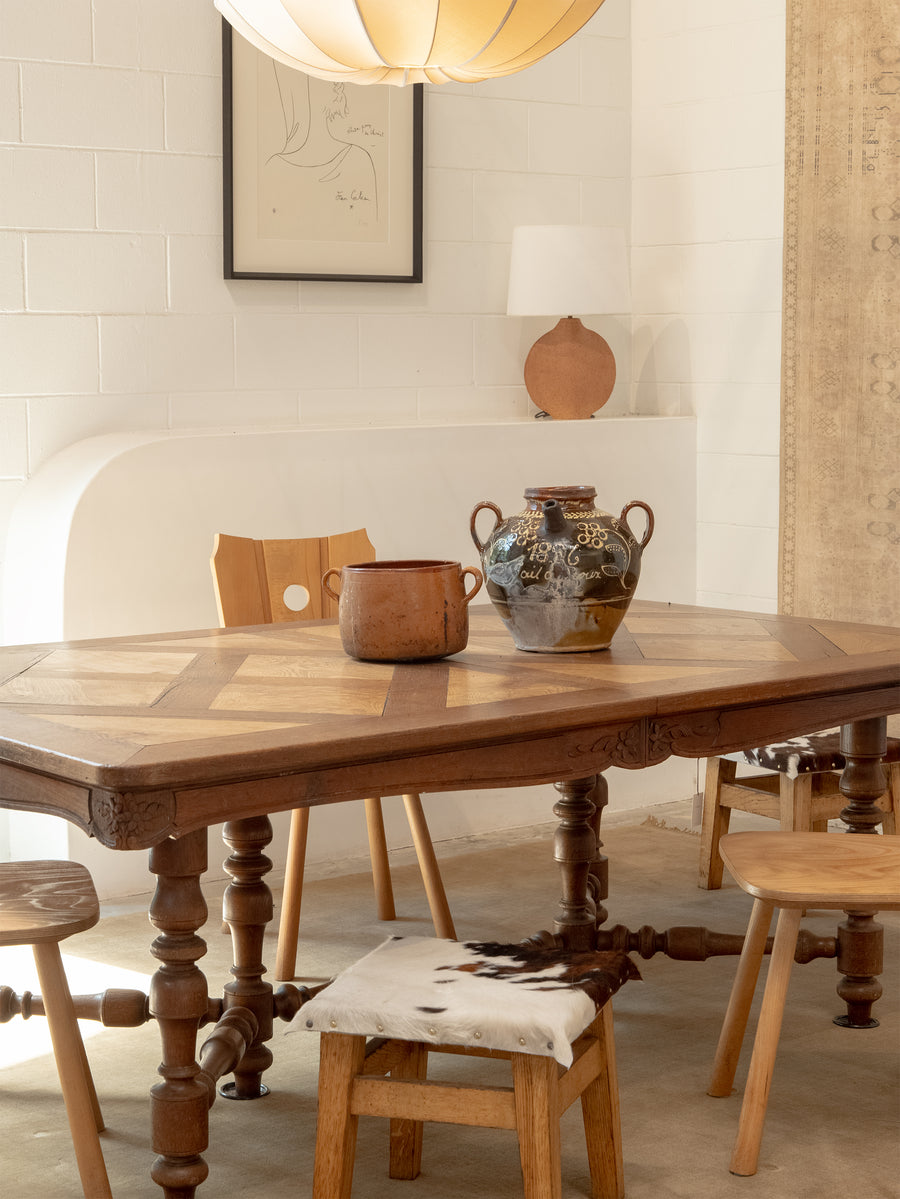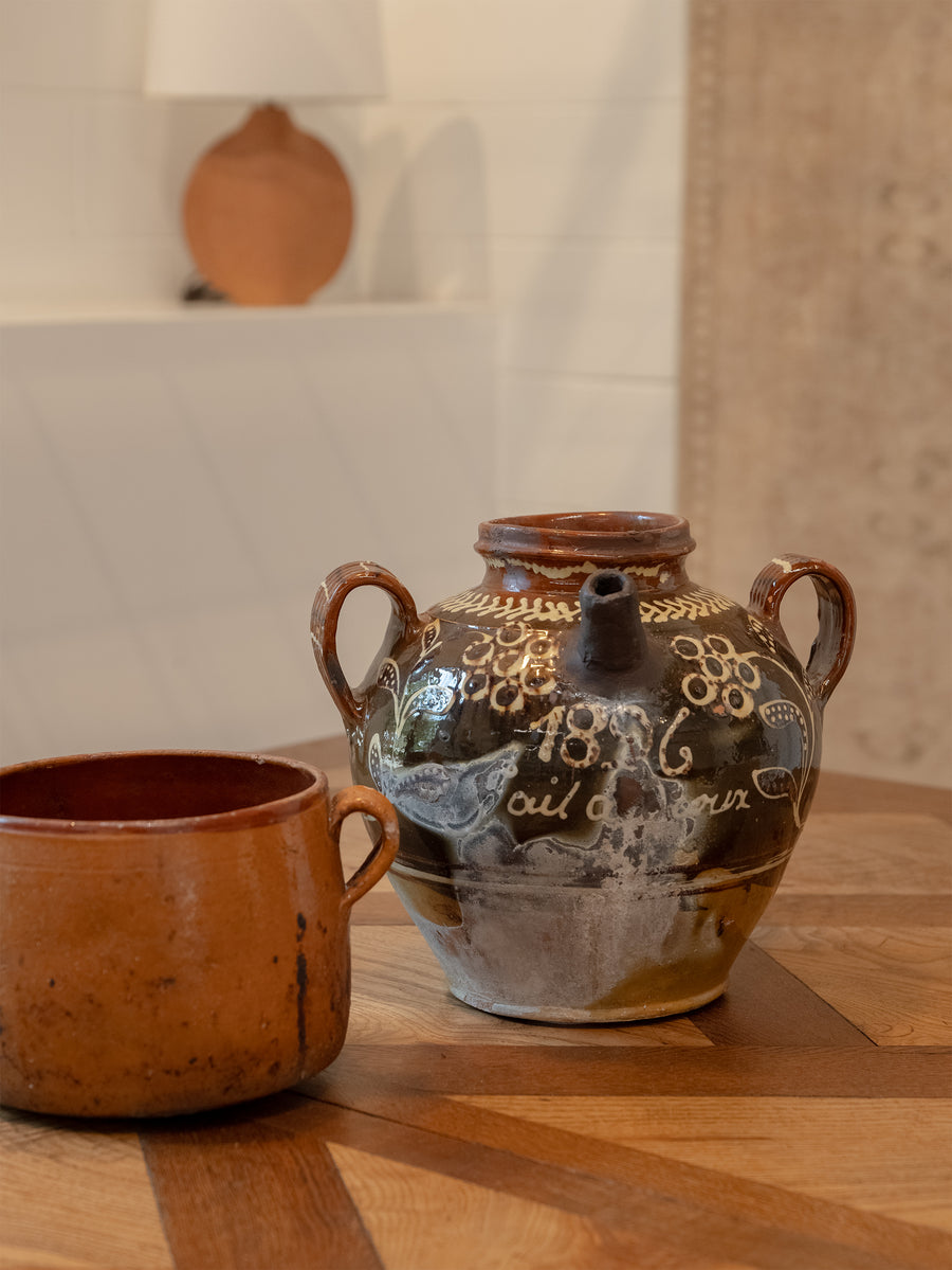 Vintage glazed terracotta pot with a warm, earthy tone and twin side handles. Once a utilitarian vessel, it now serves as a beautiful decorative accent — its simple, rounded form and natural imperfections telling the story of its handmade origin. The glaze has softened over time, revealing a surface rich in character and patina, perfect for adding an element of rustic charm to any interior.