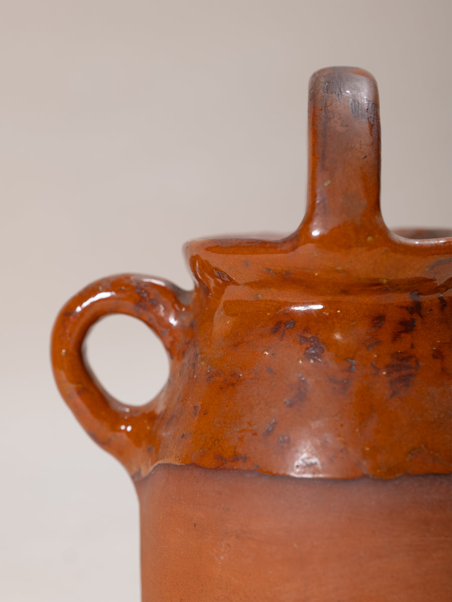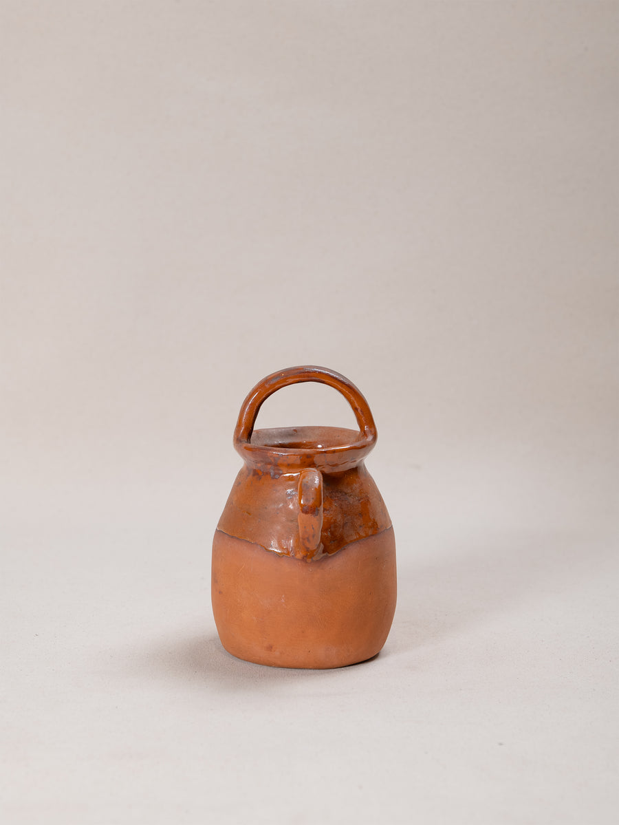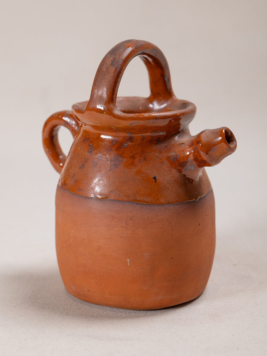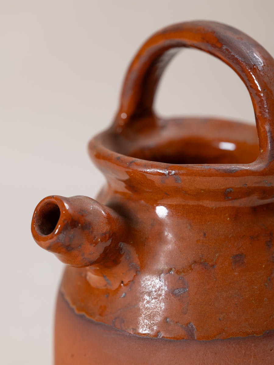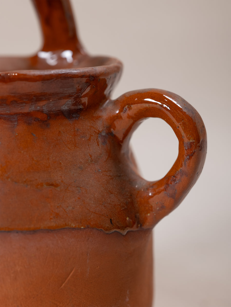 A vintage terracotta vessel with a distinctive sculptural form, defined by its rounded body, loop handle, and angled spout. The earthy clay surface, with its time-worn glaze and irregular markings, reflects the authenticity of traditional handcrafting. Both utilitarian and decorative, this vessel carries the character of age and use, offering a glimpse into the rituals of everyday life.