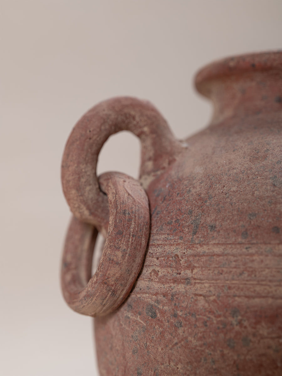 Vintage terracotta vessel with a warm, red-toned finish and softly weathered surface that speaks to its age and handmade origins. Its rounded form is accented by incised banding and sculptural loop handles, giving the piece both balance and decorative presence. Once utilitarian, now a striking object of character, it embodies the enduring beauty of simple, time-worn craftsmanship.
