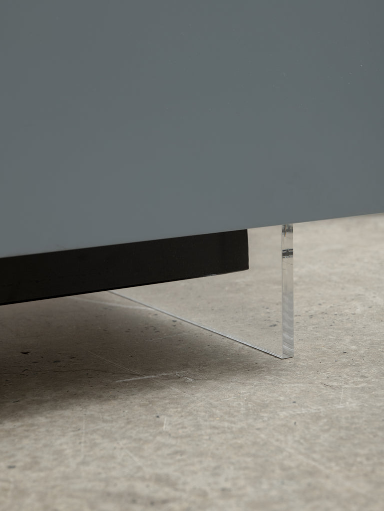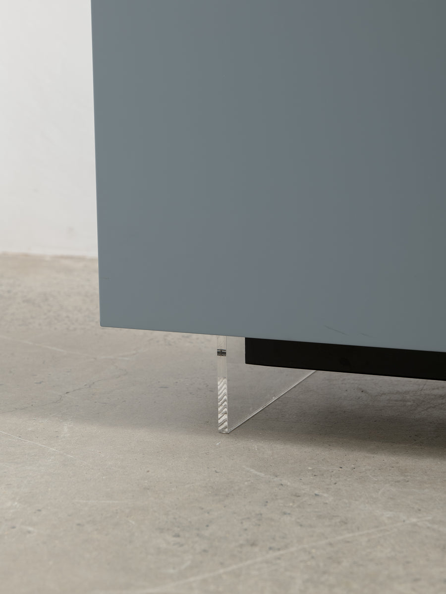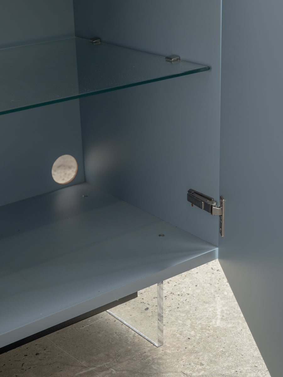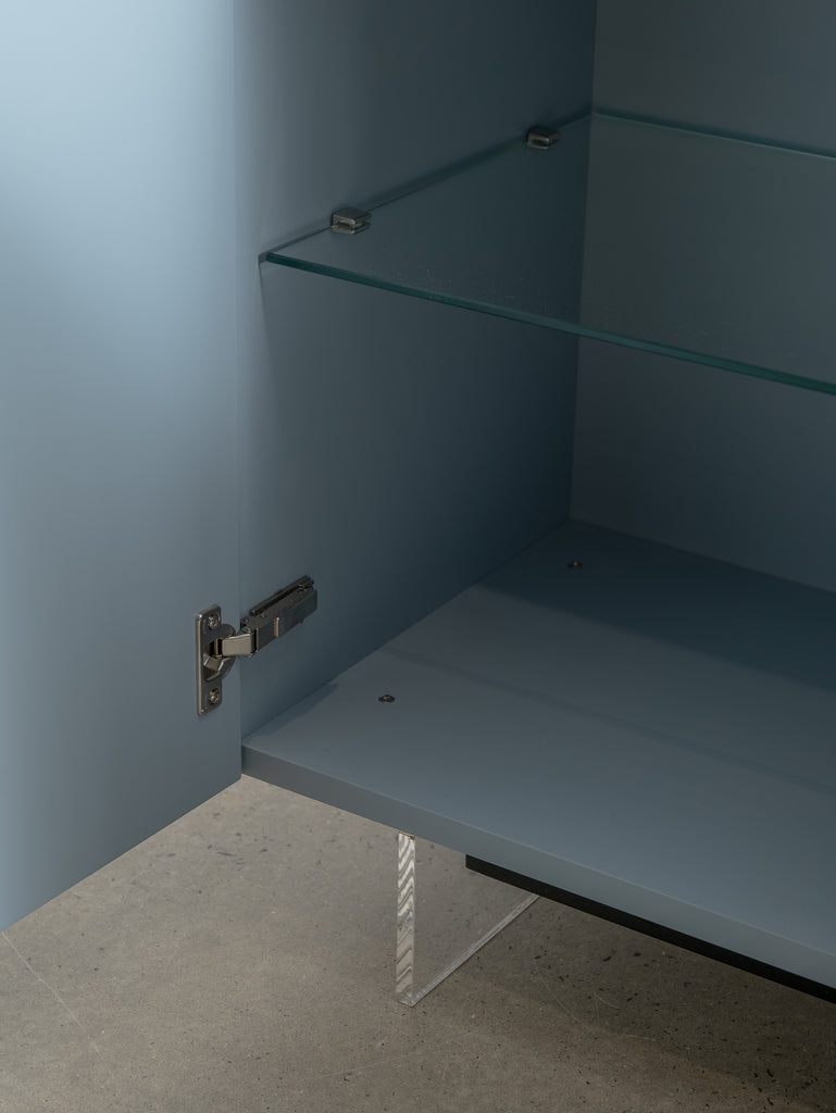 With three spacious doors opening to reveal glass shelves, it offers both functionality and style, allowing light to pass through and elevate the beauty of your curated collection. The transparent plexi feet add a delicate touch, creating the illusion of weightlessness while grounding the piece in subtle luxury.
