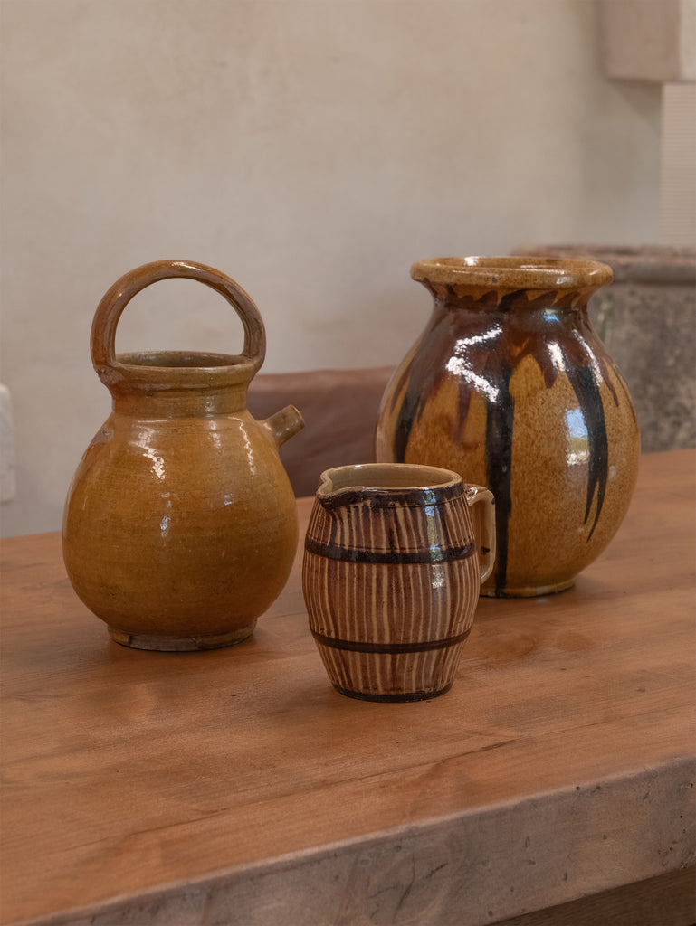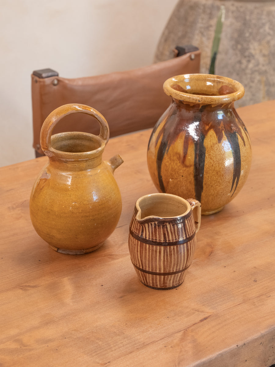 Vintage French terracotta pitcher with a warm golden glaze and a curved handle. Once used in the south of France for pouring water or wine, its form reflects traditional Provençal craftsmanship — both functional and sculptural. The softly aged surface and irregular glaze give it a timeless patina, making it a beautiful decorative accent with rustic charm.
