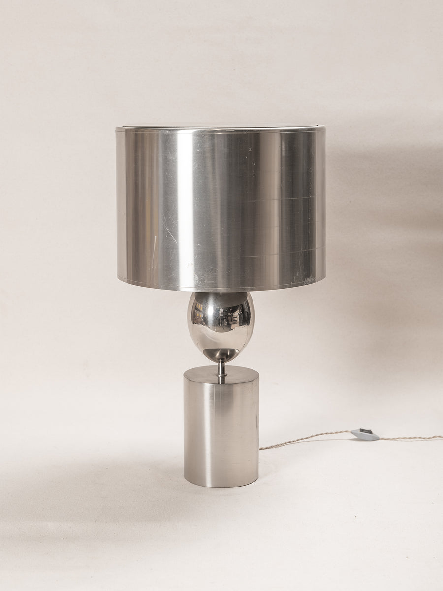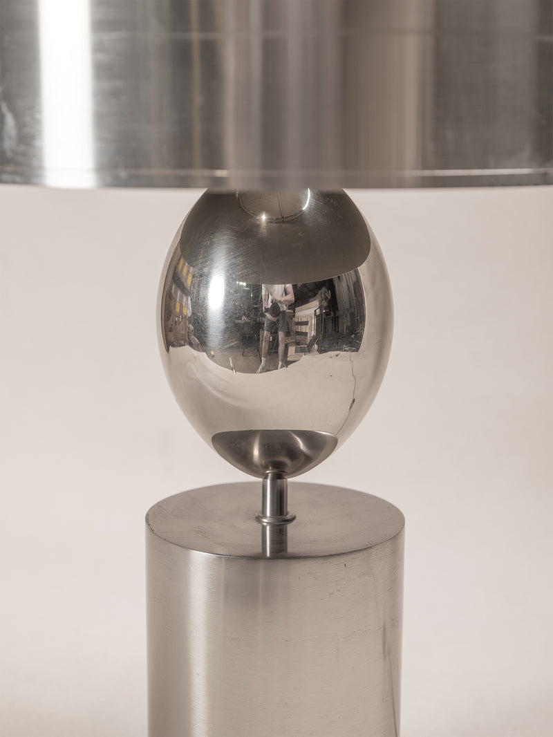 An elegant table lamp attributed to Philippe Barbier, France, 1970s. Featuring a nickel-plated metal base with a sculptural ovoid body and cylindrical shade, this piece reflects the refined geometry and quiet glamour of the era.