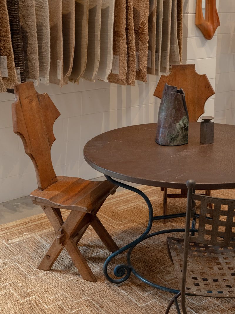 European garden style comes through in this 1950s round metal table, where a richly toned top meets a curving wrought iron base. The sculptural legs, finished in a time-worn blue, end in delicate scrolls that lend a sense of movement and ease. Balanced and enduring, it’s a piece that brings character to both outdoor and indoor settings, celebrated for its vintage patina and mid-century charm. Due to it's vintage nature, the table carries unique marks of age that speak to its decades of use.