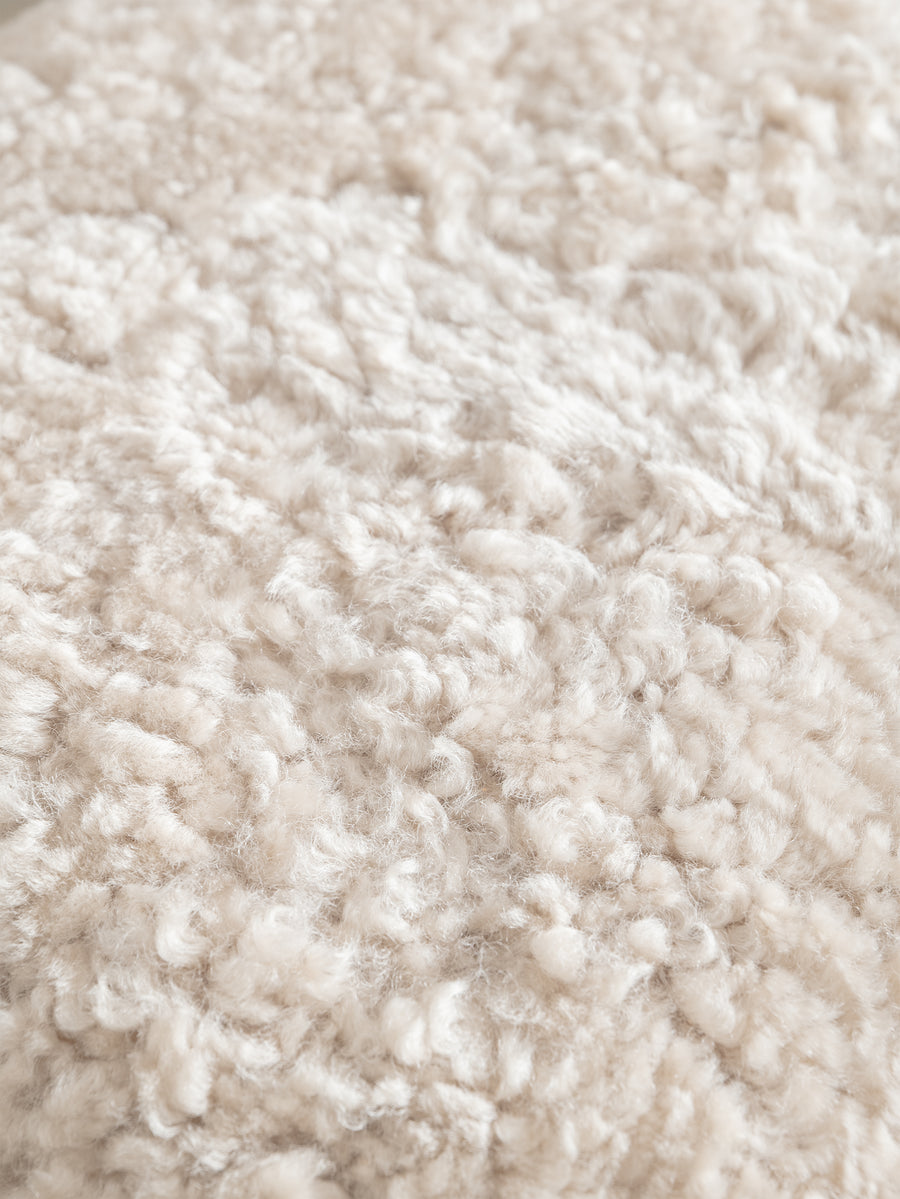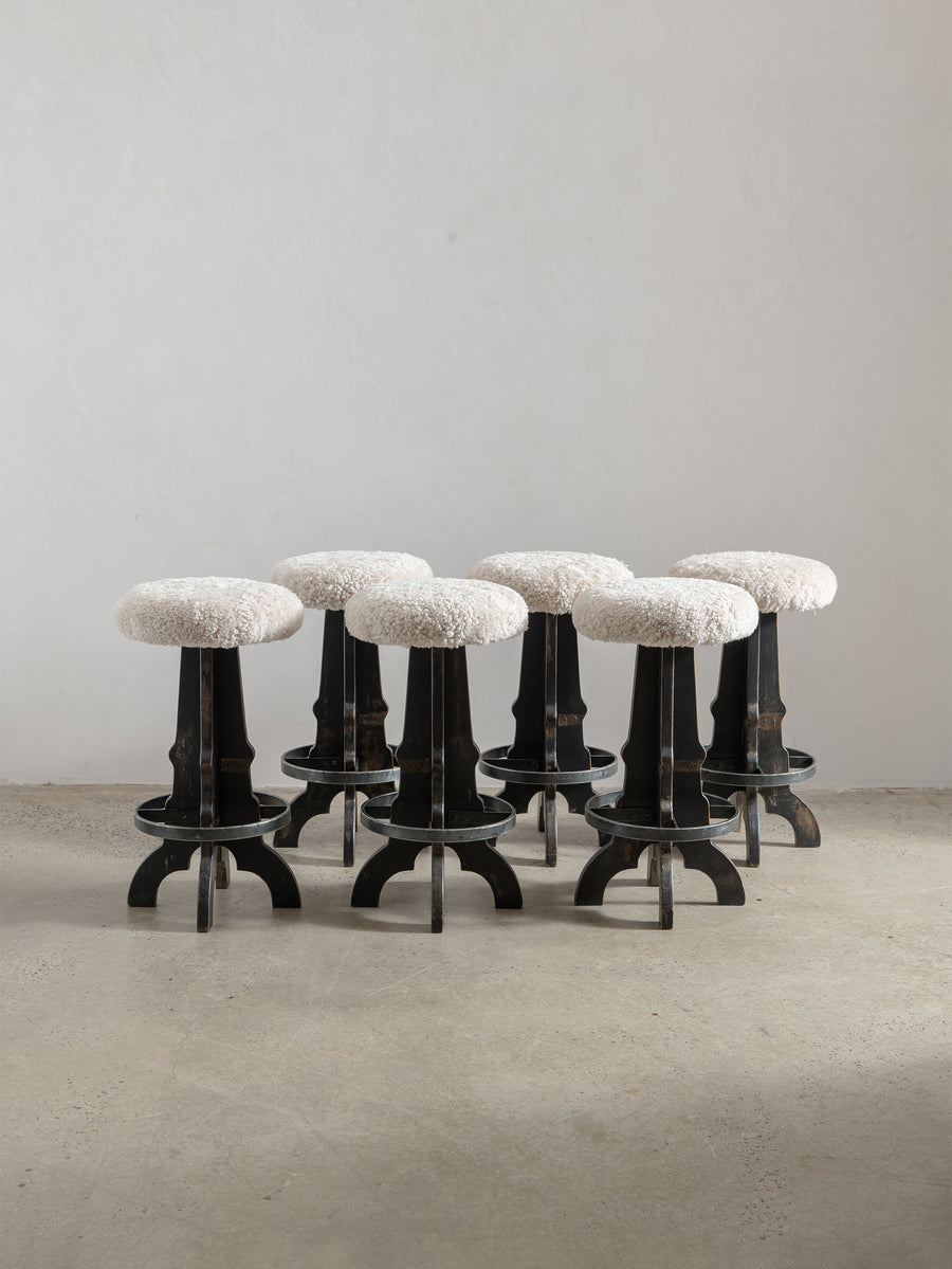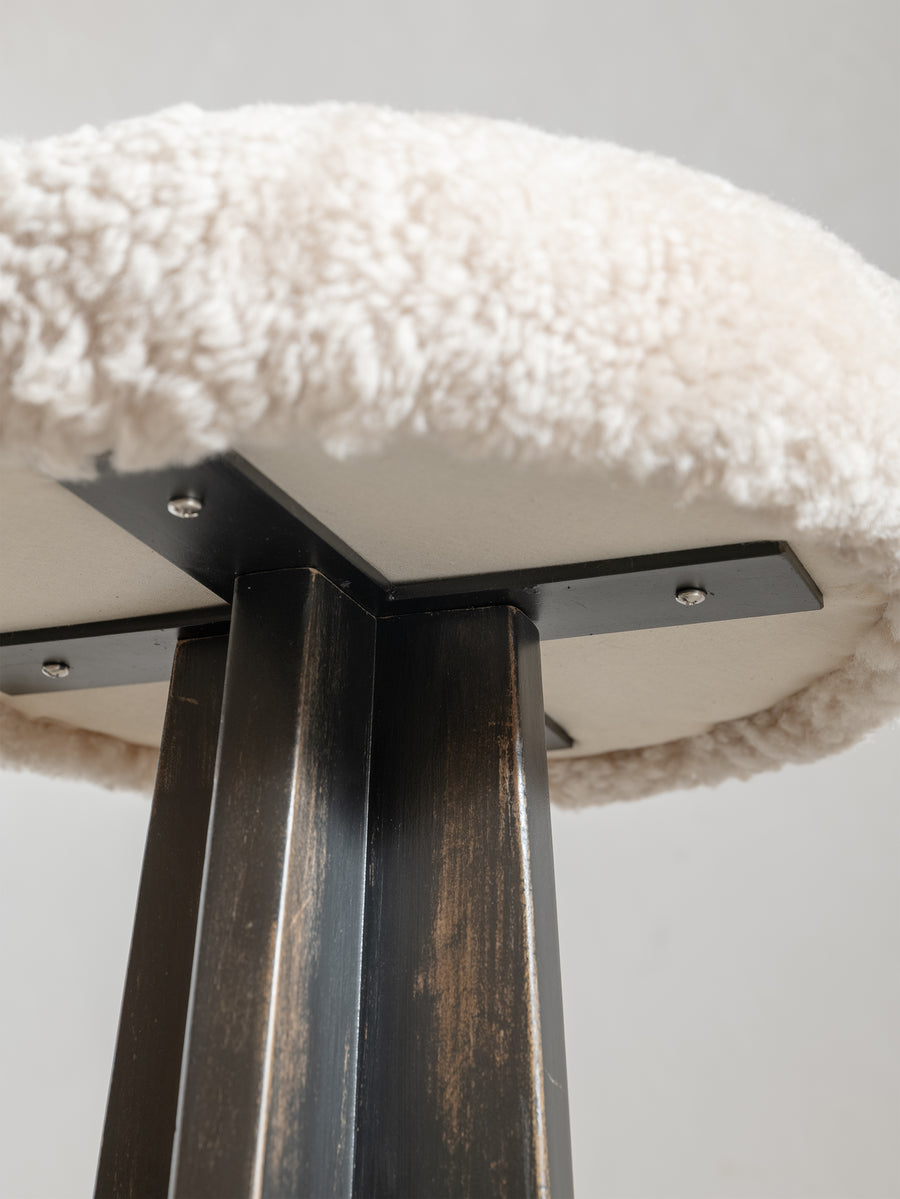 The seat has been carefully reupholstered in plush natural sheepskin, bringing softness and comfort to the silhouette while introducing a rich tactile layer. The interplay between the darkened timber, aged metal, and creamy sheepskin creates a timeless, lived-in feel - equal parts rustic and refined.