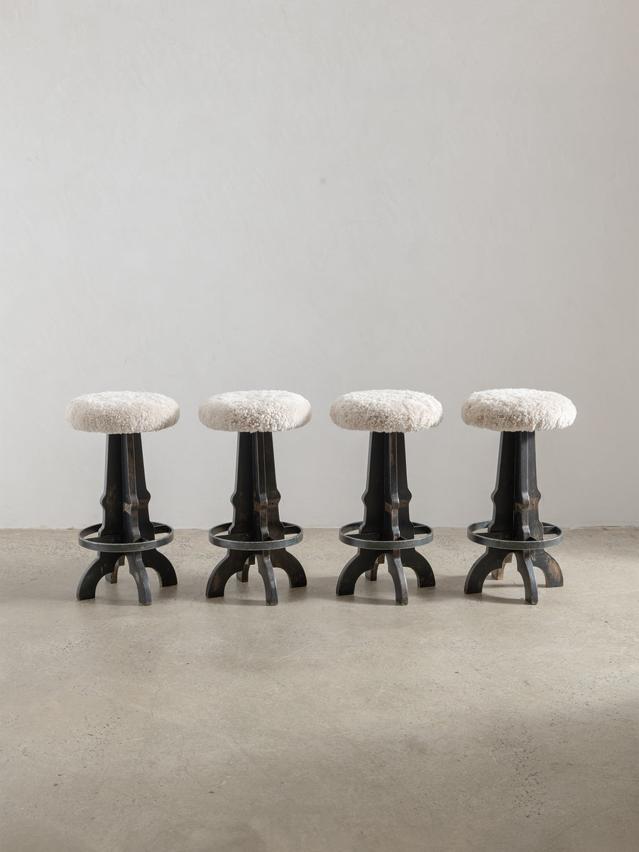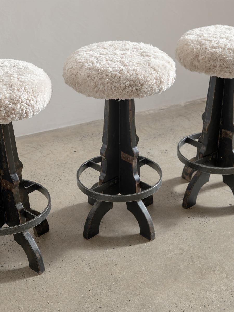 1950s Wooden Stool with Sheepskin Seat