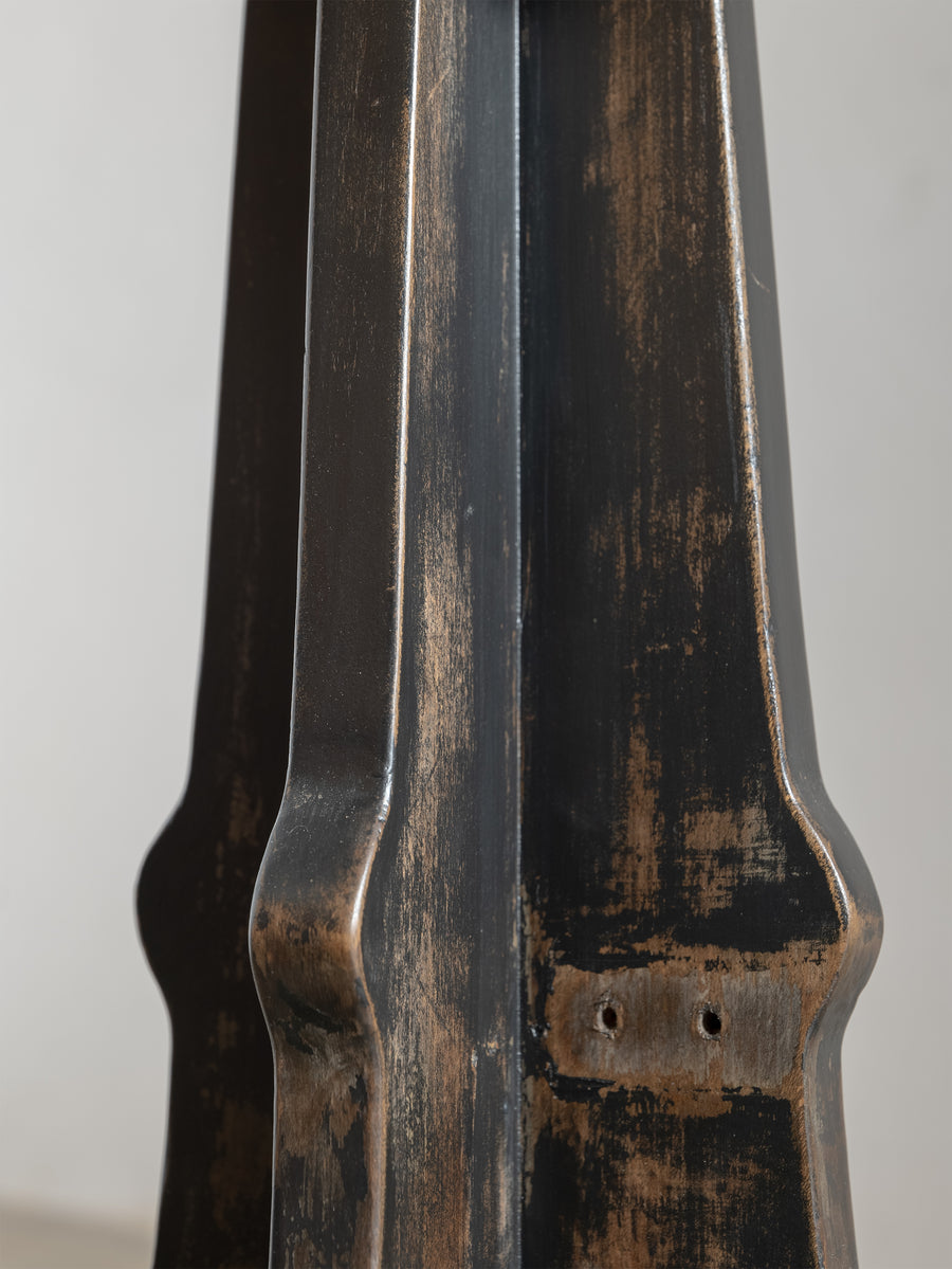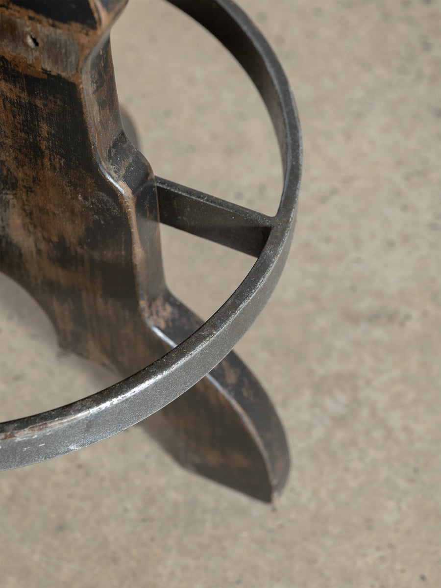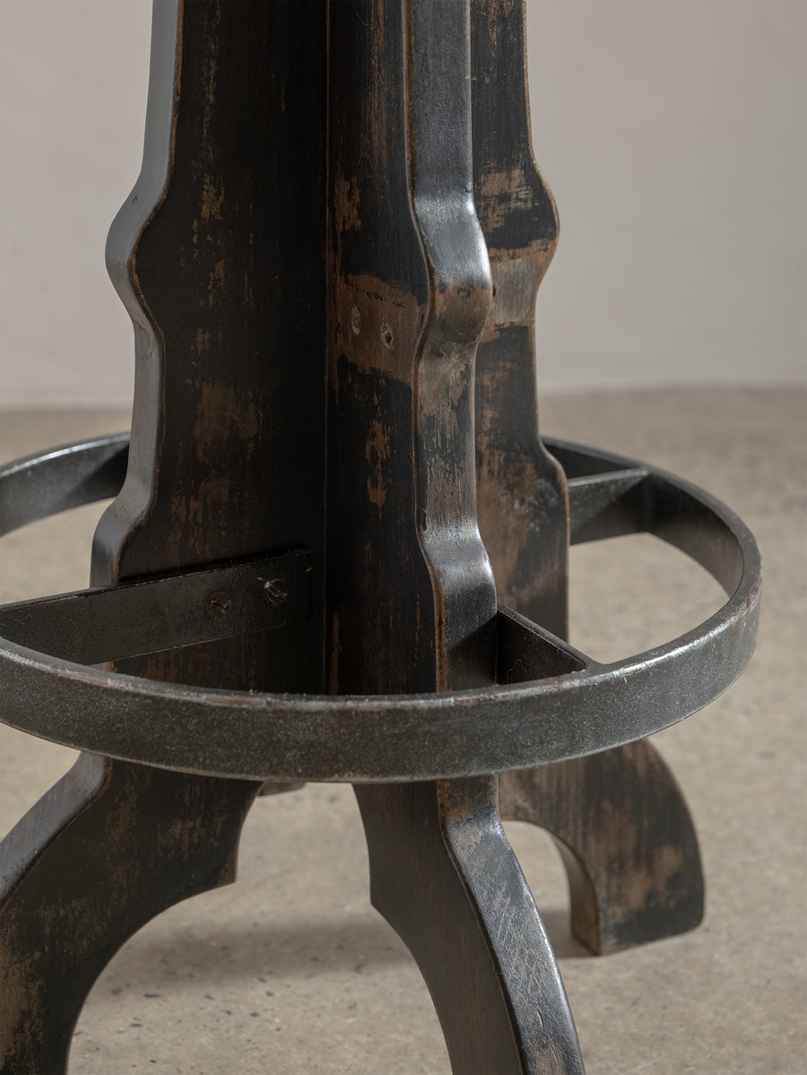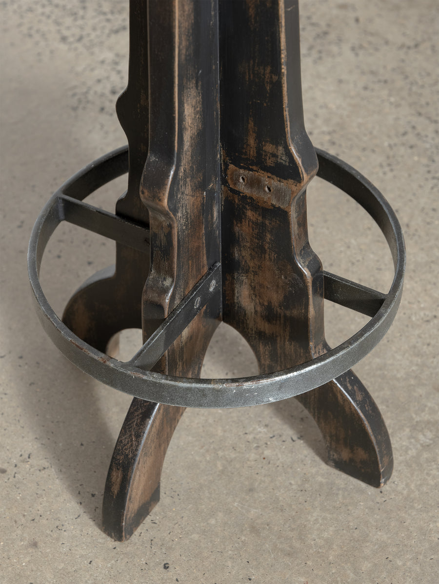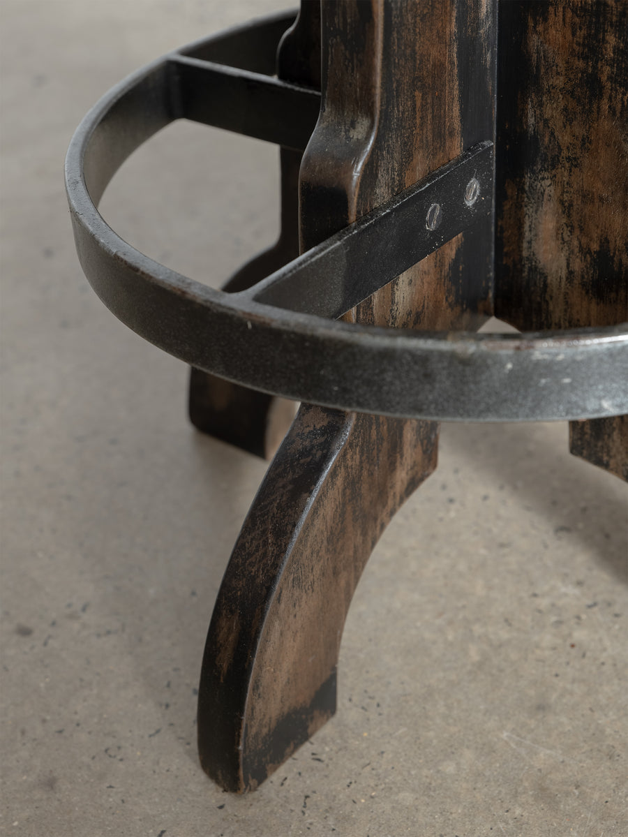 A beautifully grounded stool that balances warmth, texture, and honest materials. This piece features a solid wooden base with sculptural lines and timeworn character, anchored by a circular metal footrest that adds both function and contrast.
