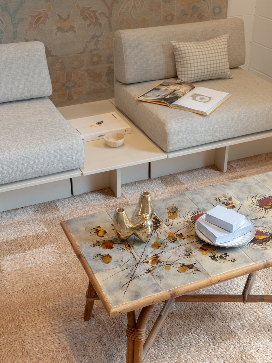 Signed piece by Audoux-Minet and Georges Chassin. This rattan coffee table is defined by its light bamboo frame and ceramic tiled top, a composition that reflects the designers’ affinity for natural materials and artisanal craft. The handwoven cane structure lends warmth and texture, while the decorative tile surface introduces a refined graphic quality. Both practical and sculptural, this work embodies the enduring spirit of French mid-century design.