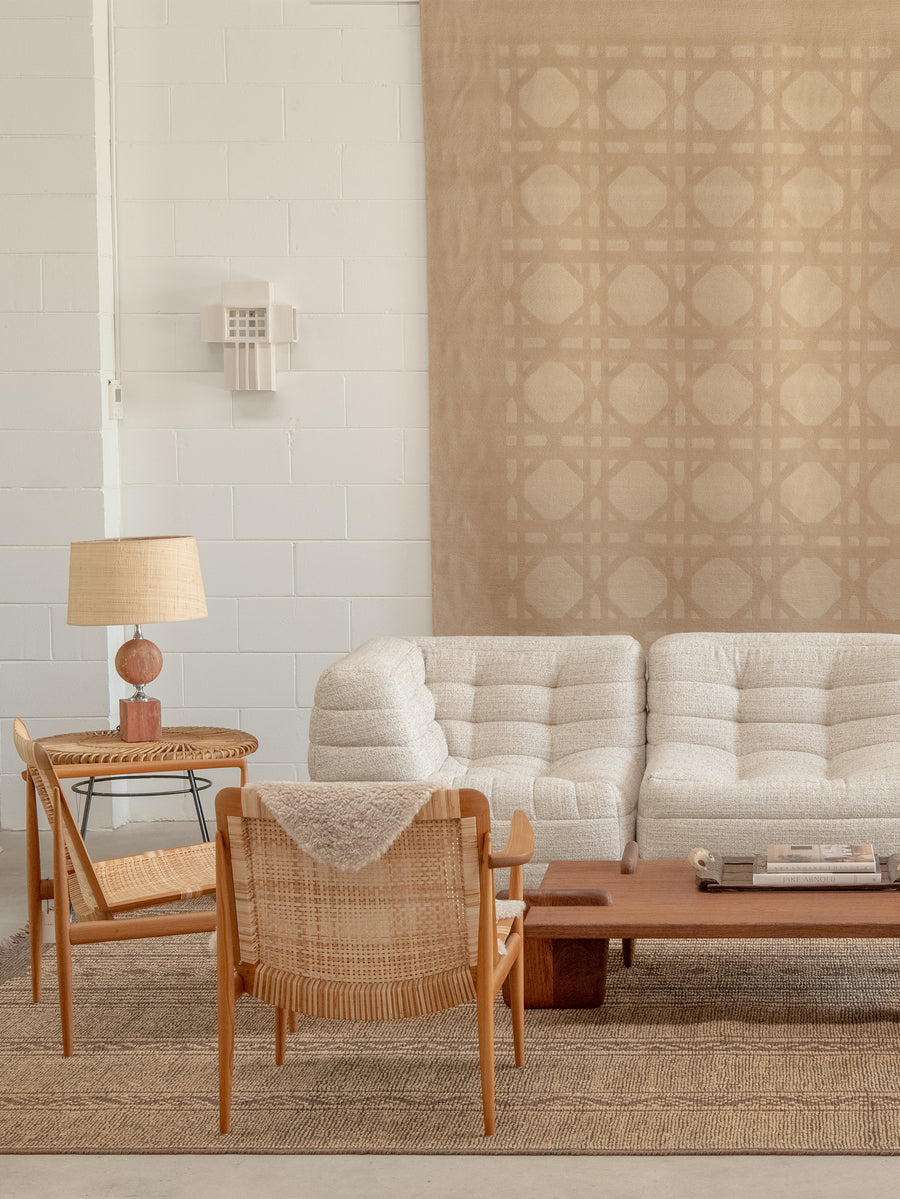 Its natural stone surface reveals soft tonal variations in blush and sand, while the woven shade diffuses a warm, ambient glow - an elegant interplay between organic materiality and geometric form.
