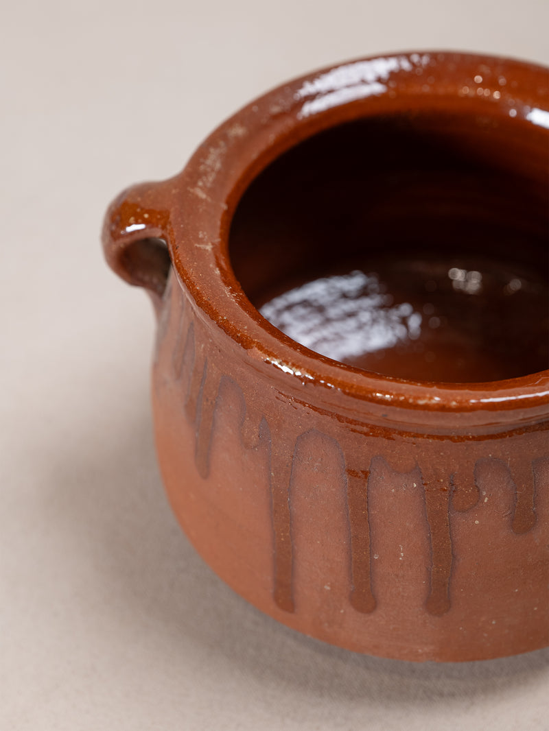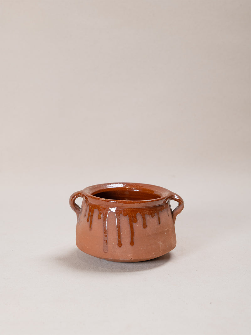 A vintage terracotta pot with a simple, rounded form and twin loop handles. Its warm clay body is finished with a rich glaze that drips organically down the rim, highlighting the handmade character of the piece. Both rustic and sculptural, this vessel evokes the utilitarian beauty of traditional pottery, where form meets function.