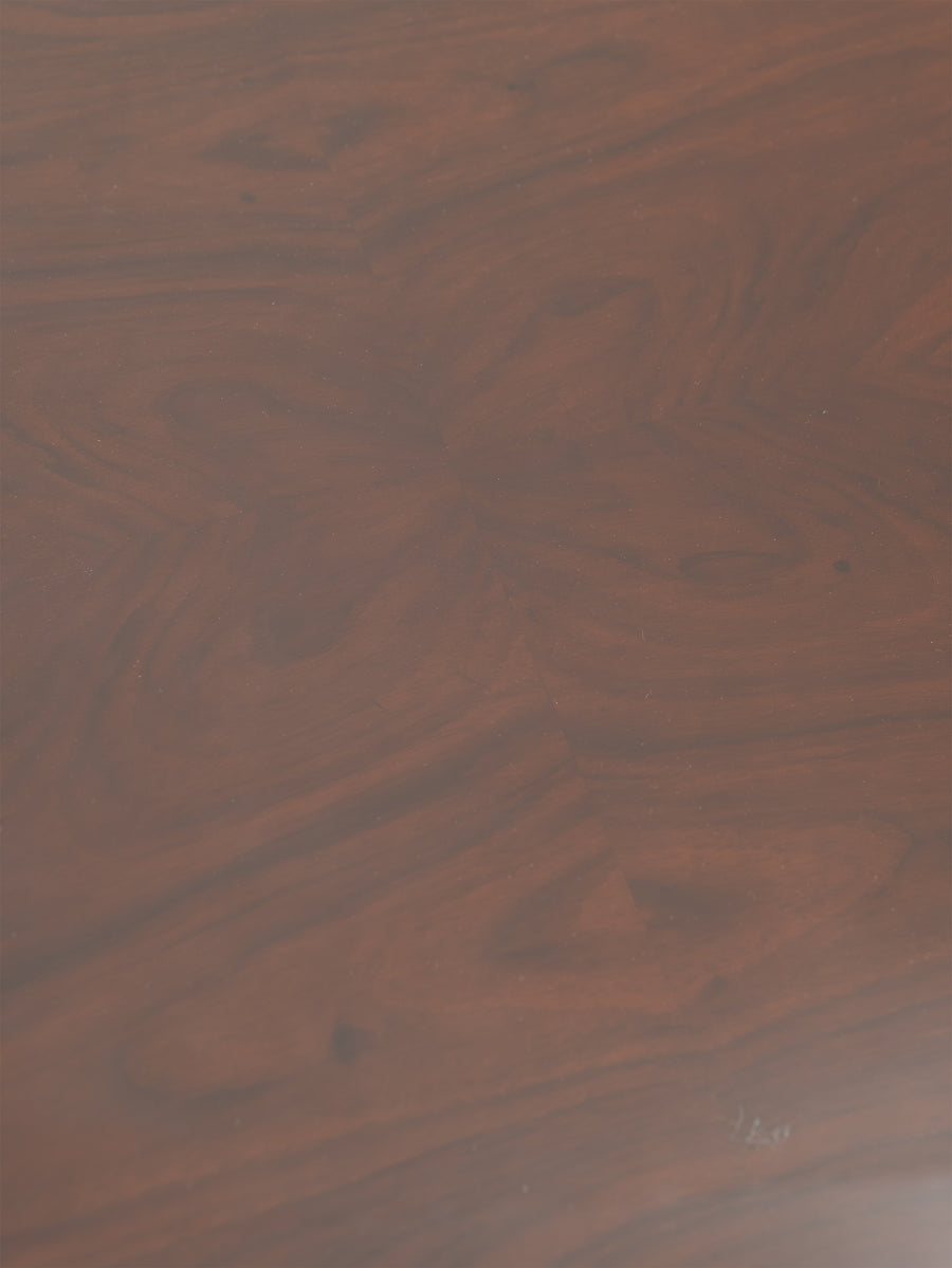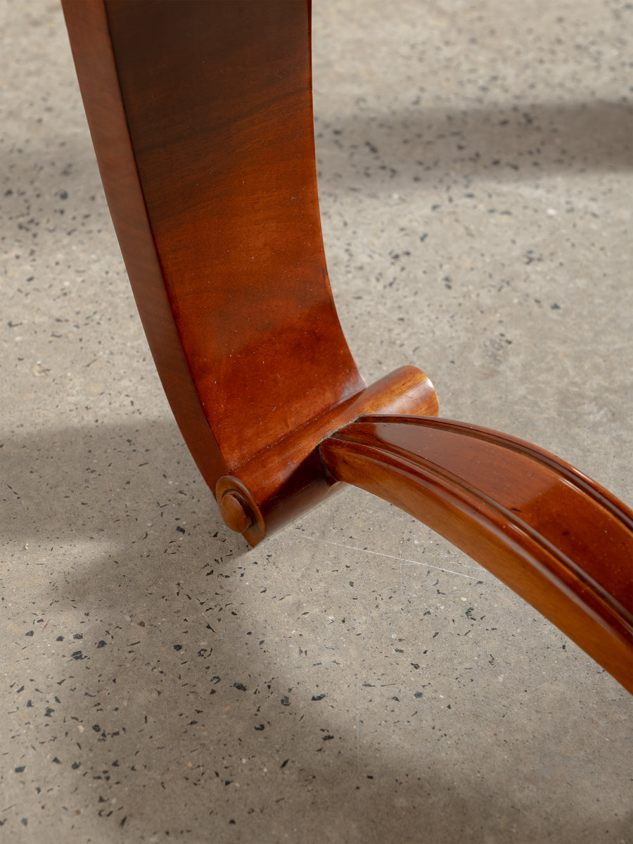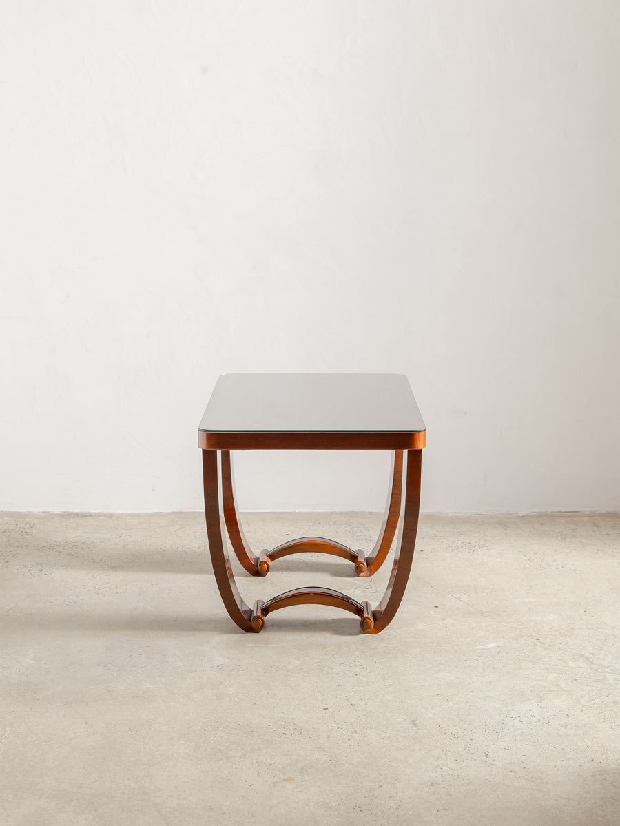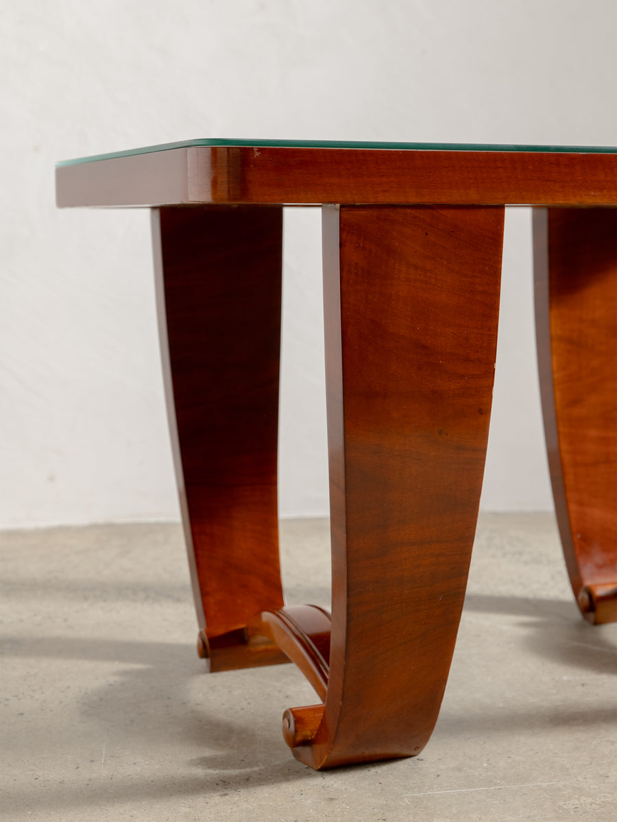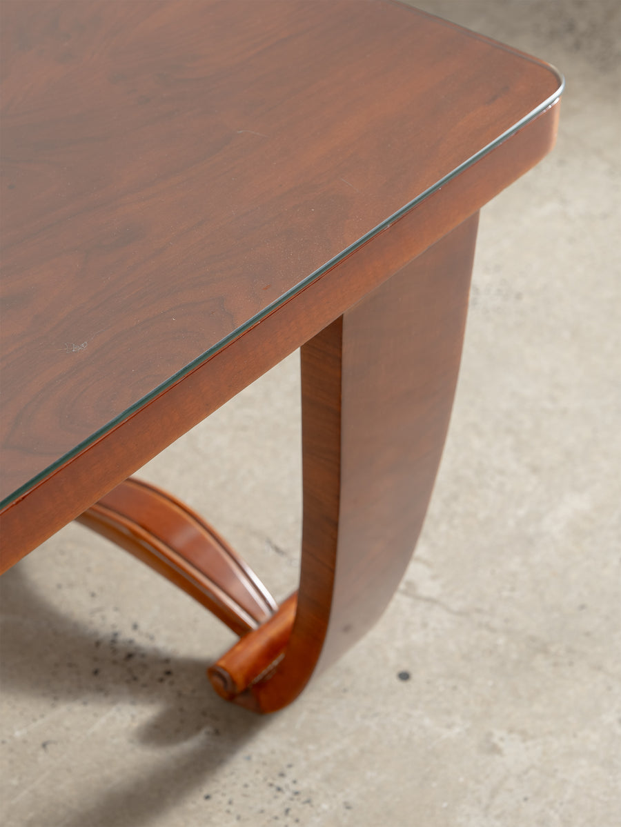 A refined 1930s Art Deco table in beautifully figured rosewood, defined by its balanced proportions and sculptural base. The design is characterised by broad, curved supports and trestle-style ends, giving the piece a strong architectural presence while maintaining a sense of lightness.