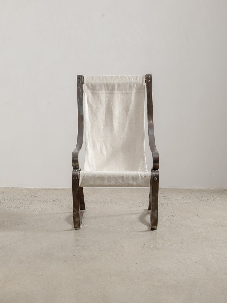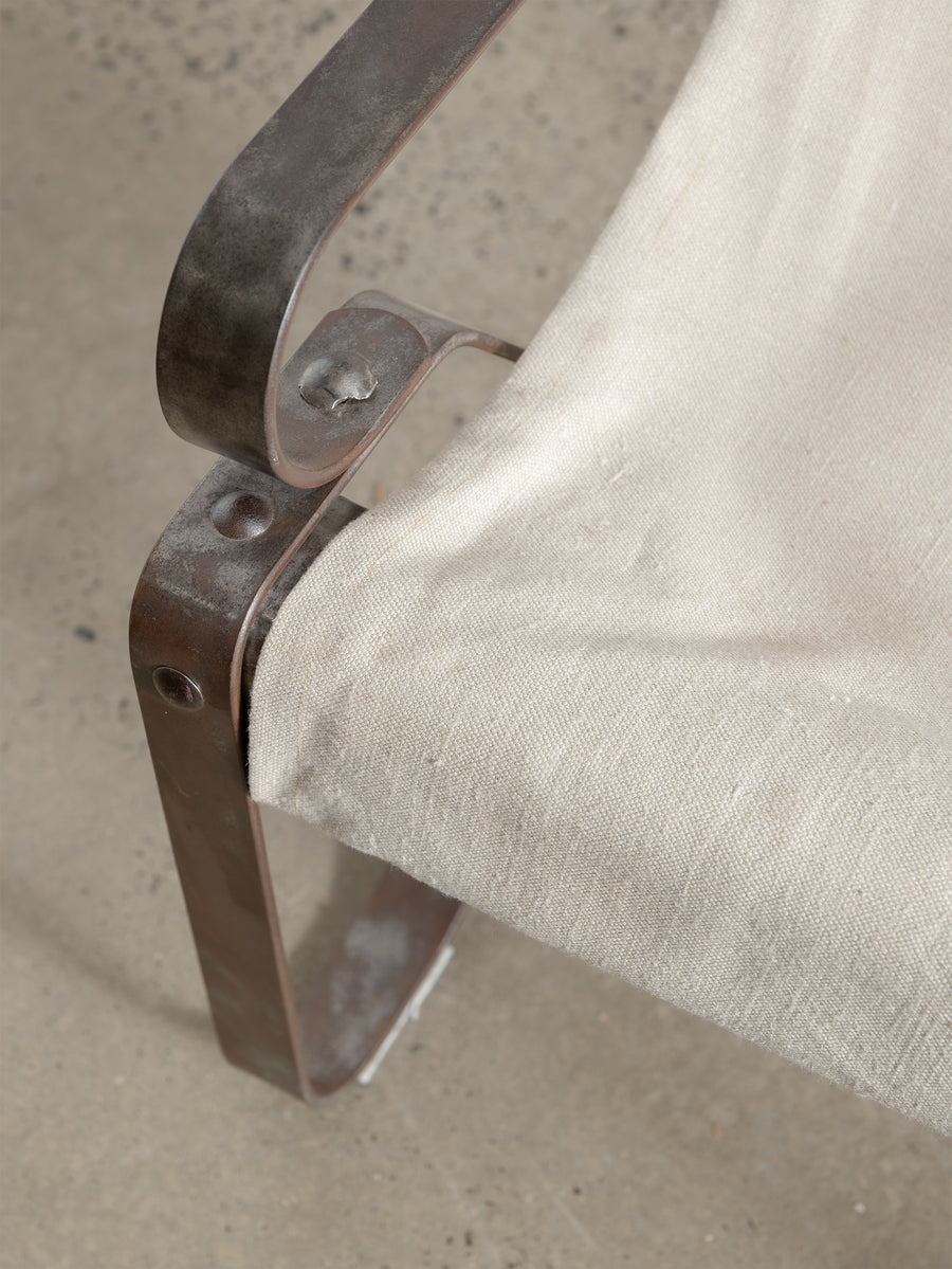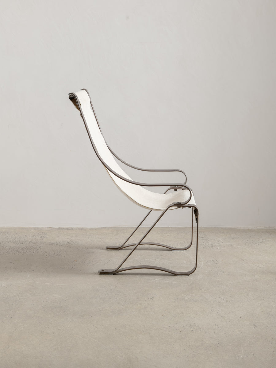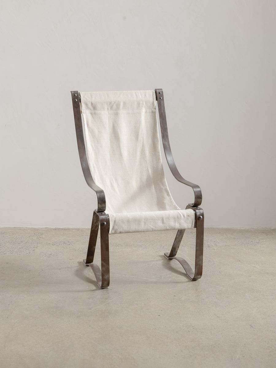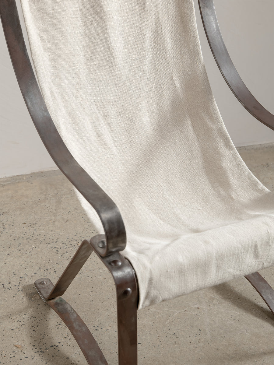 A rare 1930s sling back chair by Italian designer Salvatore Bevelaqua, showcasing the refined minimalism of early modernist design. Its sculptural metal frame supports a simple linen sling, creating a piece that is both utilitarian and elegant. The gentle curve of the frame adds rhythm and ease, while the raw patina of the metal contrasts beautifully with the natural textile. A timeless expression of form and function, this chair reflects Bevelaqua’s considered approach to proportion and material. Each chair carries unique variations in surface and finish, celebrating its handmade and historic character.